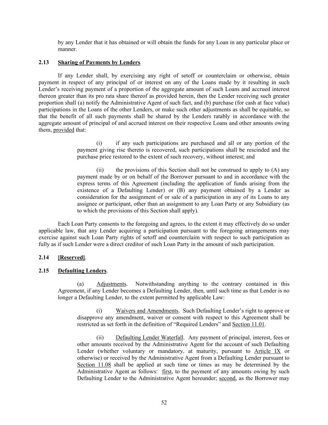 52 by any Lender that it has obtained or will obtain the funds for any Loan in any particular place or manner. 2.13 Sharing of Payments by Lenders. If any Lender shall, by exercising any right of setoff or counterclaim or otherwise, obtain payment in respect of any principal of or interest on any of the Loans made by it resulting in such Lender’s receiving payment of a proportion of the aggregate amount of such Loans and accrued interest thereon greater than its pro rata share thereof as provided herein, then the Lender receiving such greater proportion shall (a) notify the Administrative Agent of such fact, and (b) purchase (for cash at face value) participations in the Loans of the other Lenders, or make such other adjustments as shall be equitable, so that the benefit of all such payments shall be shared by the Lenders ratably in accordance with the aggregate amount of principal of and accrued interest on their respective Loans and other amounts owing them, provided that: (i) if any such participations are purchased and all or any portion of the payment giving rise thereto is recovered, such participations shall be rescinded and the purchase price restored to the extent of such recovery, without interest; and (ii) the provisions of this Section shall not be construed to apply to (A) any payment made by or on behalf of the Borrower pursuant to and in accordance with the express terms of this Agreement (including the application of funds arising from the existence of a Defaulting Lender) or (B) any payment obtained by a Lender as consideration for the assignment of or sale of a participation in any of its Loans to any assignee or participant, other than an assignment to any Loan Party or any Subsidiary (as to which the provisions of this Section shall apply). Each Loan Party consents to the foregoing and agrees, to the extent it may effectively do so under applicable law, that any Lender acquiring a participation pursuant to the foregoing arrangements may exercise against such Loan Party rights of setoff and counterclaim with respect to such participation as fully as if such Lender were a direct creditor of such Loan Party in the amount of such participation. 2.14 [Reserved]. 2.15 Defaulting Lenders. (a) Adjustments. Notwithstanding anything to the contrary contained in this Agreement, if any Lender becomes a Defaulting Lender, then, until such time as that Lender is no longer a Defaulting Lender, to the extent permitted by applicable Law: (i) Waivers and Amendments. Such Defaulting Lender’s right to approve or disapprove any amendment, waiver or consent with respect to this Agreement shall be restricted as set forth in the definition of “Required Lenders” and Section 11.01. (ii) Defaulting Lender Waterfall. Any payment of principal, interest, fees or other amounts received by the Administrative Agent for the account of such Defaulting Lender (whether voluntary or mandatory, at maturity, pursuant to Article IX or otherwise) or received by the Administrative Agent from a Defaulting Lender pursuant to Section 11.08 shall be applied at such time or times as may be determined by the Administrative Agent as follows: first, to the payment of any amounts owing by such Defaulting Lender to the Administrative Agent hereunder; second, as the Borrower may