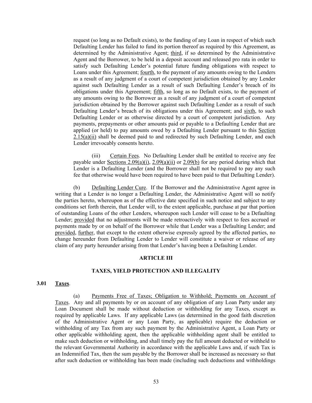 53 request (so long as no Default exists), to the funding of any Loan in respect of which such Defaulting Lender has failed to fund its portion thereof as required by this Agreement, as determined by the Administrative Agent; third, if so determined by the Administrative Agent and the Borrower, to be held in a deposit account and released pro rata in order to satisfy such Defaulting Lender’s potential future funding obligations with respect to Loans under this Agreement; fourth, to the payment of any amounts owing to the Lenders as a result of any judgment of a court of competent jurisdiction obtained by any Lender against such Defaulting Lender as a result of such Defaulting Lender’s breach of its obligations under this Agreement; fifth, so long as no Default exists, to the payment of any amounts owing to the Borrower as a result of any judgment of a court of competent jurisdiction obtained by the Borrower against such Defaulting Lender as a result of such Defaulting Lender’s breach of its obligations under this Agreement; and sixth, to such Defaulting Lender or as otherwise directed by a court of competent jurisdiction. Any payments, prepayments or other amounts paid or payable to a Defaulting Lender that are applied (or held) to pay amounts owed by a Defaulting Lender pursuant to this Section 2.15(a)(ii) shall be deemed paid to and redirected by such Defaulting Lender, and each Lender irrevocably consents hereto. (iii) Certain Fees. No Defaulting Lender shall be entitled to receive any fee payable under Sections 2.09(a)(i), 2.09(a)(ii) or 2.09(b) for any period during which that Lender is a Defaulting Lender (and the Borrower shall not be required to pay any such fee that otherwise would have been required to have been paid to that Defaulting Lender). (b) Defaulting Lender Cure. If the Borrower and the Administrative Agent agree in writing that a Lender is no longer a Defaulting Lender, the Administrative Agent will so notify the parties hereto, whereupon as of the effective date specified in such notice and subject to any conditions set forth therein, that Lender will, to the extent applicable, purchase at par that portion of outstanding Loans of the other Lenders, whereupon such Lender will cease to be a Defaulting Lender; provided that no adjustments will be made retroactively with respect to fees accrued or payments made by or on behalf of the Borrower while that Lender was a Defaulting Lender; and provided, further, that except to the extent otherwise expressly agreed by the affected parties, no change hereunder from Defaulting Lender to Lender will constitute a waiver or release of any claim of any party hereunder arising from that Lender’s having been a Defaulting Lender. ARTICLE III TAXES, YIELD PROTECTION AND ILLEGALITY 3.01 Taxes. (a) Payments Free of Taxes; Obligation to Withhold; Payments on Account of Taxes. Any and all payments by or on account of any obligation of any Loan Party under any Loan Document shall be made without deduction or withholding for any Taxes, except as required by applicable Laws. If any applicable Laws (as determined in the good faith discretion of the Administrative Agent or any Loan Party, as applicable) require the deduction or withholding of any Tax from any such payment by the Administrative Agent, a Loan Party or other applicable withholding agent, then the applicable withholding agent shall be entitled to make such deduction or withholding, and shall timely pay the full amount deducted or withheld to the relevant Governmental Authority in accordance with the applicable Laws and, if such Tax is an Indemnified Tax, then the sum payable by the Borrower shall be increased as necessary so that after such deduction or withholding has been made (including such deductions and withholdings