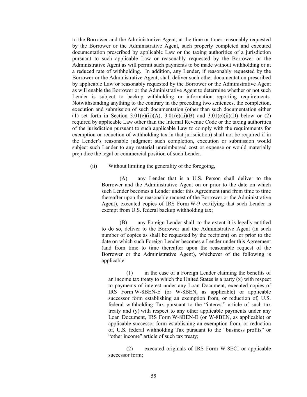 55 to the Borrower and the Administrative Agent, at the time or times reasonably requested by the Borrower or the Administrative Agent, such properly completed and executed documentation prescribed by applicable Law or the taxing authorities of a jurisdiction pursuant to such applicable Law or reasonably requested by the Borrower or the Administrative Agent as will permit such payments to be made without withholding or at a reduced rate of withholding. In addition, any Lender, if reasonably requested by the Borrower or the Administrative Agent, shall deliver such other documentation prescribed by applicable Law or reasonably requested by the Borrower or the Administrative Agent as will enable the Borrower or the Administrative Agent to determine whether or not such Lender is subject to backup withholding or information reporting requirements. Notwithstanding anything to the contrary in the preceding two sentences, the completion, execution and submission of such documentation (other than such documentation either (1) set forth in Section 3.01(e)(ii)(A), 3.01(e)(ii)(B) and 3.01(e)(ii)(D) below or (2) required by applicable Law other than the Internal Revenue Code or the taxing authorities of the jurisdiction pursuant to such applicable Law to comply with the requirements for exemption or reduction of withholding tax in that jurisdiction) shall not be required if in the Lender’s reasonable judgment such completion, execution or submission would subject such Lender to any material unreimbursed cost or expense or would materially prejudice the legal or commercial position of such Lender. (ii) Without limiting the generality of the foregoing, (A) any Lender that is a U.S. Person shall deliver to the Borrower and the Administrative Agent on or prior to the date on which such Lender becomes a Lender under this Agreement (and from time to time thereafter upon the reasonable request of the Borrower or the Administrative Agent), executed copies of IRS Form W-9 certifying that such Lender is exempt from U.S. federal backup withholding tax; (B) any Foreign Lender shall, to the extent it is legally entitled to do so, deliver to the Borrower and the Administrative Agent (in such number of copies as shall be requested by the recipient) on or prior to the date on which such Foreign Lender becomes a Lender under this Agreement (and from time to time thereafter upon the reasonable request of the Borrower or the Administrative Agent), whichever of the following is applicable: (1) in the case of a Foreign Lender claiming the benefits of an income tax treaty to which the United States is a party (x) with respect to payments of interest under any Loan Document, executed copies of IRS Form W-8BEN-E (or W-8BEN, as applicable) or applicable successor form establishing an exemption from, or reduction of, U.S. federal withholding Tax pursuant to the “interest” article of such tax treaty and (y) with respect to any other applicable payments under any Loan Document, IRS Form W-8BEN-E (or W-8BEN, as applicable) or applicable successor form establishing an exemption from, or reduction of, U.S. federal withholding Tax pursuant to the “business profits” or “other income” article of such tax treaty; (2) executed originals of IRS Form W-8ECI or applicable successor form;