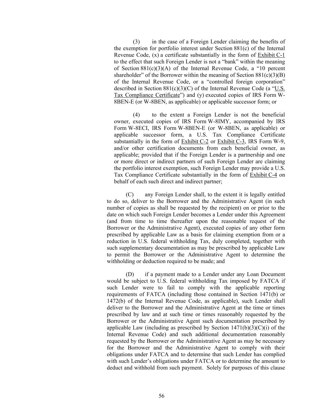 56 (3) in the case of a Foreign Lender claiming the benefits of the exemption for portfolio interest under Section 881(c) of the Internal Revenue Code, (x) a certificate substantially in the form of Exhibit C-1 to the effect that such Foreign Lender is not a “bank” within the meaning of Section 881(c)(3)(A) of the Internal Revenue Code, a “10 percent shareholder” of the Borrower within the meaning of Section 881(c)(3)(B) of the Internal Revenue Code, or a “controlled foreign corporation” described in Section 881(c)(3)(C) of the Internal Revenue Code (a “U.S. Tax Compliance Certificate”) and (y) executed copies of IRS Form W- 8BEN-E (or W-8BEN, as applicable) or applicable successor form; or (4) to the extent a Foreign Lender is not the beneficial owner, executed copies of IRS Form W-8IMY, accompanied by IRS Form W-8ECI, IRS Form W-8BEN-E (or W-8BEN, as applicable) or applicable successor form, a U.S. Tax Compliance Certificate substantially in the form of Exhibit C-2 or Exhibit C-3, IRS Form W-9, and/or other certification documents from each beneficial owner, as applicable; provided that if the Foreign Lender is a partnership and one or more direct or indirect partners of such Foreign Lender are claiming the portfolio interest exemption, such Foreign Lender may provide a U.S. Tax Compliance Certificate substantially in the form of Exhibit C-4 on behalf of each such direct and indirect partner; (C) any Foreign Lender shall, to the extent it is legally entitled to do so, deliver to the Borrower and the Administrative Agent (in such number of copies as shall be requested by the recipient) on or prior to the date on which such Foreign Lender becomes a Lender under this Agreement (and from time to time thereafter upon the reasonable request of the Borrower or the Administrative Agent), executed copies of any other form prescribed by applicable Law as a basis for claiming exemption from or a reduction in U.S. federal withholding Tax, duly completed, together with such supplementary documentation as may be prescribed by applicable Law to permit the Borrower or the Administrative Agent to determine the withholding or deduction required to be made; and (D) if a payment made to a Lender under any Loan Document would be subject to U.S. federal withholding Tax imposed by FATCA if such Lender were to fail to comply with the applicable reporting requirements of FATCA (including those contained in Section 1471(b) or 1472(b) of the Internal Revenue Code, as applicable), such Lender shall deliver to the Borrower and the Administrative Agent at the time or times prescribed by law and at such time or times reasonably requested by the Borrower or the Administrative Agent such documentation prescribed by applicable Law (including as prescribed by Section 1471(b)(3)(C)(i) of the Internal Revenue Code) and such additional documentation reasonably requested by the Borrower or the Administrative Agent as may be necessary for the Borrower and the Administrative Agent to comply with their obligations under FATCA and to determine that such Lender has complied with such Lender’s obligations under FATCA or to determine the amount to deduct and withhold from such payment. Solely for purposes of this clause