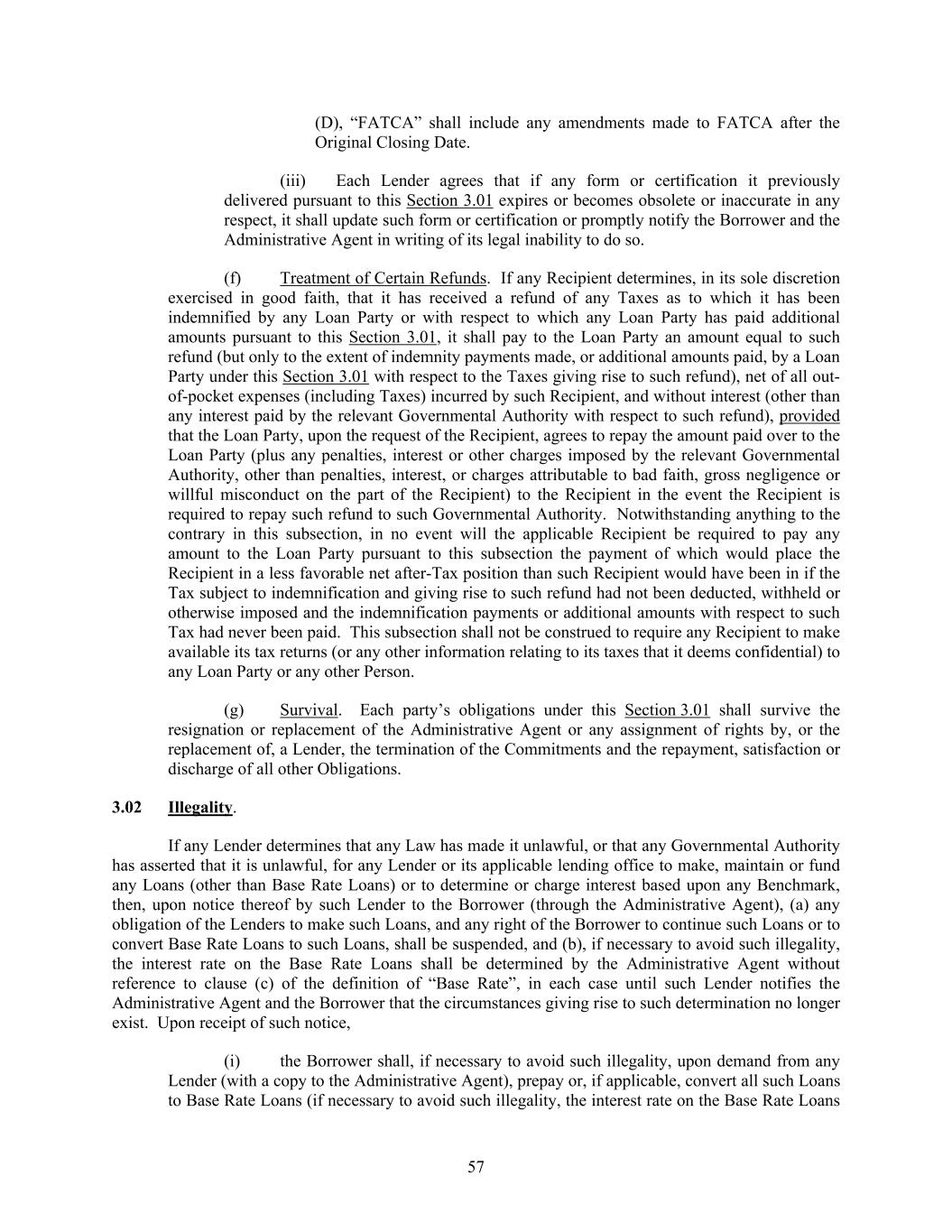 57 (D), “FATCA” shall include any amendments made to FATCA after the Original Closing Date. (iii) Each Lender agrees that if any form or certification it previously delivered pursuant to this Section 3.01 expires or becomes obsolete or inaccurate in any respect, it shall update such form or certification or promptly notify the Borrower and the Administrative Agent in writing of its legal inability to do so. (f) Treatment of Certain Refunds. If any Recipient determines, in its sole discretion exercised in good faith, that it has received a refund of any Taxes as to which it has been indemnified by any Loan Party or with respect to which any Loan Party has paid additional amounts pursuant to this Section 3.01, it shall pay to the Loan Party an amount equal to such refund (but only to the extent of indemnity payments made, or additional amounts paid, by a Loan Party under this Section 3.01 with respect to the Taxes giving rise to such refund), net of all out- of-pocket expenses (including Taxes) incurred by such Recipient, and without interest (other than any interest paid by the relevant Governmental Authority with respect to such refund), provided that the Loan Party, upon the request of the Recipient, agrees to repay the amount paid over to the Loan Party (plus any penalties, interest or other charges imposed by the relevant Governmental Authority, other than penalties, interest, or charges attributable to bad faith, gross negligence or willful misconduct on the part of the Recipient) to the Recipient in the event the Recipient is required to repay such refund to such Governmental Authority. Notwithstanding anything to the contrary in this subsection, in no event will the applicable Recipient be required to pay any amount to the Loan Party pursuant to this subsection the payment of which would place the Recipient in a less favorable net after-Tax position than such Recipient would have been in if the Tax subject to indemnification and giving rise to such refund had not been deducted, withheld or otherwise imposed and the indemnification payments or additional amounts with respect to such Tax had never been paid. This subsection shall not be construed to require any Recipient to make available its tax returns (or any other information relating to its taxes that it deems confidential) to any Loan Party or any other Person. (g) Survival. Each party’s obligations under this Section 3.01 shall survive the resignation or replacement of the Administrative Agent or any assignment of rights by, or the replacement of, a Lender, the termination of the Commitments and the repayment, satisfaction or discharge of all other Obligations. 3.02 Illegality. If any Lender determines that any Law has made it unlawful, or that any Governmental Authority has asserted that it is unlawful, for any Lender or its applicable lending office to make, maintain or fund any Loans (other than Base Rate Loans) or to determine or charge interest based upon any Benchmark, then, upon notice thereof by such Lender to the Borrower (through the Administrative Agent), (a) any obligation of the Lenders to make such Loans, and any right of the Borrower to continue such Loans or to convert Base Rate Loans to such Loans, shall be suspended, and (b), if necessary to avoid such illegality, the interest rate on the Base Rate Loans shall be determined by the Administrative Agent without reference to clause (c) of the definition of “Base Rate”, in each case until such Lender notifies the Administrative Agent and the Borrower that the circumstances giving rise to such determination no longer exist. Upon receipt of such notice, (i) the Borrower shall, if necessary to avoid such illegality, upon demand from any Lender (with a copy to the Administrative Agent), prepay or, if applicable, convert all such Loans to Base Rate Loans (if necessary to avoid such illegality, the interest rate on the Base Rate Loans