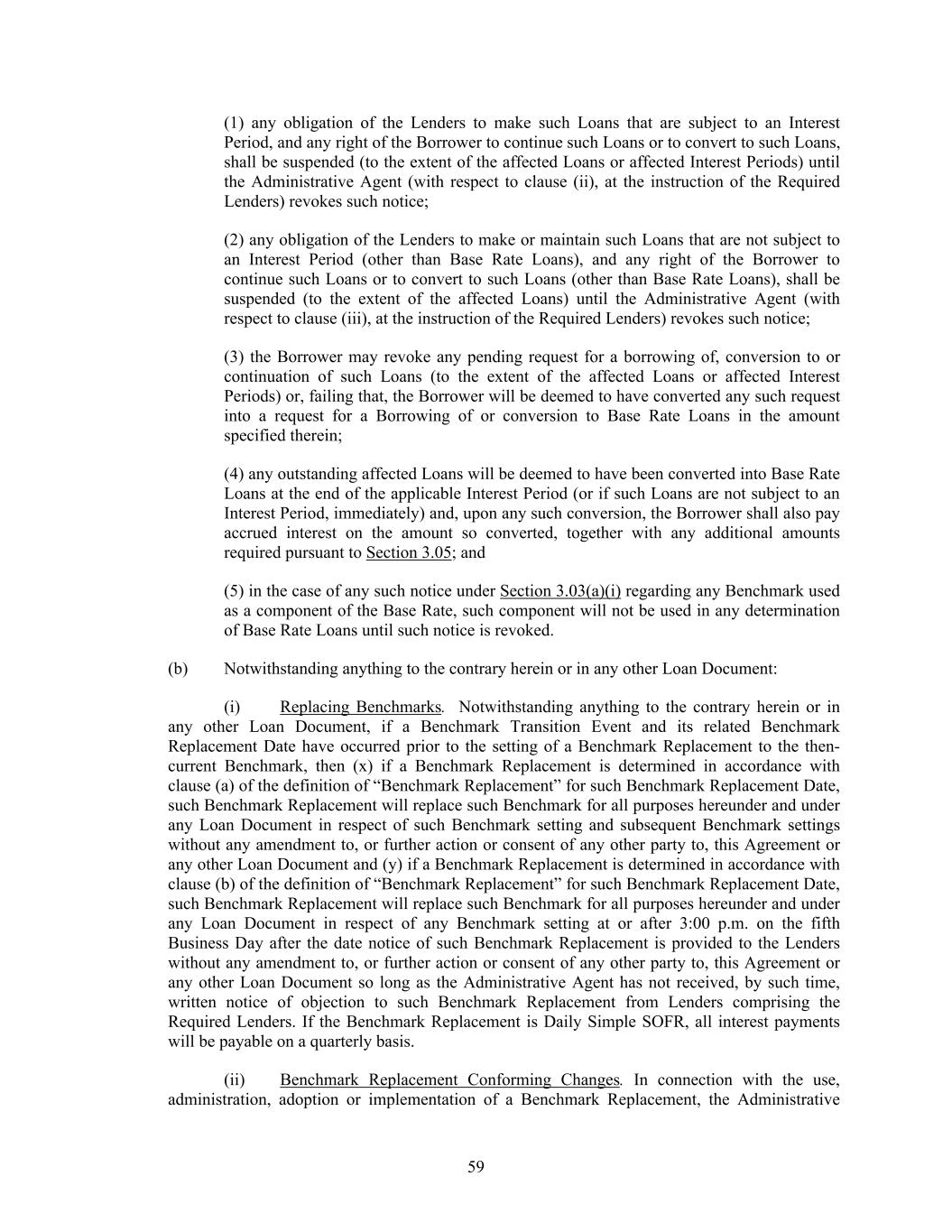 59 (1) any obligation of the Lenders to make such Loans that are subject to an Interest Period, and any right of the Borrower to continue such Loans or to convert to such Loans, shall be suspended (to the extent of the affected Loans or affected Interest Periods) until the Administrative Agent (with respect to clause (ii), at the instruction of the Required Lenders) revokes such notice; (2) any obligation of the Lenders to make or maintain such Loans that are not subject to an Interest Period (other than Base Rate Loans), and any right of the Borrower to continue such Loans or to convert to such Loans (other than Base Rate Loans), shall be suspended (to the extent of the affected Loans) until the Administrative Agent (with respect to clause (iii), at the instruction of the Required Lenders) revokes such notice; (3) the Borrower may revoke any pending request for a borrowing of, conversion to or continuation of such Loans (to the extent of the affected Loans or affected Interest Periods) or, failing that, the Borrower will be deemed to have converted any such request into a request for a Borrowing of or conversion to Base Rate Loans in the amount specified therein; (4) any outstanding affected Loans will be deemed to have been converted into Base Rate Loans at the end of the applicable Interest Period (or if such Loans are not subject to an Interest Period, immediately) and, upon any such conversion, the Borrower shall also pay accrued interest on the amount so converted, together with any additional amounts required pursuant to Section 3.05; and (5) in the case of any such notice under Section 3.03(a)(i) regarding any Benchmark used as a component of the Base Rate, such component will not be used in any determination of Base Rate Loans until such notice is revoked. (b) Notwithstanding anything to the contrary herein or in any other Loan Document: (i) Replacing Benchmarks. Notwithstanding anything to the contrary herein or in any other Loan Document, if a Benchmark Transition Event and its related Benchmark Replacement Date have occurred prior to the setting of a Benchmark Replacement to the then- current Benchmark, then (x) if a Benchmark Replacement is determined in accordance with clause (a) of the definition of “Benchmark Replacement” for such Benchmark Replacement Date, such Benchmark Replacement will replace such Benchmark for all purposes hereunder and under any Loan Document in respect of such Benchmark setting and subsequent Benchmark settings without any amendment to, or further action or consent of any other party to, this Agreement or any other Loan Document and (y) if a Benchmark Replacement is determined in accordance with clause (b) of the definition of “Benchmark Replacement” for such Benchmark Replacement Date, such Benchmark Replacement will replace such Benchmark for all purposes hereunder and under any Loan Document in respect of any Benchmark setting at or after 3:00 p.m. on the fifth Business Day after the date notice of such Benchmark Replacement is provided to the Lenders without any amendment to, or further action or consent of any other party to, this Agreement or any other Loan Document so long as the Administrative Agent has not received, by such time, written notice of objection to such Benchmark Replacement from Lenders comprising the Required Lenders. If the Benchmark Replacement is Daily Simple SOFR, all interest payments will be payable on a quarterly basis. (ii) Benchmark Replacement Conforming Changes. In connection with the use, administration, adoption or implementation of a Benchmark Replacement, the Administrative