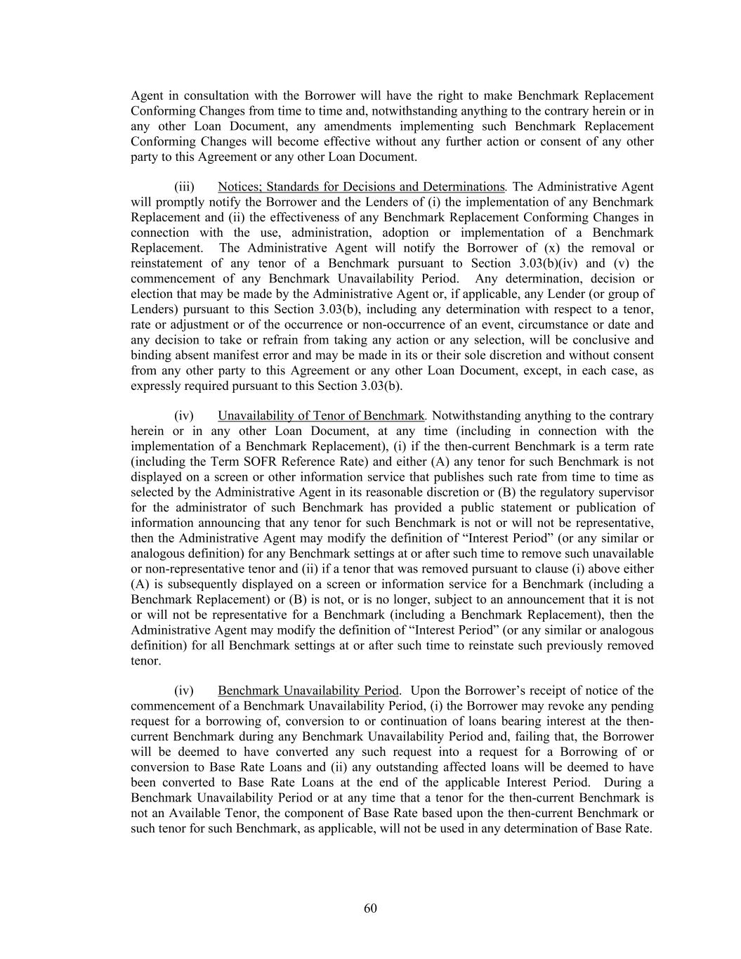 60 Agent in consultation with the Borrower will have the right to make Benchmark Replacement Conforming Changes from time to time and, notwithstanding anything to the contrary herein or in any other Loan Document, any amendments implementing such Benchmark Replacement Conforming Changes will become effective without any further action or consent of any other party to this Agreement or any other Loan Document. (iii) Notices; Standards for Decisions and Determinations. The Administrative Agent will promptly notify the Borrower and the Lenders of (i) the implementation of any Benchmark Replacement and (ii) the effectiveness of any Benchmark Replacement Conforming Changes in connection with the use, administration, adoption or implementation of a Benchmark Replacement. The Administrative Agent will notify the Borrower of (x) the removal or reinstatement of any tenor of a Benchmark pursuant to Section 3.03(b)(iv) and (v) the commencement of any Benchmark Unavailability Period. Any determination, decision or election that may be made by the Administrative Agent or, if applicable, any Lender (or group of Lenders) pursuant to this Section 3.03(b), including any determination with respect to a tenor, rate or adjustment or of the occurrence or non-occurrence of an event, circumstance or date and any decision to take or refrain from taking any action or any selection, will be conclusive and binding absent manifest error and may be made in its or their sole discretion and without consent from any other party to this Agreement or any other Loan Document, except, in each case, as expressly required pursuant to this Section 3.03(b). (iv) Unavailability of Tenor of Benchmark. Notwithstanding anything to the contrary herein or in any other Loan Document, at any time (including in connection with the implementation of a Benchmark Replacement), (i) if the then-current Benchmark is a term rate (including the Term SOFR Reference Rate) and either (A) any tenor for such Benchmark is not displayed on a screen or other information service that publishes such rate from time to time as selected by the Administrative Agent in its reasonable discretion or (B) the regulatory supervisor for the administrator of such Benchmark has provided a public statement or publication of information announcing that any tenor for such Benchmark is not or will not be representative, then the Administrative Agent may modify the definition of “Interest Period” (or any similar or analogous definition) for any Benchmark settings at or after such time to remove such unavailable or non-representative tenor and (ii) if a tenor that was removed pursuant to clause (i) above either (A) is subsequently displayed on a screen or information service for a Benchmark (including a Benchmark Replacement) or (B) is not, or is no longer, subject to an announcement that it is not or will not be representative for a Benchmark (including a Benchmark Replacement), then the Administrative Agent may modify the definition of “Interest Period” (or any similar or analogous definition) for all Benchmark settings at or after such time to reinstate such previously removed tenor. (iv) Benchmark Unavailability Period. Upon the Borrower’s receipt of notice of the commencement of a Benchmark Unavailability Period, (i) the Borrower may revoke any pending request for a borrowing of, conversion to or continuation of loans bearing interest at the then- current Benchmark during any Benchmark Unavailability Period and, failing that, the Borrower will be deemed to have converted any such request into a request for a Borrowing of or conversion to Base Rate Loans and (ii) any outstanding affected loans will be deemed to have been converted to Base Rate Loans at the end of the applicable Interest Period. During a Benchmark Unavailability Period or at any time that a tenor for the then-current Benchmark is not an Available Tenor, the component of Base Rate based upon the then-current Benchmark or such tenor for such Benchmark, as applicable, will not be used in any determination of Base Rate.