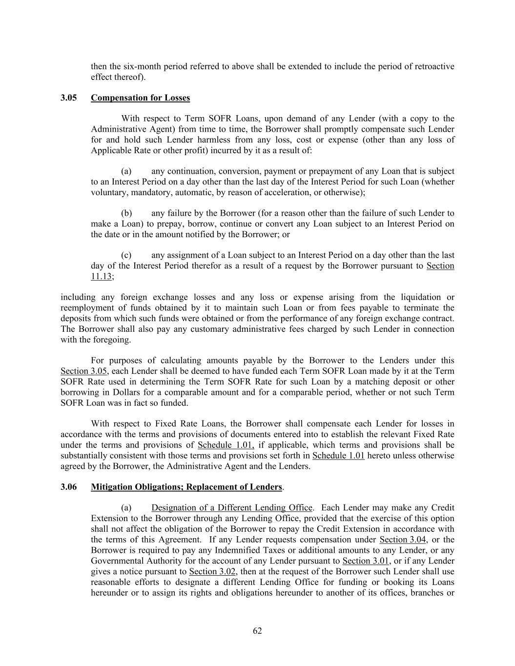 62 then the six-month period referred to above shall be extended to include the period of retroactive effect thereof). 3.05 Compensation for Losses With respect to Term SOFR Loans, upon demand of any Lender (with a copy to the Administrative Agent) from time to time, the Borrower shall promptly compensate such Lender for and hold such Lender harmless from any loss, cost or expense (other than any loss of Applicable Rate or other profit) incurred by it as a result of: (a) any continuation, conversion, payment or prepayment of any Loan that is subject to an Interest Period on a day other than the last day of the Interest Period for such Loan (whether voluntary, mandatory, automatic, by reason of acceleration, or otherwise); (b) any failure by the Borrower (for a reason other than the failure of such Lender to make a Loan) to prepay, borrow, continue or convert any Loan subject to an Interest Period on the date or in the amount notified by the Borrower; or (c) any assignment of a Loan subject to an Interest Period on a day other than the last day of the Interest Period therefor as a result of a request by the Borrower pursuant to Section 11.13; including any foreign exchange losses and any loss or expense arising from the liquidation or reemployment of funds obtained by it to maintain such Loan or from fees payable to terminate the deposits from which such funds were obtained or from the performance of any foreign exchange contract. The Borrower shall also pay any customary administrative fees charged by such Lender in connection with the foregoing. For purposes of calculating amounts payable by the Borrower to the Lenders under this Section 3.05, each Lender shall be deemed to have funded each Term SOFR Loan made by it at the Term SOFR Rate used in determining the Term SOFR Rate for such Loan by a matching deposit or other borrowing in Dollars for a comparable amount and for a comparable period, whether or not such Term SOFR Loan was in fact so funded. With respect to Fixed Rate Loans, the Borrower shall compensate each Lender for losses in accordance with the terms and provisions of documents entered into to establish the relevant Fixed Rate under the terms and provisions of Schedule 1.01, if applicable, which terms and provisions shall be substantially consistent with those terms and provisions set forth in Schedule 1.01 hereto unless otherwise agreed by the Borrower, the Administrative Agent and the Lenders. 3.06 Mitigation Obligations; Replacement of Lenders. (a) Designation of a Different Lending Office. Each Lender may make any Credit Extension to the Borrower through any Lending Office, provided that the exercise of this option shall not affect the obligation of the Borrower to repay the Credit Extension in accordance with the terms of this Agreement. If any Lender requests compensation under Section 3.04, or the Borrower is required to pay any Indemnified Taxes or additional amounts to any Lender, or any Governmental Authority for the account of any Lender pursuant to Section 3.01, or if any Lender gives a notice pursuant to Section 3.02, then at the request of the Borrower such Lender shall use reasonable efforts to designate a different Lending Office for funding or booking its Loans hereunder or to assign its rights and obligations hereunder to another of its offices, branches or