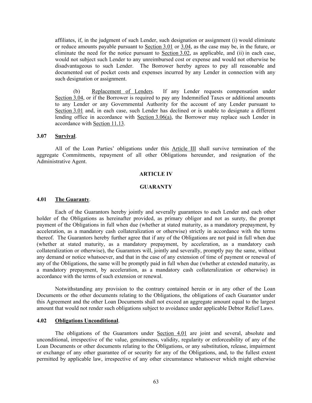 63 affiliates, if, in the judgment of such Lender, such designation or assignment (i) would eliminate or reduce amounts payable pursuant to Section 3.01 or 3.04, as the case may be, in the future, or eliminate the need for the notice pursuant to Section 3.02, as applicable, and (ii) in each case, would not subject such Lender to any unreimbursed cost or expense and would not otherwise be disadvantageous to such Lender. The Borrower hereby agrees to pay all reasonable and documented out of pocket costs and expenses incurred by any Lender in connection with any such designation or assignment. (b) Replacement of Lenders. If any Lender requests compensation under Section 3.04, or if the Borrower is required to pay any Indemnified Taxes or additional amounts to any Lender or any Governmental Authority for the account of any Lender pursuant to Section 3.01 and, in each case, such Lender has declined or is unable to designate a different lending office in accordance with Section 3.06(a), the Borrower may replace such Lender in accordance with Section 11.13. 3.07 Survival. All of the Loan Parties’ obligations under this Article III shall survive termination of the aggregate Commitments, repayment of all other Obligations hereunder, and resignation of the Administrative Agent. ARTICLE IV GUARANTY 4.01 The Guaranty. Each of the Guarantors hereby jointly and severally guarantees to each Lender and each other holder of the Obligations as hereinafter provided, as primary obligor and not as surety, the prompt payment of the Obligations in full when due (whether at stated maturity, as a mandatory prepayment, by acceleration, as a mandatory cash collateralization or otherwise) strictly in accordance with the terms thereof. The Guarantors hereby further agree that if any of the Obligations are not paid in full when due (whether at stated maturity, as a mandatory prepayment, by acceleration, as a mandatory cash collateralization or otherwise), the Guarantors will, jointly and severally, promptly pay the same, without any demand or notice whatsoever, and that in the case of any extension of time of payment or renewal of any of the Obligations, the same will be promptly paid in full when due (whether at extended maturity, as a mandatory prepayment, by acceleration, as a mandatory cash collateralization or otherwise) in accordance with the terms of such extension or renewal. Notwithstanding any provision to the contrary contained herein or in any other of the Loan Documents or the other documents relating to the Obligations, the obligations of each Guarantor under this Agreement and the other Loan Documents shall not exceed an aggregate amount equal to the largest amount that would not render such obligations subject to avoidance under applicable Debtor Relief Laws. 4.02 Obligations Unconditional. The obligations of the Guarantors under Section 4.01 are joint and several, absolute and unconditional, irrespective of the value, genuineness, validity, regularity or enforceability of any of the Loan Documents or other documents relating to the Obligations, or any substitution, release, impairment or exchange of any other guarantee of or security for any of the Obligations, and, to the fullest extent permitted by applicable law, irrespective of any other circumstance whatsoever which might otherwise
