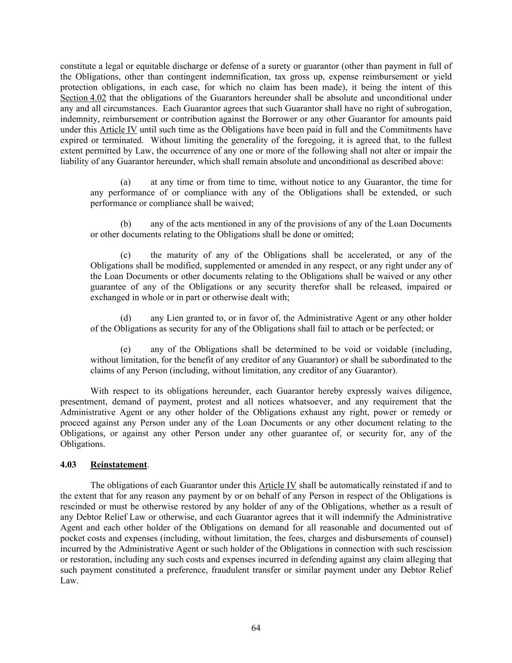 64 constitute a legal or equitable discharge or defense of a surety or guarantor (other than payment in full of the Obligations, other than contingent indemnification, tax gross up, expense reimbursement or yield protection obligations, in each case, for which no claim has been made), it being the intent of this Section 4.02 that the obligations of the Guarantors hereunder shall be absolute and unconditional under any and all circumstances. Each Guarantor agrees that such Guarantor shall have no right of subrogation, indemnity, reimbursement or contribution against the Borrower or any other Guarantor for amounts paid under this Article IV until such time as the Obligations have been paid in full and the Commitments have expired or terminated. Without limiting the generality of the foregoing, it is agreed that, to the fullest extent permitted by Law, the occurrence of any one or more of the following shall not alter or impair the liability of any Guarantor hereunder, which shall remain absolute and unconditional as described above: (a) at any time or from time to time, without notice to any Guarantor, the time for any performance of or compliance with any of the Obligations shall be extended, or such performance or compliance shall be waived; (b) any of the acts mentioned in any of the provisions of any of the Loan Documents or other documents relating to the Obligations shall be done or omitted; (c) the maturity of any of the Obligations shall be accelerated, or any of the Obligations shall be modified, supplemented or amended in any respect, or any right under any of the Loan Documents or other documents relating to the Obligations shall be waived or any other guarantee of any of the Obligations or any security therefor shall be released, impaired or exchanged in whole or in part or otherwise dealt with; (d) any Lien granted to, or in favor of, the Administrative Agent or any other holder of the Obligations as security for any of the Obligations shall fail to attach or be perfected; or (e) any of the Obligations shall be determined to be void or voidable (including, without limitation, for the benefit of any creditor of any Guarantor) or shall be subordinated to the claims of any Person (including, without limitation, any creditor of any Guarantor). With respect to its obligations hereunder, each Guarantor hereby expressly waives diligence, presentment, demand of payment, protest and all notices whatsoever, and any requirement that the Administrative Agent or any other holder of the Obligations exhaust any right, power or remedy or proceed against any Person under any of the Loan Documents or any other document relating to the Obligations, or against any other Person under any other guarantee of, or security for, any of the Obligations. 4.03 Reinstatement. The obligations of each Guarantor under this Article IV shall be automatically reinstated if and to the extent that for any reason any payment by or on behalf of any Person in respect of the Obligations is rescinded or must be otherwise restored by any holder of any of the Obligations, whether as a result of any Debtor Relief Law or otherwise, and each Guarantor agrees that it will indemnify the Administrative Agent and each other holder of the Obligations on demand for all reasonable and documented out of pocket costs and expenses (including, without limitation, the fees, charges and disbursements of counsel) incurred by the Administrative Agent or such holder of the Obligations in connection with such rescission or restoration, including any such costs and expenses incurred in defending against any claim alleging that such payment constituted a preference, fraudulent transfer or similar payment under any Debtor Relief Law.
