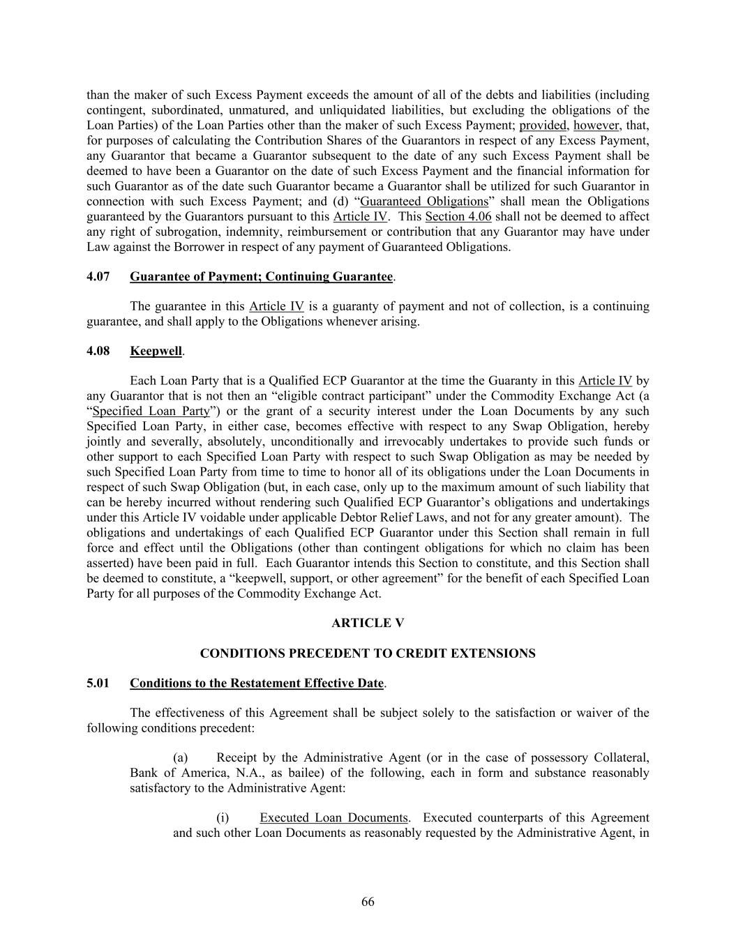 66 than the maker of such Excess Payment exceeds the amount of all of the debts and liabilities (including contingent, subordinated, unmatured, and unliquidated liabilities, but excluding the obligations of the Loan Parties) of the Loan Parties other than the maker of such Excess Payment; provided, however, that, for purposes of calculating the Contribution Shares of the Guarantors in respect of any Excess Payment, any Guarantor that became a Guarantor subsequent to the date of any such Excess Payment shall be deemed to have been a Guarantor on the date of such Excess Payment and the financial information for such Guarantor as of the date such Guarantor became a Guarantor shall be utilized for such Guarantor in connection with such Excess Payment; and (d) “Guaranteed Obligations” shall mean the Obligations guaranteed by the Guarantors pursuant to this Article IV. This Section 4.06 shall not be deemed to affect any right of subrogation, indemnity, reimbursement or contribution that any Guarantor may have under Law against the Borrower in respect of any payment of Guaranteed Obligations. 4.07 Guarantee of Payment; Continuing Guarantee. The guarantee in this Article IV is a guaranty of payment and not of collection, is a continuing guarantee, and shall apply to the Obligations whenever arising. 4.08 Keepwell. Each Loan Party that is a Qualified ECP Guarantor at the time the Guaranty in this Article IV by any Guarantor that is not then an “eligible contract participant” under the Commodity Exchange Act (a “Specified Loan Party”) or the grant of a security interest under the Loan Documents by any such Specified Loan Party, in either case, becomes effective with respect to any Swap Obligation, hereby jointly and severally, absolutely, unconditionally and irrevocably undertakes to provide such funds or other support to each Specified Loan Party with respect to such Swap Obligation as may be needed by such Specified Loan Party from time to time to honor all of its obligations under the Loan Documents in respect of such Swap Obligation (but, in each case, only up to the maximum amount of such liability that can be hereby incurred without rendering such Qualified ECP Guarantor’s obligations and undertakings under this Article IV voidable under applicable Debtor Relief Laws, and not for any greater amount). The obligations and undertakings of each Qualified ECP Guarantor under this Section shall remain in full force and effect until the Obligations (other than contingent obligations for which no claim has been asserted) have been paid in full. Each Guarantor intends this Section to constitute, and this Section shall be deemed to constitute, a “keepwell, support, or other agreement” for the benefit of each Specified Loan Party for all purposes of the Commodity Exchange Act. ARTICLE V CONDITIONS PRECEDENT TO CREDIT EXTENSIONS 5.01 Conditions to the Restatement Effective Date. The effectiveness of this Agreement shall be subject solely to the satisfaction or waiver of the following conditions precedent: (a) Receipt by the Administrative Agent (or in the case of possessory Collateral, Bank of America, N.A., as bailee) of the following, each in form and substance reasonably satisfactory to the Administrative Agent: (i) Executed Loan Documents. Executed counterparts of this Agreement and such other Loan Documents as reasonably requested by the Administrative Agent, in