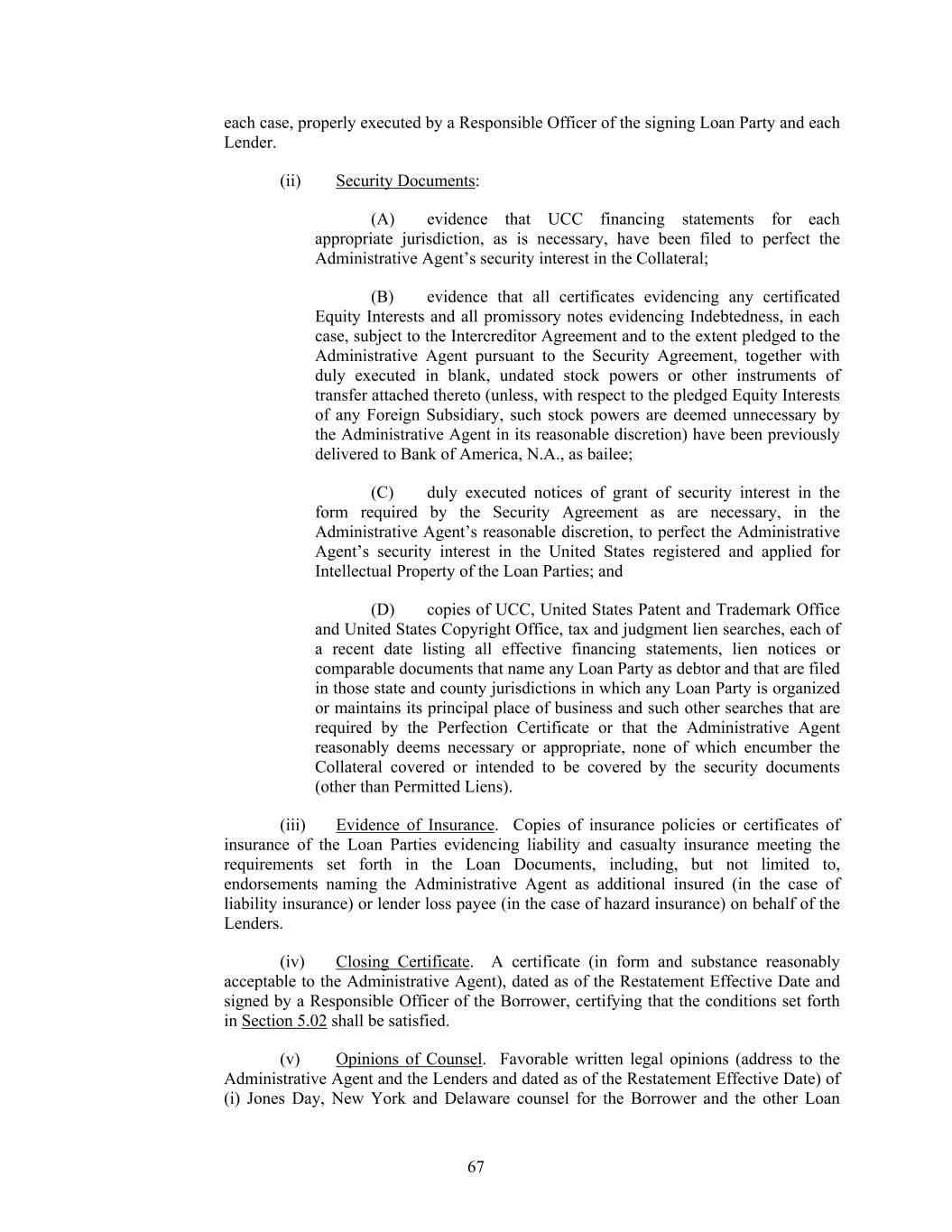 67 each case, properly executed by a Responsible Officer of the signing Loan Party and each Lender. (ii) Security Documents: (A) evidence that UCC financing statements for each appropriate jurisdiction, as is necessary, have been filed to perfect the Administrative Agent’s security interest in the Collateral; (B) evidence that all certificates evidencing any certificated Equity Interests and all promissory notes evidencing Indebtedness, in each case, subject to the Intercreditor Agreement and to the extent pledged to the Administrative Agent pursuant to the Security Agreement, together with duly executed in blank, undated stock powers or other instruments of transfer attached thereto (unless, with respect to the pledged Equity Interests of any Foreign Subsidiary, such stock powers are deemed unnecessary by the Administrative Agent in its reasonable discretion) have been previously delivered to Bank of America, N.A., as bailee; (C) duly executed notices of grant of security interest in the form required by the Security Agreement as are necessary, in the Administrative Agent’s reasonable discretion, to perfect the Administrative Agent’s security interest in the United States registered and applied for Intellectual Property of the Loan Parties; and (D) copies of UCC, United States Patent and Trademark Office and United States Copyright Office, tax and judgment lien searches, each of a recent date listing all effective financing statements, lien notices or comparable documents that name any Loan Party as debtor and that are filed in those state and county jurisdictions in which any Loan Party is organized or maintains its principal place of business and such other searches that are required by the Perfection Certificate or that the Administrative Agent reasonably deems necessary or appropriate, none of which encumber the Collateral covered or intended to be covered by the security documents (other than Permitted Liens). (iii) Evidence of Insurance. Copies of insurance policies or certificates of insurance of the Loan Parties evidencing liability and casualty insurance meeting the requirements set forth in the Loan Documents, including, but not limited to, endorsements naming the Administrative Agent as additional insured (in the case of liability insurance) or lender loss payee (in the case of hazard insurance) on behalf of the Lenders. (iv) Closing Certificate. A certificate (in form and substance reasonably acceptable to the Administrative Agent), dated as of the Restatement Effective Date and signed by a Responsible Officer of the Borrower, certifying that the conditions set forth in Section 5.02 shall be satisfied. (v) Opinions of Counsel. Favorable written legal opinions (address to the Administrative Agent and the Lenders and dated as of the Restatement Effective Date) of (i) Jones Day, New York and Delaware counsel for the Borrower and the other Loan