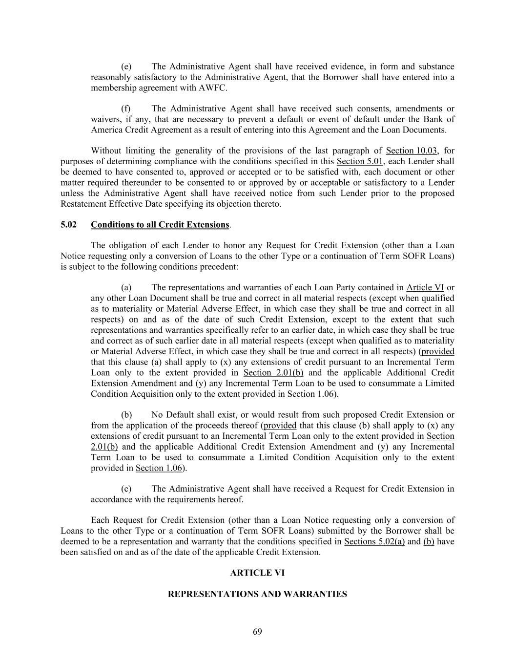 69 (e) The Administrative Agent shall have received evidence, in form and substance reasonably satisfactory to the Administrative Agent, that the Borrower shall have entered into a membership agreement with AWFC. (f) The Administrative Agent shall have received such consents, amendments or waivers, if any, that are necessary to prevent a default or event of default under the Bank of America Credit Agreement as a result of entering into this Agreement and the Loan Documents. Without limiting the generality of the provisions of the last paragraph of Section 10.03, for purposes of determining compliance with the conditions specified in this Section 5.01, each Lender shall be deemed to have consented to, approved or accepted or to be satisfied with, each document or other matter required thereunder to be consented to or approved by or acceptable or satisfactory to a Lender unless the Administrative Agent shall have received notice from such Lender prior to the proposed Restatement Effective Date specifying its objection thereto. 5.02 Conditions to all Credit Extensions. The obligation of each Lender to honor any Request for Credit Extension (other than a Loan Notice requesting only a conversion of Loans to the other Type or a continuation of Term SOFR Loans) is subject to the following conditions precedent: (a) The representations and warranties of each Loan Party contained in Article VI or any other Loan Document shall be true and correct in all material respects (except when qualified as to materiality or Material Adverse Effect, in which case they shall be true and correct in all respects) on and as of the date of such Credit Extension, except to the extent that such representations and warranties specifically refer to an earlier date, in which case they shall be true and correct as of such earlier date in all material respects (except when qualified as to materiality or Material Adverse Effect, in which case they shall be true and correct in all respects) (provided that this clause (a) shall apply to (x) any extensions of credit pursuant to an Incremental Term Loan only to the extent provided in Section 2.01(b) and the applicable Additional Credit Extension Amendment and (y) any Incremental Term Loan to be used to consummate a Limited Condition Acquisition only to the extent provided in Section 1.06). (b) No Default shall exist, or would result from such proposed Credit Extension or from the application of the proceeds thereof (provided that this clause (b) shall apply to (x) any extensions of credit pursuant to an Incremental Term Loan only to the extent provided in Section 2.01(b) and the applicable Additional Credit Extension Amendment and (y) any Incremental Term Loan to be used to consummate a Limited Condition Acquisition only to the extent provided in Section 1.06). (c) The Administrative Agent shall have received a Request for Credit Extension in accordance with the requirements hereof. Each Request for Credit Extension (other than a Loan Notice requesting only a conversion of Loans to the other Type or a continuation of Term SOFR Loans) submitted by the Borrower shall be deemed to be a representation and warranty that the conditions specified in Sections 5.02(a) and (b) have been satisfied on and as of the date of the applicable Credit Extension. ARTICLE VI REPRESENTATIONS AND WARRANTIES