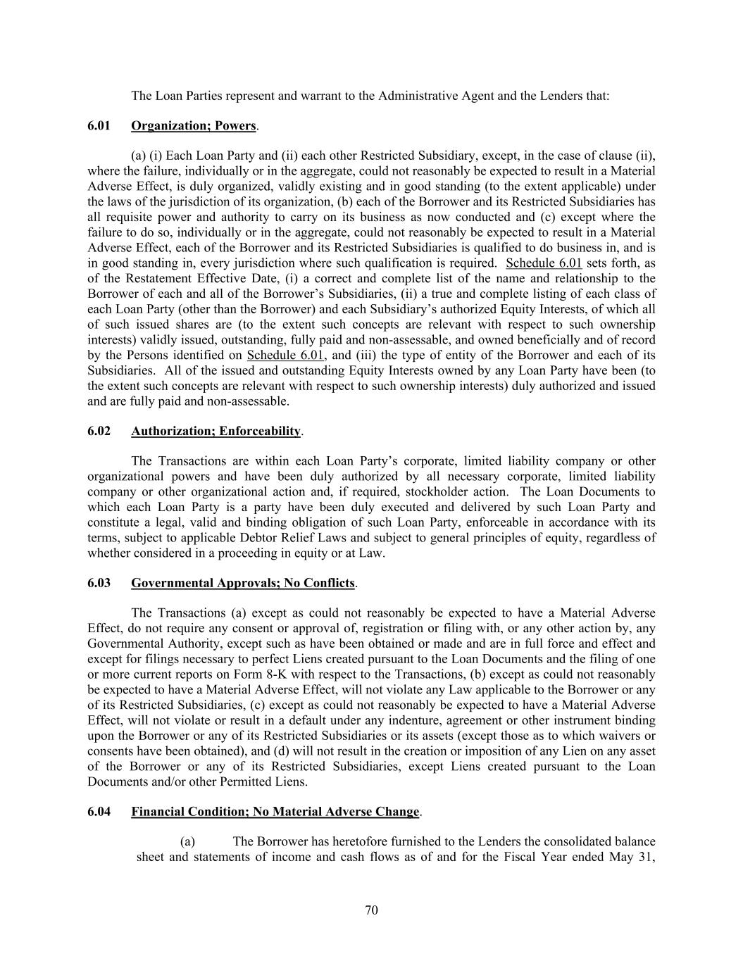 70 The Loan Parties represent and warrant to the Administrative Agent and the Lenders that: 6.01 Organization; Powers. (a) (i) Each Loan Party and (ii) each other Restricted Subsidiary, except, in the case of clause (ii), where the failure, individually or in the aggregate, could not reasonably be expected to result in a Material Adverse Effect, is duly organized, validly existing and in good standing (to the extent applicable) under the laws of the jurisdiction of its organization, (b) each of the Borrower and its Restricted Subsidiaries has all requisite power and authority to carry on its business as now conducted and (c) except where the failure to do so, individually or in the aggregate, could not reasonably be expected to result in a Material Adverse Effect, each of the Borrower and its Restricted Subsidiaries is qualified to do business in, and is in good standing in, every jurisdiction where such qualification is required. Schedule 6.01 sets forth, as of the Restatement Effective Date, (i) a correct and complete list of the name and relationship to the Borrower of each and all of the Borrower’s Subsidiaries, (ii) a true and complete listing of each class of each Loan Party (other than the Borrower) and each Subsidiary’s authorized Equity Interests, of which all of such issued shares are (to the extent such concepts are relevant with respect to such ownership interests) validly issued, outstanding, fully paid and non-assessable, and owned beneficially and of record by the Persons identified on Schedule 6.01, and (iii) the type of entity of the Borrower and each of its Subsidiaries. All of the issued and outstanding Equity Interests owned by any Loan Party have been (to the extent such concepts are relevant with respect to such ownership interests) duly authorized and issued and are fully paid and non-assessable. 6.02 Authorization; Enforceability. The Transactions are within each Loan Party’s corporate, limited liability company or other organizational powers and have been duly authorized by all necessary corporate, limited liability company or other organizational action and, if required, stockholder action. The Loan Documents to which each Loan Party is a party have been duly executed and delivered by such Loan Party and constitute a legal, valid and binding obligation of such Loan Party, enforceable in accordance with its terms, subject to applicable Debtor Relief Laws and subject to general principles of equity, regardless of whether considered in a proceeding in equity or at Law. 6.03 Governmental Approvals; No Conflicts. The Transactions (a) except as could not reasonably be expected to have a Material Adverse Effect, do not require any consent or approval of, registration or filing with, or any other action by, any Governmental Authority, except such as have been obtained or made and are in full force and effect and except for filings necessary to perfect Liens created pursuant to the Loan Documents and the filing of one or more current reports on Form 8-K with respect to the Transactions, (b) except as could not reasonably be expected to have a Material Adverse Effect, will not violate any Law applicable to the Borrower or any of its Restricted Subsidiaries, (c) except as could not reasonably be expected to have a Material Adverse Effect, will not violate or result in a default under any indenture, agreement or other instrument binding upon the Borrower or any of its Restricted Subsidiaries or its assets (except those as to which waivers or consents have been obtained), and (d) will not result in the creation or imposition of any Lien on any asset of the Borrower or any of its Restricted Subsidiaries, except Liens created pursuant to the Loan Documents and/or other Permitted Liens. 6.04 Financial Condition; No Material Adverse Change. (a) The Borrower has heretofore furnished to the Lenders the consolidated balance sheet and statements of income and cash flows as of and for the Fiscal Year ended May 31,