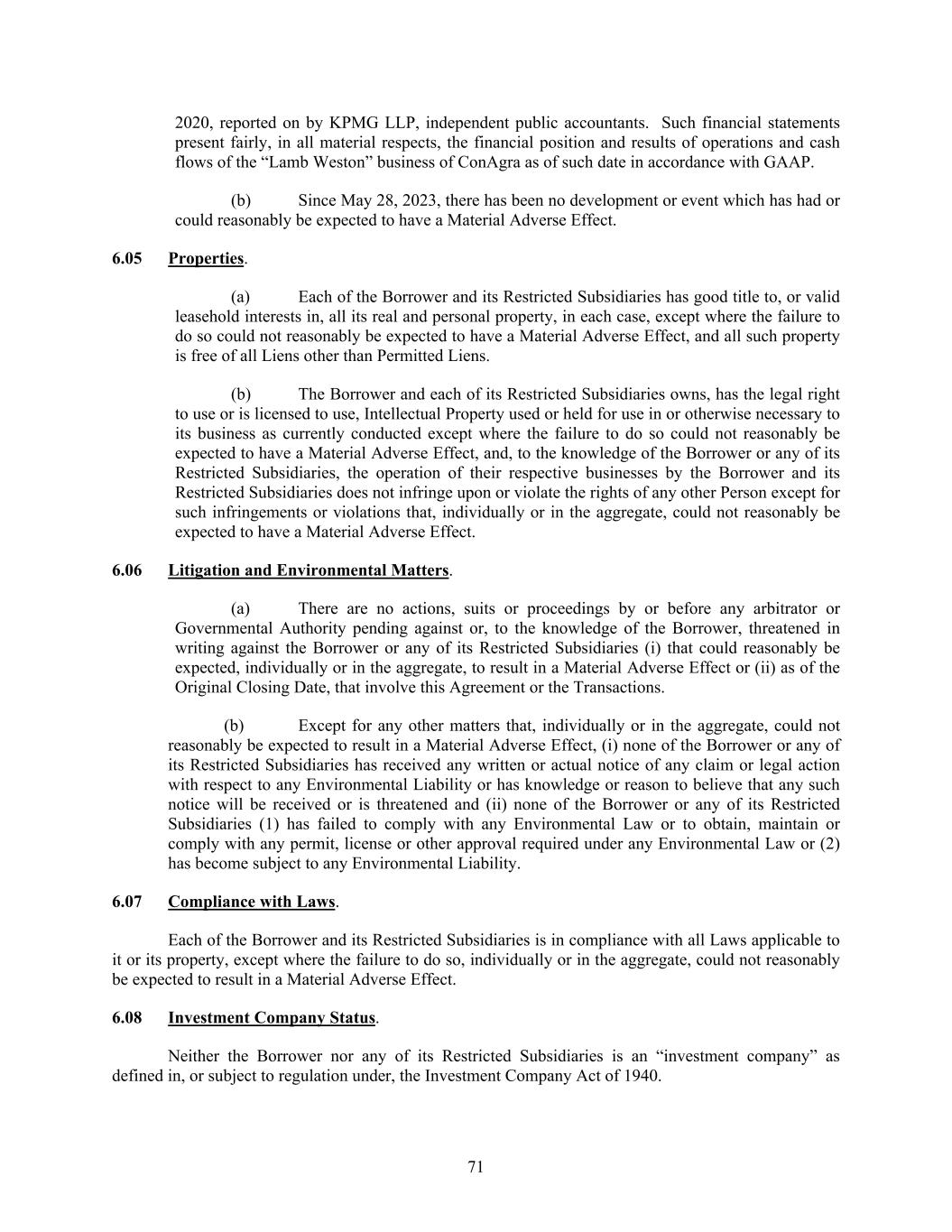 71 2020, reported on by KPMG LLP, independent public accountants. Such financial statements present fairly, in all material respects, the financial position and results of operations and cash flows of the “Lamb Weston” business of ConAgra as of such date in accordance with GAAP. (b) Since May 28, 2023, there has been no development or event which has had or could reasonably be expected to have a Material Adverse Effect. 6.05 Properties. (a) Each of the Borrower and its Restricted Subsidiaries has good title to, or valid leasehold interests in, all its real and personal property, in each case, except where the failure to do so could not reasonably be expected to have a Material Adverse Effect, and all such property is free of all Liens other than Permitted Liens. (b) The Borrower and each of its Restricted Subsidiaries owns, has the legal right to use or is licensed to use, Intellectual Property used or held for use in or otherwise necessary to its business as currently conducted except where the failure to do so could not reasonably be expected to have a Material Adverse Effect, and, to the knowledge of the Borrower or any of its Restricted Subsidiaries, the operation of their respective businesses by the Borrower and its Restricted Subsidiaries does not infringe upon or violate the rights of any other Person except for such infringements or violations that, individually or in the aggregate, could not reasonably be expected to have a Material Adverse Effect. 6.06 Litigation and Environmental Matters. (a) There are no actions, suits or proceedings by or before any arbitrator or Governmental Authority pending against or, to the knowledge of the Borrower, threatened in writing against the Borrower or any of its Restricted Subsidiaries (i) that could reasonably be expected, individually or in the aggregate, to result in a Material Adverse Effect or (ii) as of the Original Closing Date, that involve this Agreement or the Transactions. (b) Except for any other matters that, individually or in the aggregate, could not reasonably be expected to result in a Material Adverse Effect, (i) none of the Borrower or any of its Restricted Subsidiaries has received any written or actual notice of any claim or legal action with respect to any Environmental Liability or has knowledge or reason to believe that any such notice will be received or is threatened and (ii) none of the Borrower or any of its Restricted Subsidiaries (1) has failed to comply with any Environmental Law or to obtain, maintain or comply with any permit, license or other approval required under any Environmental Law or (2) has become subject to any Environmental Liability. 6.07 Compliance with Laws. Each of the Borrower and its Restricted Subsidiaries is in compliance with all Laws applicable to it or its property, except where the failure to do so, individually or in the aggregate, could not reasonably be expected to result in a Material Adverse Effect. 6.08 Investment Company Status. Neither the Borrower nor any of its Restricted Subsidiaries is an “investment company” as defined in, or subject to regulation under, the Investment Company Act of 1940.