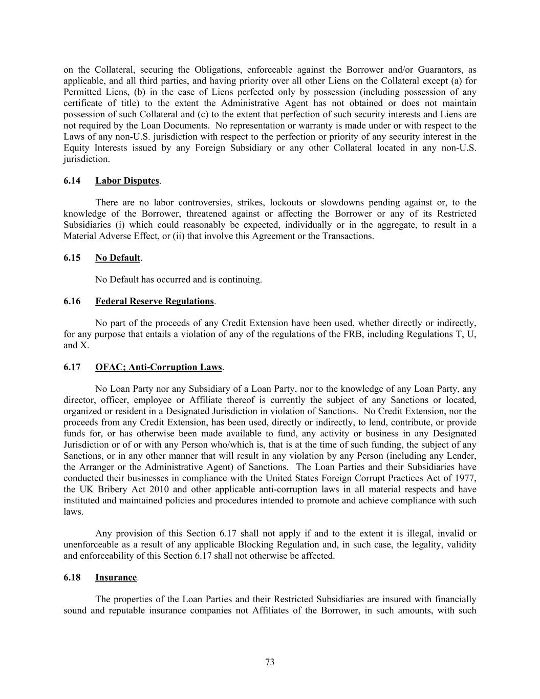 73 on the Collateral, securing the Obligations, enforceable against the Borrower and/or Guarantors, as applicable, and all third parties, and having priority over all other Liens on the Collateral except (a) for Permitted Liens, (b) in the case of Liens perfected only by possession (including possession of any certificate of title) to the extent the Administrative Agent has not obtained or does not maintain possession of such Collateral and (c) to the extent that perfection of such security interests and Liens are not required by the Loan Documents. No representation or warranty is made under or with respect to the Laws of any non-U.S. jurisdiction with respect to the perfection or priority of any security interest in the Equity Interests issued by any Foreign Subsidiary or any other Collateral located in any non-U.S. jurisdiction. 6.14 Labor Disputes. There are no labor controversies, strikes, lockouts or slowdowns pending against or, to the knowledge of the Borrower, threatened against or affecting the Borrower or any of its Restricted Subsidiaries (i) which could reasonably be expected, individually or in the aggregate, to result in a Material Adverse Effect, or (ii) that involve this Agreement or the Transactions. 6.15 No Default. No Default has occurred and is continuing. 6.16 Federal Reserve Regulations. No part of the proceeds of any Credit Extension have been used, whether directly or indirectly, for any purpose that entails a violation of any of the regulations of the FRB, including Regulations T, U, and X. 6.17 OFAC; Anti-Corruption Laws. No Loan Party nor any Subsidiary of a Loan Party, nor to the knowledge of any Loan Party, any director, officer, employee or Affiliate thereof is currently the subject of any Sanctions or located, organized or resident in a Designated Jurisdiction in violation of Sanctions. No Credit Extension, nor the proceeds from any Credit Extension, has been used, directly or indirectly, to lend, contribute, or provide funds for, or has otherwise been made available to fund, any activity or business in any Designated Jurisdiction or of or with any Person who/which is, that is at the time of such funding, the subject of any Sanctions, or in any other manner that will result in any violation by any Person (including any Lender, the Arranger or the Administrative Agent) of Sanctions. The Loan Parties and their Subsidiaries have conducted their businesses in compliance with the United States Foreign Corrupt Practices Act of 1977, the UK Bribery Act 2010 and other applicable anti-corruption laws in all material respects and have instituted and maintained policies and procedures intended to promote and achieve compliance with such laws. Any provision of this Section 6.17 shall not apply if and to the extent it is illegal, invalid or unenforceable as a result of any applicable Blocking Regulation and, in such case, the legality, validity and enforceability of this Section 6.17 shall not otherwise be affected. 6.18 Insurance. The properties of the Loan Parties and their Restricted Subsidiaries are insured with financially sound and reputable insurance companies not Affiliates of the Borrower, in such amounts, with such