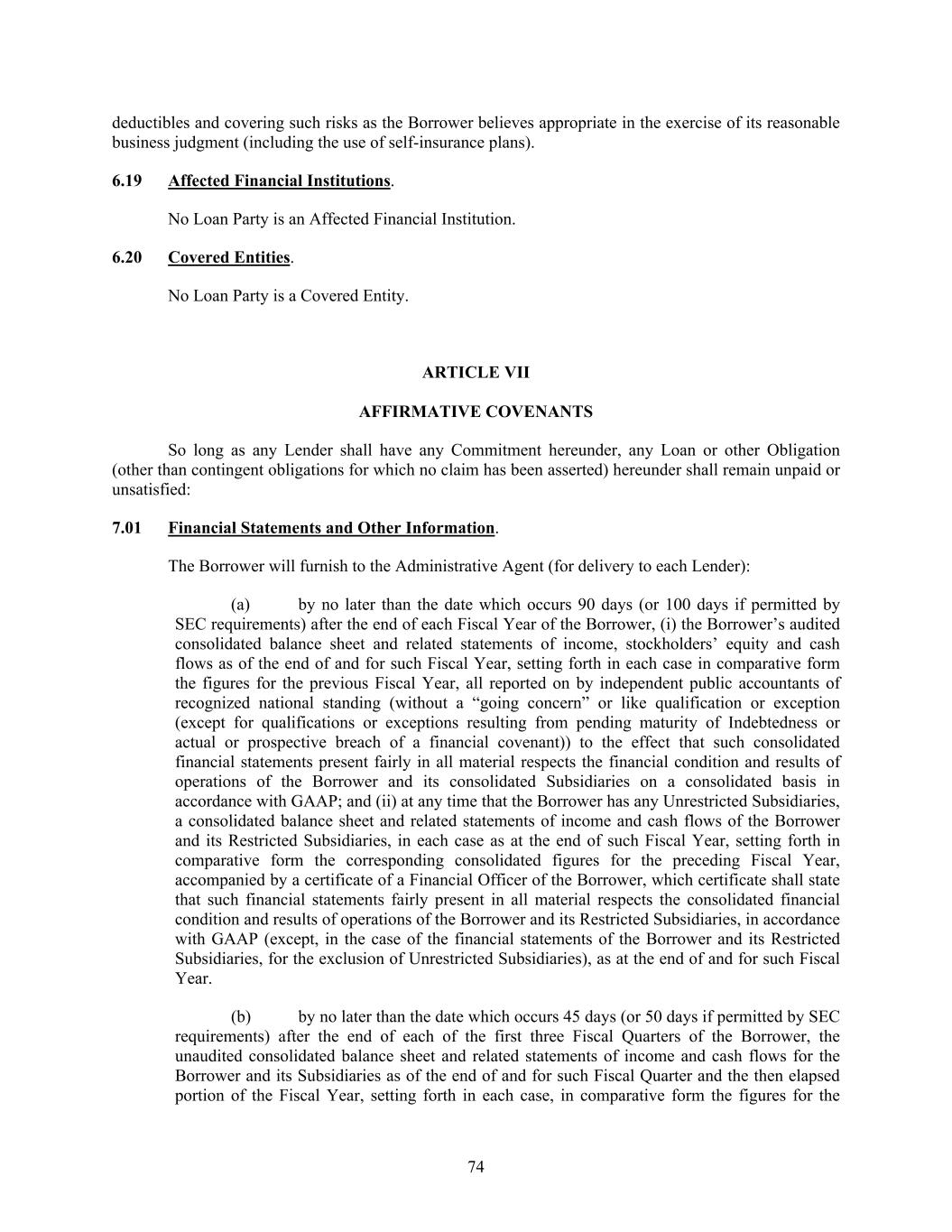74 deductibles and covering such risks as the Borrower believes appropriate in the exercise of its reasonable business judgment (including the use of self-insurance plans). 6.19 Affected Financial Institutions. No Loan Party is an Affected Financial Institution. 6.20 Covered Entities. No Loan Party is a Covered Entity. ARTICLE VII AFFIRMATIVE COVENANTS So long as any Lender shall have any Commitment hereunder, any Loan or other Obligation (other than contingent obligations for which no claim has been asserted) hereunder shall remain unpaid or unsatisfied: 7.01 Financial Statements and Other Information. The Borrower will furnish to the Administrative Agent (for delivery to each Lender): (a) by no later than the date which occurs 90 days (or 100 days if permitted by SEC requirements) after the end of each Fiscal Year of the Borrower, (i) the Borrower’s audited consolidated balance sheet and related statements of income, stockholders’ equity and cash flows as of the end of and for such Fiscal Year, setting forth in each case in comparative form the figures for the previous Fiscal Year, all reported on by independent public accountants of recognized national standing (without a “going concern” or like qualification or exception (except for qualifications or exceptions resulting from pending maturity of Indebtedness or actual or prospective breach of a financial covenant)) to the effect that such consolidated financial statements present fairly in all material respects the financial condition and results of operations of the Borrower and its consolidated Subsidiaries on a consolidated basis in accordance with GAAP; and (ii) at any time that the Borrower has any Unrestricted Subsidiaries, a consolidated balance sheet and related statements of income and cash flows of the Borrower and its Restricted Subsidiaries, in each case as at the end of such Fiscal Year, setting forth in comparative form the corresponding consolidated figures for the preceding Fiscal Year, accompanied by a certificate of a Financial Officer of the Borrower, which certificate shall state that such financial statements fairly present in all material respects the consolidated financial condition and results of operations of the Borrower and its Restricted Subsidiaries, in accordance with GAAP (except, in the case of the financial statements of the Borrower and its Restricted Subsidiaries, for the exclusion of Unrestricted Subsidiaries), as at the end of and for such Fiscal Year. (b) by no later than the date which occurs 45 days (or 50 days if permitted by SEC requirements) after the end of each of the first three Fiscal Quarters of the Borrower, the unaudited consolidated balance sheet and related statements of income and cash flows for the Borrower and its Subsidiaries as of the end of and for such Fiscal Quarter and the then elapsed portion of the Fiscal Year, setting forth in each case, in comparative form the figures for the