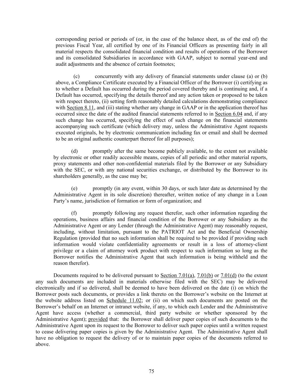 75 corresponding period or periods of (or, in the case of the balance sheet, as of the end of) the previous Fiscal Year, all certified by one of its Financial Officers as presenting fairly in all material respects the consolidated financial condition and results of operations of the Borrower and its consolidated Subsidiaries in accordance with GAAP, subject to normal year-end and audit adjustments and the absence of certain footnotes; (c) concurrently with any delivery of financial statements under clause (a) or (b) above, a Compliance Certificate executed by a Financial Officer of the Borrower (i) certifying as to whether a Default has occurred during the period covered thereby and is continuing and, if a Default has occurred, specifying the details thereof and any action taken or proposed to be taken with respect thereto, (ii) setting forth reasonably detailed calculations demonstrating compliance with Section 8.11, and (iii) stating whether any change in GAAP or in the application thereof has occurred since the date of the audited financial statements referred to in Section 6.04 and, if any such change has occurred, specifying the effect of such change on the financial statements accompanying such certificate (which delivery may, unless the Administrative Agent requests executed originals, be by electronic communication including fax or email and shall be deemed to be an original authentic counterpart thereof for all purposes); (d) promptly after the same become publicly available, to the extent not available by electronic or other readily accessible means, copies of all periodic and other material reports, proxy statements and other non-confidential materials filed by the Borrower or any Subsidiary with the SEC, or with any national securities exchange, or distributed by the Borrower to its shareholders generally, as the case may be; (e) promptly (in any event, within 30 days, or such later date as determined by the Administrative Agent in its sole discretion) thereafter, written notice of any change in a Loan Party’s name, jurisdiction of formation or form of organization; and (f) promptly following any request therefor, such other information regarding the operations, business affairs and financial condition of the Borrower or any Subsidiary as the Administrative Agent or any Lender (through the Administrative Agent) may reasonably request, including, without limitation, pursuant to the PATRIOT Act and the Beneficial Ownership Regulation (provided that no such information shall be required to be provided if providing such information would violate confidentiality agreements or result in a loss of attorney-client privilege or a claim of attorney work product with respect to such information so long as the Borrower notifies the Administrative Agent that such information is being withheld and the reason therefor). Documents required to be delivered pursuant to Section 7.01(a), 7.01(b) or 7.01(d) (to the extent any such documents are included in materials otherwise filed with the SEC) may be delivered electronically and if so delivered, shall be deemed to have been delivered on the date (i) on which the Borrower posts such documents, or provides a link thereto on the Borrower’s website on the Internet at the website address listed on Schedule 11.02; or (ii) on which such documents are posted on the Borrower’s behalf on an Internet or intranet website, if any, to which each Lender and the Administrative Agent have access (whether a commercial, third party website or whether sponsored by the Administrative Agent); provided that: the Borrower shall deliver paper copies of such documents to the Administrative Agent upon its request to the Borrower to deliver such paper copies until a written request to cease delivering paper copies is given by the Administrative Agent. The Administrative Agent shall have no obligation to request the delivery of or to maintain paper copies of the documents referred to above.