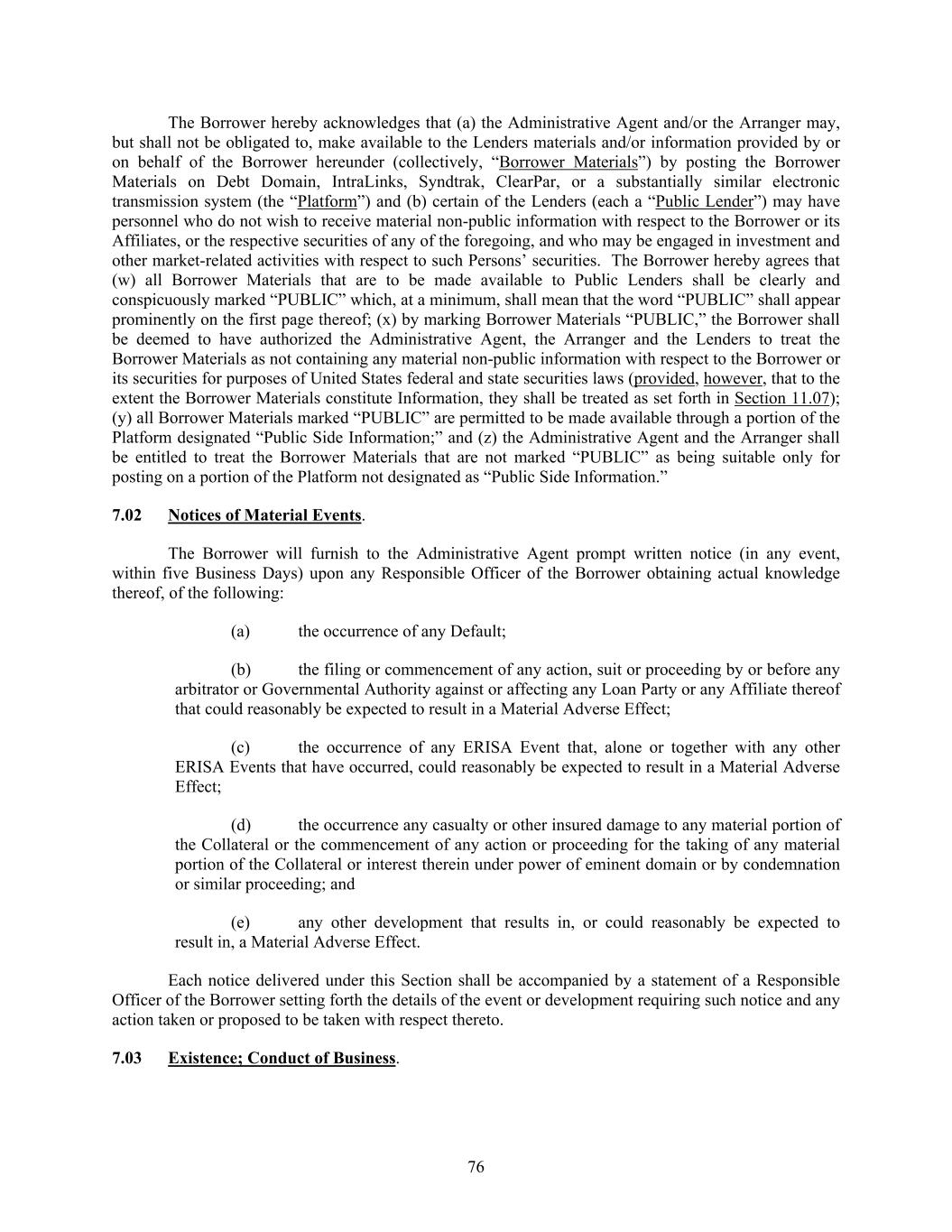76 The Borrower hereby acknowledges that (a) the Administrative Agent and/or the Arranger may, but shall not be obligated to, make available to the Lenders materials and/or information provided by or on behalf of the Borrower hereunder (collectively, “Borrower Materials”) by posting the Borrower Materials on Debt Domain, IntraLinks, Syndtrak, ClearPar, or a substantially similar electronic transmission system (the “Platform”) and (b) certain of the Lenders (each a “Public Lender”) may have personnel who do not wish to receive material non-public information with respect to the Borrower or its Affiliates, or the respective securities of any of the foregoing, and who may be engaged in investment and other market-related activities with respect to such Persons’ securities. The Borrower hereby agrees that (w) all Borrower Materials that are to be made available to Public Lenders shall be clearly and conspicuously marked “PUBLIC” which, at a minimum, shall mean that the word “PUBLIC” shall appear prominently on the first page thereof; (x) by marking Borrower Materials “PUBLIC,” the Borrower shall be deemed to have authorized the Administrative Agent, the Arranger and the Lenders to treat the Borrower Materials as not containing any material non-public information with respect to the Borrower or its securities for purposes of United States federal and state securities laws (provided, however, that to the extent the Borrower Materials constitute Information, they shall be treated as set forth in Section 11.07); (y) all Borrower Materials marked “PUBLIC” are permitted to be made available through a portion of the Platform designated “Public Side Information;” and (z) the Administrative Agent and the Arranger shall be entitled to treat the Borrower Materials that are not marked “PUBLIC” as being suitable only for posting on a portion of the Platform not designated as “Public Side Information.” 7.02 Notices of Material Events. The Borrower will furnish to the Administrative Agent prompt written notice (in any event, within five Business Days) upon any Responsible Officer of the Borrower obtaining actual knowledge thereof, of the following: (a) the occurrence of any Default; (b) the filing or commencement of any action, suit or proceeding by or before any arbitrator or Governmental Authority against or affecting any Loan Party or any Affiliate thereof that could reasonably be expected to result in a Material Adverse Effect; (c) the occurrence of any ERISA Event that, alone or together with any other ERISA Events that have occurred, could reasonably be expected to result in a Material Adverse Effect; (d) the occurrence any casualty or other insured damage to any material portion of the Collateral or the commencement of any action or proceeding for the taking of any material portion of the Collateral or interest therein under power of eminent domain or by condemnation or similar proceeding; and (e) any other development that results in, or could reasonably be expected to result in, a Material Adverse Effect. Each notice delivered under this Section shall be accompanied by a statement of a Responsible Officer of the Borrower setting forth the details of the event or development requiring such notice and any action taken or proposed to be taken with respect thereto. 7.03 Existence; Conduct of Business.