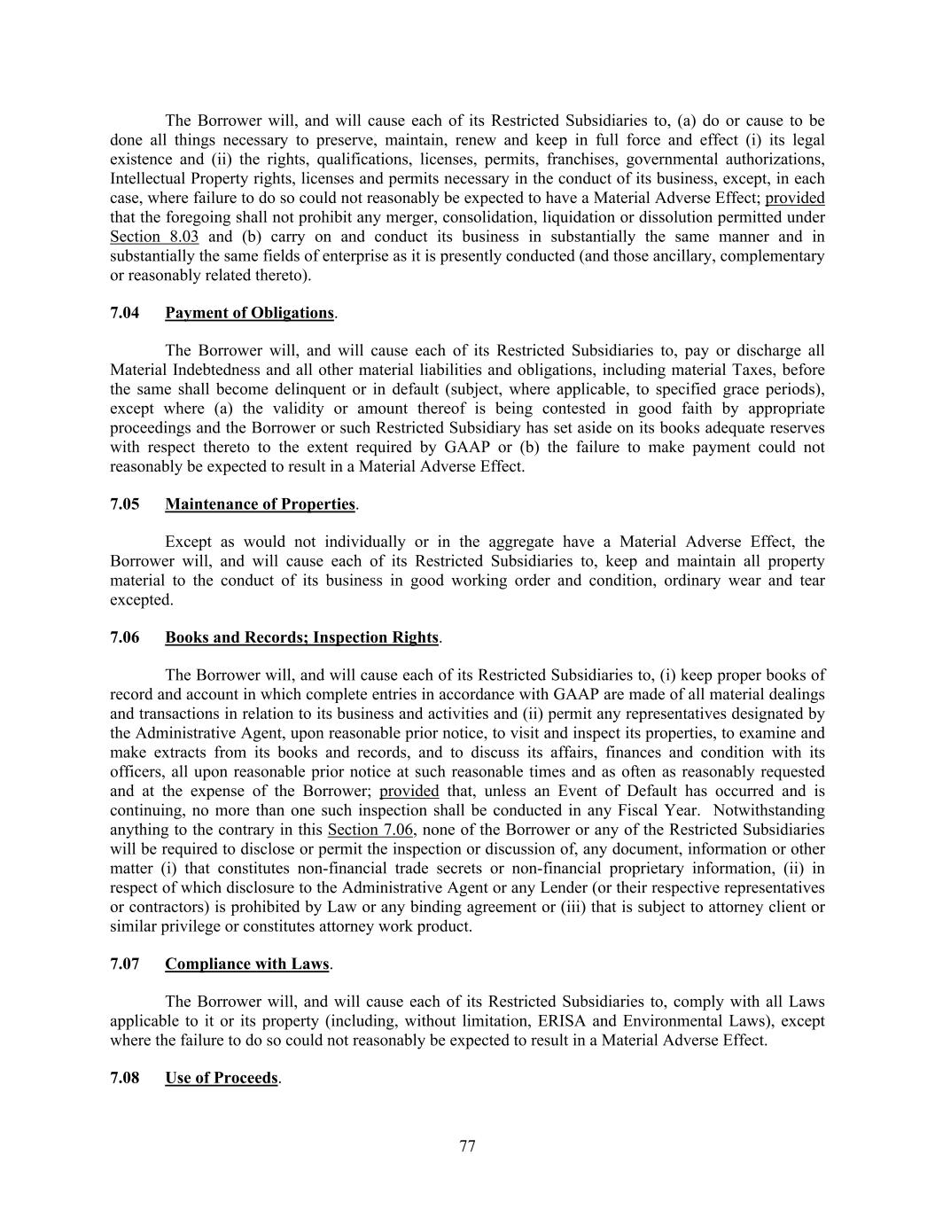 77 The Borrower will, and will cause each of its Restricted Subsidiaries to, (a) do or cause to be done all things necessary to preserve, maintain, renew and keep in full force and effect (i) its legal existence and (ii) the rights, qualifications, licenses, permits, franchises, governmental authorizations, Intellectual Property rights, licenses and permits necessary in the conduct of its business, except, in each case, where failure to do so could not reasonably be expected to have a Material Adverse Effect; provided that the foregoing shall not prohibit any merger, consolidation, liquidation or dissolution permitted under Section 8.03 and (b) carry on and conduct its business in substantially the same manner and in substantially the same fields of enterprise as it is presently conducted (and those ancillary, complementary or reasonably related thereto). 7.04 Payment of Obligations. The Borrower will, and will cause each of its Restricted Subsidiaries to, pay or discharge all Material Indebtedness and all other material liabilities and obligations, including material Taxes, before the same shall become delinquent or in default (subject, where applicable, to specified grace periods), except where (a) the validity or amount thereof is being contested in good faith by appropriate proceedings and the Borrower or such Restricted Subsidiary has set aside on its books adequate reserves with respect thereto to the extent required by GAAP or (b) the failure to make payment could not reasonably be expected to result in a Material Adverse Effect. 7.05 Maintenance of Properties. Except as would not individually or in the aggregate have a Material Adverse Effect, the Borrower will, and will cause each of its Restricted Subsidiaries to, keep and maintain all property material to the conduct of its business in good working order and condition, ordinary wear and tear excepted. 7.06 Books and Records; Inspection Rights. The Borrower will, and will cause each of its Restricted Subsidiaries to, (i) keep proper books of record and account in which complete entries in accordance with GAAP are made of all material dealings and transactions in relation to its business and activities and (ii) permit any representatives designated by the Administrative Agent, upon reasonable prior notice, to visit and inspect its properties, to examine and make extracts from its books and records, and to discuss its affairs, finances and condition with its officers, all upon reasonable prior notice at such reasonable times and as often as reasonably requested and at the expense of the Borrower; provided that, unless an Event of Default has occurred and is continuing, no more than one such inspection shall be conducted in any Fiscal Year. Notwithstanding anything to the contrary in this Section 7.06, none of the Borrower or any of the Restricted Subsidiaries will be required to disclose or permit the inspection or discussion of, any document, information or other matter (i) that constitutes non-financial trade secrets or non-financial proprietary information, (ii) in respect of which disclosure to the Administrative Agent or any Lender (or their respective representatives or contractors) is prohibited by Law or any binding agreement or (iii) that is subject to attorney client or similar privilege or constitutes attorney work product. 7.07 Compliance with Laws. The Borrower will, and will cause each of its Restricted Subsidiaries to, comply with all Laws applicable to it or its property (including, without limitation, ERISA and Environmental Laws), except where the failure to do so could not reasonably be expected to result in a Material Adverse Effect. 7.08 Use of Proceeds.