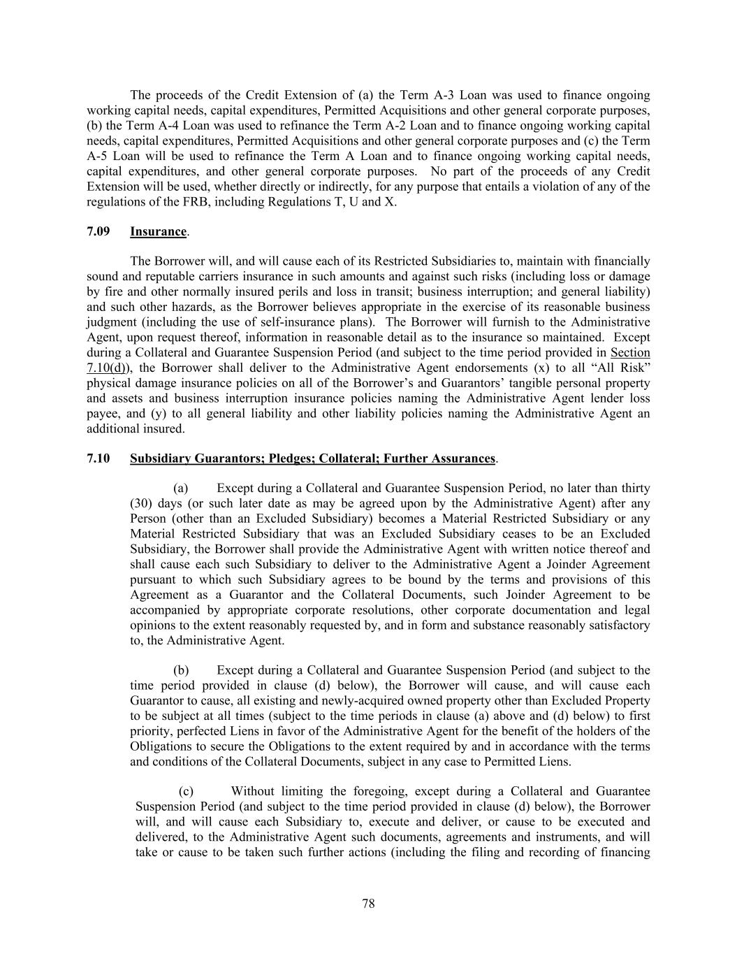 78 The proceeds of the Credit Extension of (a) the Term A-3 Loan was used to finance ongoing working capital needs, capital expenditures, Permitted Acquisitions and other general corporate purposes, (b) the Term A-4 Loan was used to refinance the Term A-2 Loan and to finance ongoing working capital needs, capital expenditures, Permitted Acquisitions and other general corporate purposes and (c) the Term A-5 Loan will be used to refinance the Term A Loan and to finance ongoing working capital needs, capital expenditures, and other general corporate purposes. No part of the proceeds of any Credit Extension will be used, whether directly or indirectly, for any purpose that entails a violation of any of the regulations of the FRB, including Regulations T, U and X. 7.09 Insurance. The Borrower will, and will cause each of its Restricted Subsidiaries to, maintain with financially sound and reputable carriers insurance in such amounts and against such risks (including loss or damage by fire and other normally insured perils and loss in transit; business interruption; and general liability) and such other hazards, as the Borrower believes appropriate in the exercise of its reasonable business judgment (including the use of self-insurance plans). The Borrower will furnish to the Administrative Agent, upon request thereof, information in reasonable detail as to the insurance so maintained. Except during a Collateral and Guarantee Suspension Period (and subject to the time period provided in Section 7.10(d)), the Borrower shall deliver to the Administrative Agent endorsements (x) to all “All Risk” physical damage insurance policies on all of the Borrower’s and Guarantors’ tangible personal property and assets and business interruption insurance policies naming the Administrative Agent lender loss payee, and (y) to all general liability and other liability policies naming the Administrative Agent an additional insured. 7.10 Subsidiary Guarantors; Pledges; Collateral; Further Assurances. (a) Except during a Collateral and Guarantee Suspension Period, no later than thirty (30) days (or such later date as may be agreed upon by the Administrative Agent) after any Person (other than an Excluded Subsidiary) becomes a Material Restricted Subsidiary or any Material Restricted Subsidiary that was an Excluded Subsidiary ceases to be an Excluded Subsidiary, the Borrower shall provide the Administrative Agent with written notice thereof and shall cause each such Subsidiary to deliver to the Administrative Agent a Joinder Agreement pursuant to which such Subsidiary agrees to be bound by the terms and provisions of this Agreement as a Guarantor and the Collateral Documents, such Joinder Agreement to be accompanied by appropriate corporate resolutions, other corporate documentation and legal opinions to the extent reasonably requested by, and in form and substance reasonably satisfactory to, the Administrative Agent. (b) Except during a Collateral and Guarantee Suspension Period (and subject to the time period provided in clause (d) below), the Borrower will cause, and will cause each Guarantor to cause, all existing and newly-acquired owned property other than Excluded Property to be subject at all times (subject to the time periods in clause (a) above and (d) below) to first priority, perfected Liens in favor of the Administrative Agent for the benefit of the holders of the Obligations to secure the Obligations to the extent required by and in accordance with the terms and conditions of the Collateral Documents, subject in any case to Permitted Liens. (c) Without limiting the foregoing, except during a Collateral and Guarantee Suspension Period (and subject to the time period provided in clause (d) below), the Borrower will, and will cause each Subsidiary to, execute and deliver, or cause to be executed and delivered, to the Administrative Agent such documents, agreements and instruments, and will take or cause to be taken such further actions (including the filing and recording of financing