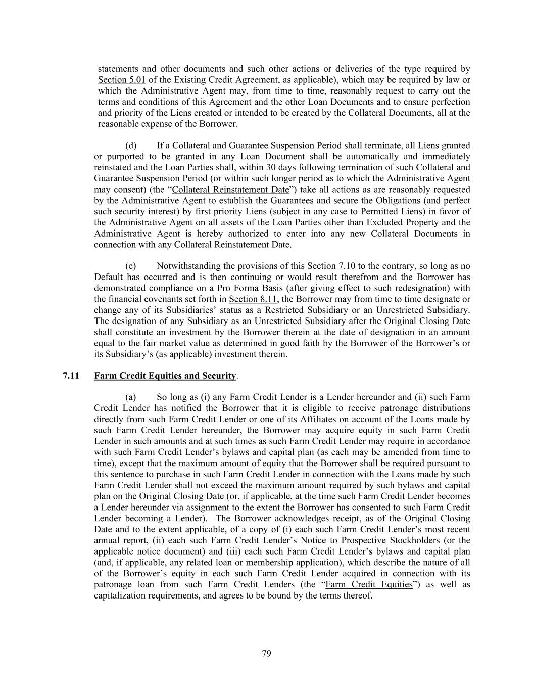 79 statements and other documents and such other actions or deliveries of the type required by Section 5.01 of the Existing Credit Agreement, as applicable), which may be required by law or which the Administrative Agent may, from time to time, reasonably request to carry out the terms and conditions of this Agreement and the other Loan Documents and to ensure perfection and priority of the Liens created or intended to be created by the Collateral Documents, all at the reasonable expense of the Borrower. (d) If a Collateral and Guarantee Suspension Period shall terminate, all Liens granted or purported to be granted in any Loan Document shall be automatically and immediately reinstated and the Loan Parties shall, within 30 days following termination of such Collateral and Guarantee Suspension Period (or within such longer period as to which the Administrative Agent may consent) (the “Collateral Reinstatement Date”) take all actions as are reasonably requested by the Administrative Agent to establish the Guarantees and secure the Obligations (and perfect such security interest) by first priority Liens (subject in any case to Permitted Liens) in favor of the Administrative Agent on all assets of the Loan Parties other than Excluded Property and the Administrative Agent is hereby authorized to enter into any new Collateral Documents in connection with any Collateral Reinstatement Date. (e) Notwithstanding the provisions of this Section 7.10 to the contrary, so long as no Default has occurred and is then continuing or would result therefrom and the Borrower has demonstrated compliance on a Pro Forma Basis (after giving effect to such redesignation) with the financial covenants set forth in Section 8.11, the Borrower may from time to time designate or change any of its Subsidiaries’ status as a Restricted Subsidiary or an Unrestricted Subsidiary. The designation of any Subsidiary as an Unrestricted Subsidiary after the Original Closing Date shall constitute an investment by the Borrower therein at the date of designation in an amount equal to the fair market value as determined in good faith by the Borrower of the Borrower’s or its Subsidiary’s (as applicable) investment therein. 7.11 Farm Credit Equities and Security. (a) So long as (i) any Farm Credit Lender is a Lender hereunder and (ii) such Farm Credit Lender has notified the Borrower that it is eligible to receive patronage distributions directly from such Farm Credit Lender or one of its Affiliates on account of the Loans made by such Farm Credit Lender hereunder, the Borrower may acquire equity in such Farm Credit Lender in such amounts and at such times as such Farm Credit Lender may require in accordance with such Farm Credit Lender’s bylaws and capital plan (as each may be amended from time to time), except that the maximum amount of equity that the Borrower shall be required pursuant to this sentence to purchase in such Farm Credit Lender in connection with the Loans made by such Farm Credit Lender shall not exceed the maximum amount required by such bylaws and capital plan on the Original Closing Date (or, if applicable, at the time such Farm Credit Lender becomes a Lender hereunder via assignment to the extent the Borrower has consented to such Farm Credit Lender becoming a Lender). The Borrower acknowledges receipt, as of the Original Closing Date and to the extent applicable, of a copy of (i) each such Farm Credit Lender’s most recent annual report, (ii) each such Farm Credit Lender’s Notice to Prospective Stockholders (or the applicable notice document) and (iii) each such Farm Credit Lender’s bylaws and capital plan (and, if applicable, any related loan or membership application), which describe the nature of all of the Borrower’s equity in each such Farm Credit Lender acquired in connection with its patronage loan from such Farm Credit Lenders (the “Farm Credit Equities”) as well as capitalization requirements, and agrees to be bound by the terms thereof.