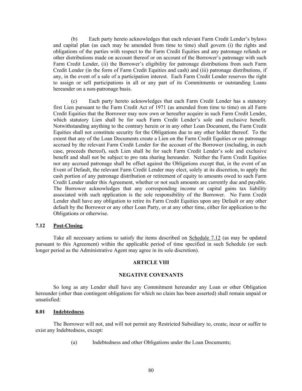 80 (b) Each party hereto acknowledges that each relevant Farm Credit Lender’s bylaws and capital plan (as each may be amended from time to time) shall govern (i) the rights and obligations of the parties with respect to the Farm Credit Equities and any patronage refunds or other distributions made on account thereof or on account of the Borrower’s patronage with such Farm Credit Lender, (ii) the Borrower’s eligibility for patronage distributions from such Farm Credit Lender (in the form of Farm Credit Equities and cash) and (iii) patronage distributions, if any, in the event of a sale of a participation interest. Each Farm Credit Lender reserves the right to assign or sell participations in all or any part of its Commitments or outstanding Loans hereunder on a non-patronage basis. (c) Each party hereto acknowledges that each Farm Credit Lender has a statutory first Lien pursuant to the Farm Credit Act of 1971 (as amended from time to time) on all Farm Credit Equities that the Borrower may now own or hereafter acquire in such Farm Credit Lender, which statutory Lien shall be for such Farm Credit Lender’s sole and exclusive benefit. Notwithstanding anything to the contrary herein or in any other Loan Document, the Farm Credit Equities shall not constitute security for the Obligations due to any other holder thereof. To the extent that any of the Loan Documents create a Lien on the Farm Credit Equities or on patronage accrued by the relevant Farm Credit Lender for the account of the Borrower (including, in each case, proceeds thereof), such Lien shall be for such Farm Credit Lender’s sole and exclusive benefit and shall not be subject to pro rata sharing hereunder. Neither the Farm Credit Equities nor any accrued patronage shall be offset against the Obligations except that, in the event of an Event of Default, the relevant Farm Credit Lender may elect, solely at its discretion, to apply the cash portion of any patronage distribution or retirement of equity to amounts owed to such Farm Credit Lender under this Agreement, whether or not such amounts are currently due and payable. The Borrower acknowledges that any corresponding income or capital gains tax liability associated with such application is the sole responsibility of the Borrower. No Farm Credit Lender shall have any obligation to retire its Farm Credit Equities upon any Default or any other default by the Borrower or any other Loan Party, or at any other time, either for application to the Obligations or otherwise. 7.12 Post-Closing. Take all necessary actions to satisfy the items described on Schedule 7.12 (as may be updated pursuant to this Agreement) within the applicable period of time specified in such Schedule (or such longer period as the Administrative Agent may agree in its sole discretion). ARTICLE VIII NEGATIVE COVENANTS So long as any Lender shall have any Commitment hereunder any Loan or other Obligation hereunder (other than contingent obligations for which no claim has been asserted) shall remain unpaid or unsatisfied: 8.01 Indebtedness. The Borrower will not, and will not permit any Restricted Subsidiary to, create, incur or suffer to exist any Indebtedness, except: (a) Indebtedness and other Obligations under the Loan Documents;