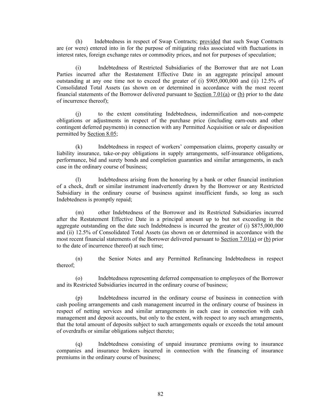 82 (h) Indebtedness in respect of Swap Contracts; provided that such Swap Contracts are (or were) entered into in for the purpose of mitigating risks associated with fluctuations in interest rates, foreign exchange rates or commodity prices, and not for purposes of speculation; (i) Indebtedness of Restricted Subsidiaries of the Borrower that are not Loan Parties incurred after the Restatement Effective Date in an aggregate principal amount outstanding at any one time not to exceed the greater of (i) $905,000,000 and (ii) 12.5% of Consolidated Total Assets (as shown on or determined in accordance with the most recent financial statements of the Borrower delivered pursuant to Section 7.01(a) or (b) prior to the date of incurrence thereof); (j) to the extent constituting Indebtedness, indemnification and non-compete obligations or adjustments in respect of the purchase price (including earn-outs and other contingent deferred payments) in connection with any Permitted Acquisition or sale or disposition permitted by Section 8.05; (k) Indebtedness in respect of workers’ compensation claims, property casualty or liability insurance, take-or-pay obligations in supply arrangements, self-insurance obligations, performance, bid and surety bonds and completion guaranties and similar arrangements, in each case in the ordinary course of business; (l) Indebtedness arising from the honoring by a bank or other financial institution of a check, draft or similar instrument inadvertently drawn by the Borrower or any Restricted Subsidiary in the ordinary course of business against insufficient funds, so long as such Indebtedness is promptly repaid; (m) other Indebtedness of the Borrower and its Restricted Subsidiaries incurred after the Restatement Effective Date in a principal amount up to but not exceeding in the aggregate outstanding on the date such Indebtedness is incurred the greater of (i) $875,000,000 and (ii) 12.5% of Consolidated Total Assets (as shown on or determined in accordance with the most recent financial statements of the Borrower delivered pursuant to Section 7.01(a) or (b) prior to the date of incurrence thereof) at such time; (n) the Senior Notes and any Permitted Refinancing Indebtedness in respect thereof; (o) Indebtedness representing deferred compensation to employees of the Borrower and its Restricted Subsidiaries incurred in the ordinary course of business; (p) Indebtedness incurred in the ordinary course of business in connection with cash pooling arrangements and cash management incurred in the ordinary course of business in respect of netting services and similar arrangements in each case in connection with cash management and deposit accounts, but only to the extent, with respect to any such arrangements, that the total amount of deposits subject to such arrangements equals or exceeds the total amount of overdrafts or similar obligations subject thereto; (q) Indebtedness consisting of unpaid insurance premiums owing to insurance companies and insurance brokers incurred in connection with the financing of insurance premiums in the ordinary course of business;