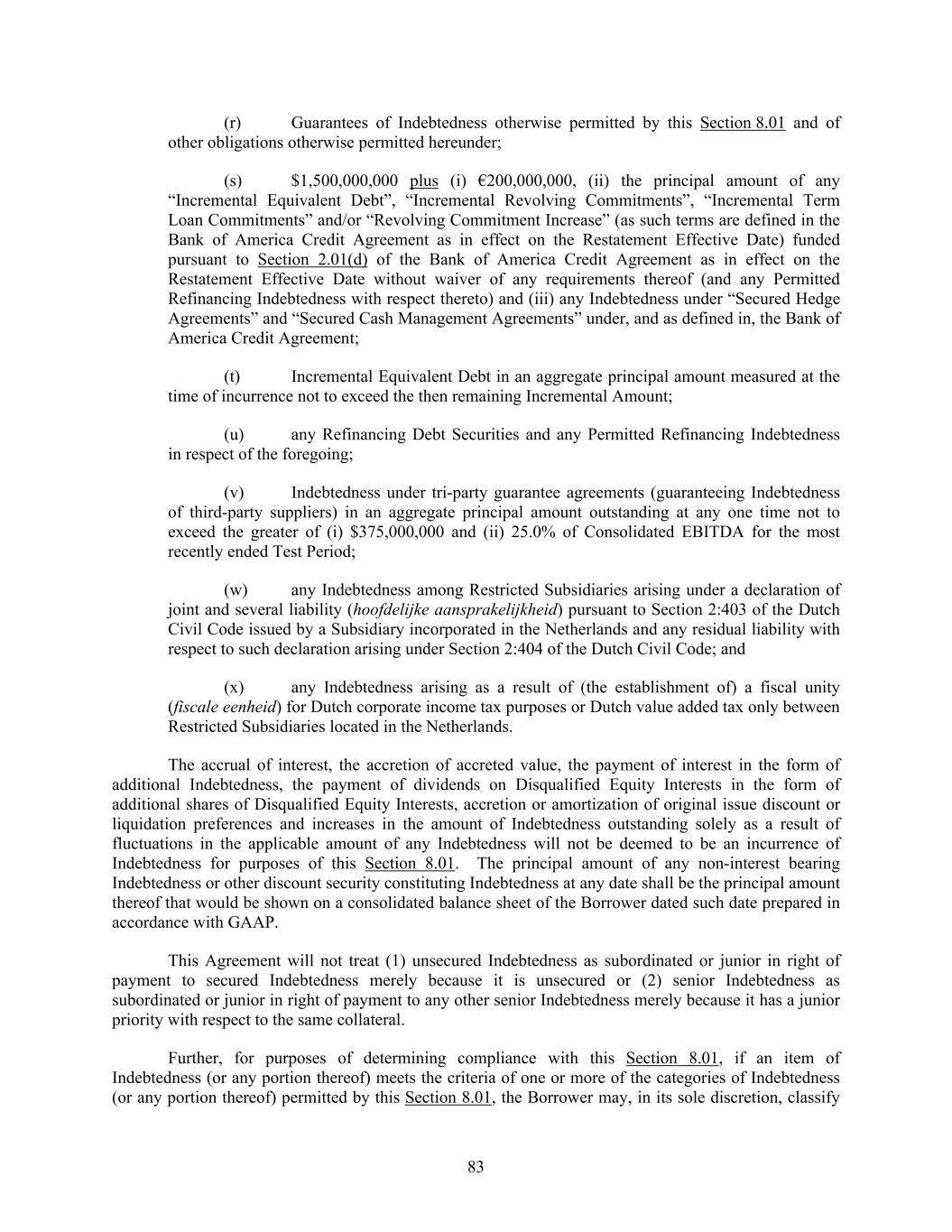 83 (r) Guarantees of Indebtedness otherwise permitted by this Section 8.01 and of other obligations otherwise permitted hereunder; (s) $1,500,000,000 plus (i) €200,000,000, (ii) the principal amount of any “Incremental Equivalent Debt”, “Incremental Revolving Commitments”, “Incremental Term Loan Commitments” and/or “Revolving Commitment Increase” (as such terms are defined in the Bank of America Credit Agreement as in effect on the Restatement Effective Date) funded pursuant to Section 2.01(d) of the Bank of America Credit Agreement as in effect on the Restatement Effective Date without waiver of any requirements thereof (and any Permitted Refinancing Indebtedness with respect thereto) and (iii) any Indebtedness under “Secured Hedge Agreements” and “Secured Cash Management Agreements” under, and as defined in, the Bank of America Credit Agreement; (t) Incremental Equivalent Debt in an aggregate principal amount measured at the time of incurrence not to exceed the then remaining Incremental Amount; (u) any Refinancing Debt Securities and any Permitted Refinancing Indebtedness in respect of the foregoing; (v) Indebtedness under tri-party guarantee agreements (guaranteeing Indebtedness of third-party suppliers) in an aggregate principal amount outstanding at any one time not to exceed the greater of (i) $375,000,000 and (ii) 25.0% of Consolidated EBITDA for the most recently ended Test Period; (w) any Indebtedness among Restricted Subsidiaries arising under a declaration of joint and several liability (hoofdelijke aansprakelijkheid) pursuant to Section 2:403 of the Dutch Civil Code issued by a Subsidiary incorporated in the Netherlands and any residual liability with respect to such declaration arising under Section 2:404 of the Dutch Civil Code; and (x) any Indebtedness arising as a result of (the establishment of) a fiscal unity (fiscale eenheid) for Dutch corporate income tax purposes or Dutch value added tax only between Restricted Subsidiaries located in the Netherlands. The accrual of interest, the accretion of accreted value, the payment of interest in the form of additional Indebtedness, the payment of dividends on Disqualified Equity Interests in the form of additional shares of Disqualified Equity Interests, accretion or amortization of original issue discount or liquidation preferences and increases in the amount of Indebtedness outstanding solely as a result of fluctuations in the applicable amount of any Indebtedness will not be deemed to be an incurrence of Indebtedness for purposes of this Section 8.01. The principal amount of any non-interest bearing Indebtedness or other discount security constituting Indebtedness at any date shall be the principal amount thereof that would be shown on a consolidated balance sheet of the Borrower dated such date prepared in accordance with GAAP. This Agreement will not treat (1) unsecured Indebtedness as subordinated or junior in right of payment to secured Indebtedness merely because it is unsecured or (2) senior Indebtedness as subordinated or junior in right of payment to any other senior Indebtedness merely because it has a junior priority with respect to the same collateral. Further, for purposes of determining compliance with this Section 8.01, if an item of Indebtedness (or any portion thereof) meets the criteria of one or more of the categories of Indebtedness (or any portion thereof) permitted by this Section 8.01, the Borrower may, in its sole discretion, classify