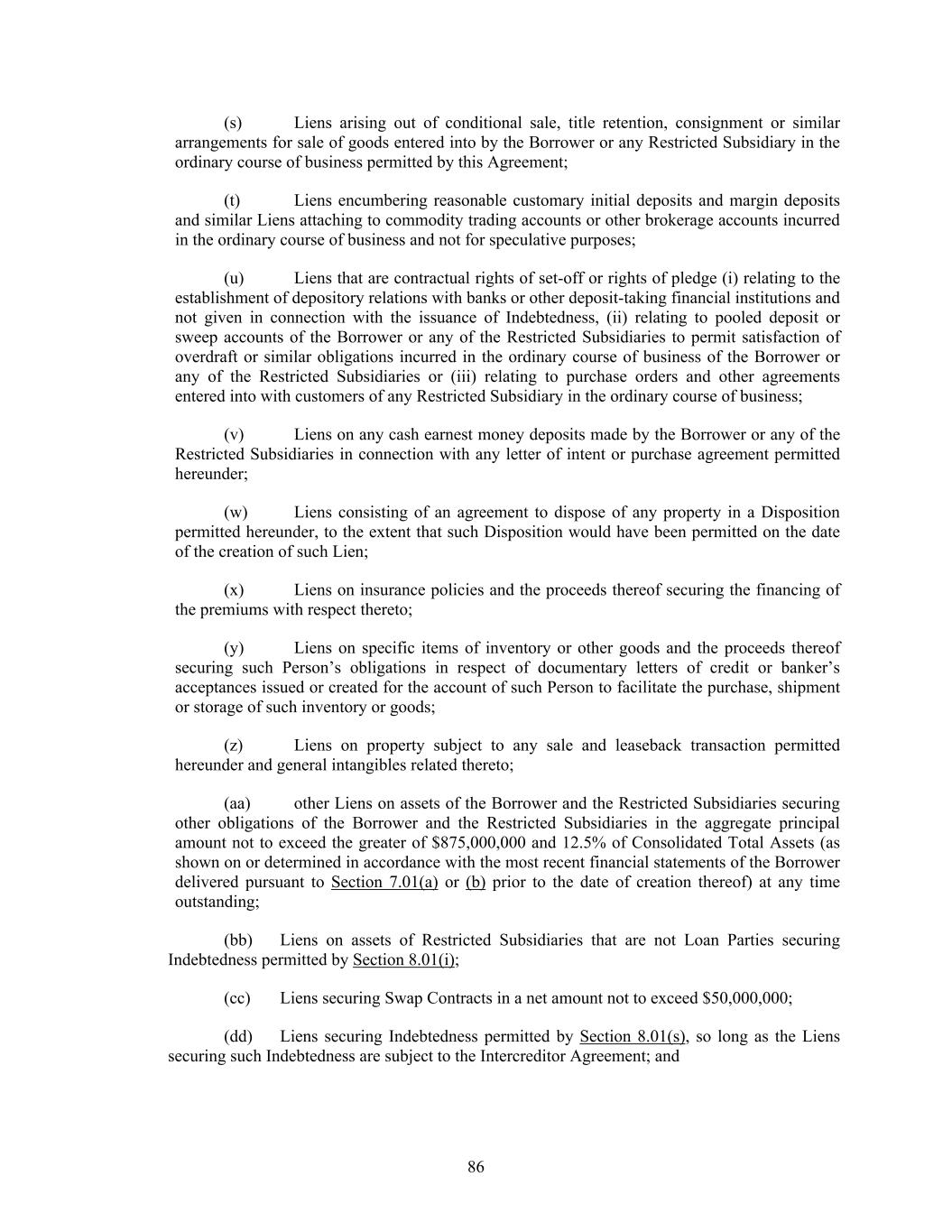 86 (s) Liens arising out of conditional sale, title retention, consignment or similar arrangements for sale of goods entered into by the Borrower or any Restricted Subsidiary in the ordinary course of business permitted by this Agreement; (t) Liens encumbering reasonable customary initial deposits and margin deposits and similar Liens attaching to commodity trading accounts or other brokerage accounts incurred in the ordinary course of business and not for speculative purposes; (u) Liens that are contractual rights of set-off or rights of pledge (i) relating to the establishment of depository relations with banks or other deposit-taking financial institutions and not given in connection with the issuance of Indebtedness, (ii) relating to pooled deposit or sweep accounts of the Borrower or any of the Restricted Subsidiaries to permit satisfaction of overdraft or similar obligations incurred in the ordinary course of business of the Borrower or any of the Restricted Subsidiaries or (iii) relating to purchase orders and other agreements entered into with customers of any Restricted Subsidiary in the ordinary course of business; (v) Liens on any cash earnest money deposits made by the Borrower or any of the Restricted Subsidiaries in connection with any letter of intent or purchase agreement permitted hereunder; (w) Liens consisting of an agreement to dispose of any property in a Disposition permitted hereunder, to the extent that such Disposition would have been permitted on the date of the creation of such Lien; (x) Liens on insurance policies and the proceeds thereof securing the financing of the premiums with respect thereto; (y) Liens on specific items of inventory or other goods and the proceeds thereof securing such Person’s obligations in respect of documentary letters of credit or banker’s acceptances issued or created for the account of such Person to facilitate the purchase, shipment or storage of such inventory or goods; (z) Liens on property subject to any sale and leaseback transaction permitted hereunder and general intangibles related thereto; (aa) other Liens on assets of the Borrower and the Restricted Subsidiaries securing other obligations of the Borrower and the Restricted Subsidiaries in the aggregate principal amount not to exceed the greater of $875,000,000 and 12.5% of Consolidated Total Assets (as shown on or determined in accordance with the most recent financial statements of the Borrower delivered pursuant to Section 7.01(a) or (b) prior to the date of creation thereof) at any time outstanding; (bb) Liens on assets of Restricted Subsidiaries that are not Loan Parties securing Indebtedness permitted by Section 8.01(i); (cc) Liens securing Swap Contracts in a net amount not to exceed $50,000,000; (dd) Liens securing Indebtedness permitted by Section 8.01(s), so long as the Liens securing such Indebtedness are subject to the Intercreditor Agreement; and