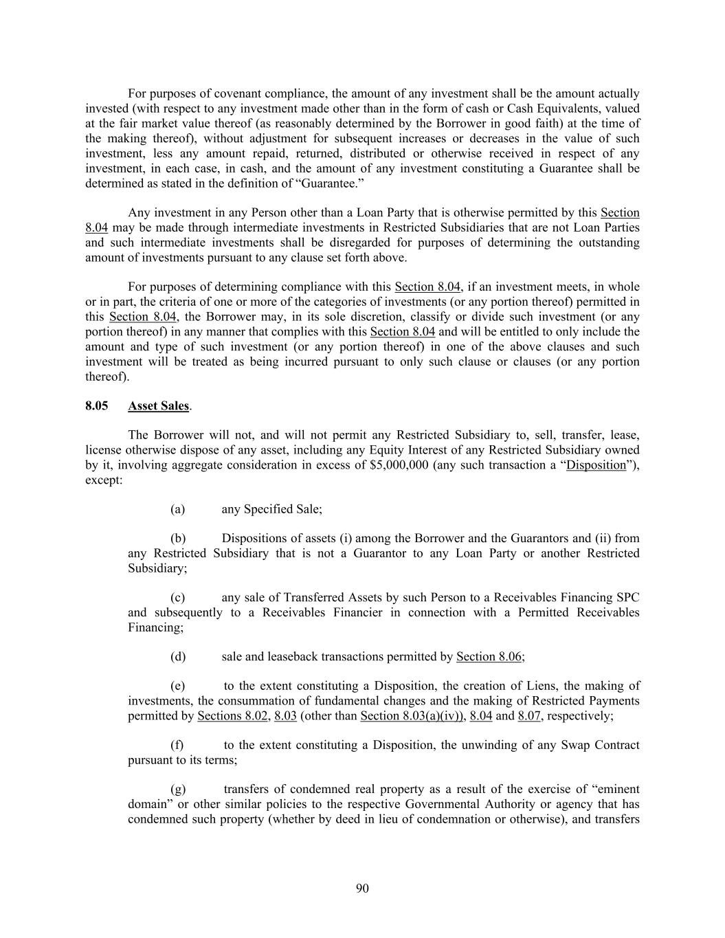 90 For purposes of covenant compliance, the amount of any investment shall be the amount actually invested (with respect to any investment made other than in the form of cash or Cash Equivalents, valued at the fair market value thereof (as reasonably determined by the Borrower in good faith) at the time of the making thereof), without adjustment for subsequent increases or decreases in the value of such investment, less any amount repaid, returned, distributed or otherwise received in respect of any investment, in each case, in cash, and the amount of any investment constituting a Guarantee shall be determined as stated in the definition of “Guarantee.” Any investment in any Person other than a Loan Party that is otherwise permitted by this Section 8.04 may be made through intermediate investments in Restricted Subsidiaries that are not Loan Parties and such intermediate investments shall be disregarded for purposes of determining the outstanding amount of investments pursuant to any clause set forth above. For purposes of determining compliance with this Section 8.04, if an investment meets, in whole or in part, the criteria of one or more of the categories of investments (or any portion thereof) permitted in this Section 8.04, the Borrower may, in its sole discretion, classify or divide such investment (or any portion thereof) in any manner that complies with this Section 8.04 and will be entitled to only include the amount and type of such investment (or any portion thereof) in one of the above clauses and such investment will be treated as being incurred pursuant to only such clause or clauses (or any portion thereof). 8.05 Asset Sales. The Borrower will not, and will not permit any Restricted Subsidiary to, sell, transfer, lease, license otherwise dispose of any asset, including any Equity Interest of any Restricted Subsidiary owned by it, involving aggregate consideration in excess of $5,000,000 (any such transaction a “Disposition”), except: (a) any Specified Sale; (b) Dispositions of assets (i) among the Borrower and the Guarantors and (ii) from any Restricted Subsidiary that is not a Guarantor to any Loan Party or another Restricted Subsidiary; (c) any sale of Transferred Assets by such Person to a Receivables Financing SPC and subsequently to a Receivables Financier in connection with a Permitted Receivables Financing; (d) sale and leaseback transactions permitted by Section 8.06; (e) to the extent constituting a Disposition, the creation of Liens, the making of investments, the consummation of fundamental changes and the making of Restricted Payments permitted by Sections 8.02, 8.03 (other than Section 8.03(a)(iv)), 8.04 and 8.07, respectively; (f) to the extent constituting a Disposition, the unwinding of any Swap Contract pursuant to its terms; (g) transfers of condemned real property as a result of the exercise of “eminent domain” or other similar policies to the respective Governmental Authority or agency that has condemned such property (whether by deed in lieu of condemnation or otherwise), and transfers