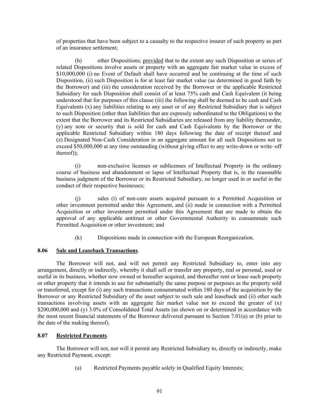91 of properties that have been subject to a casualty to the respective insurer of such property as part of an insurance settlement; (h) other Dispositions; provided that to the extent any such Disposition or series of related Dispositions involve assets or property with an aggregate fair market value in excess of $10,000,000 (i) no Event of Default shall have occurred and be continuing at the time of such Disposition, (ii) such Disposition is for at least fair market value (as determined in good faith by the Borrower) and (iii) the consideration received by the Borrower or the applicable Restricted Subsidiary for such Disposition shall consist of at least 75% cash and Cash Equivalent (it being understood that for purposes of this clause (iii) the following shall be deemed to be cash and Cash Equivalents (x) any liabilities relating to any asset or of any Restricted Subsidiary that is subject to such Disposition (other than liabilities that are expressly subordinated to the Obligations) to the extent that the Borrower and its Restricted Subsidiaries are released from any liability thereunder, (y) any note or security that is sold for cash and Cash Equivalents by the Borrower or the applicable Restricted Subsidiary within 180 days following the date of receipt thereof and (z) Designated Non-Cash Consideration in an aggregate amount for all such Dispositions not to exceed $50,000,000 at any time outstanding (without giving effect to any write-down or write–off thereof)); (i) non-exclusive licenses or sublicenses of Intellectual Property in the ordinary course of business and abandonment or lapse of Intellectual Property that is, in the reasonable business judgment of the Borrower or its Restricted Subsidiary, no longer used in or useful in the conduct of their respective businesses; (j) sales (i) of non-core assets acquired pursuant to a Permitted Acquisition or other investment permitted under this Agreement, and (ii) made in connection with a Permitted Acquisition or other investment permitted under this Agreement that are made to obtain the approval of any applicable antitrust or other Governmental Authority to consummate such Permitted Acquisition or other investment; and (k) Dispositions made in connection with the European Reorganization. 8.06 Sale and Leaseback Transactions. The Borrower will not, and will not permit any Restricted Subsidiary to, enter into any arrangement, directly or indirectly, whereby it shall sell or transfer any property, real or personal, used or useful in its business, whether now owned or hereafter acquired, and thereafter rent or lease such property or other property that it intends to use for substantially the same purpose or purposes as the property sold or transferred, except for (i) any such transactions consummated within 180 days of the acquisition by the Borrower or any Restricted Subsidiary of the asset subject to such sale and leaseback and (ii) other such transactions involving assets with an aggregate fair market value not to exceed the greater of (x) $200,000,000 and (y) 3.0% of Consolidated Total Assets (as shown on or determined in accordance with the most recent financial statements of the Borrower delivered pursuant to Section 7.01(a) or (b) prior to the date of the making thereof). 8.07 Restricted Payments. The Borrower will not, nor will it permit any Restricted Subsidiary to, directly or indirectly, make any Restricted Payment, except: (a) Restricted Payments payable solely in Qualified Equity Interests;