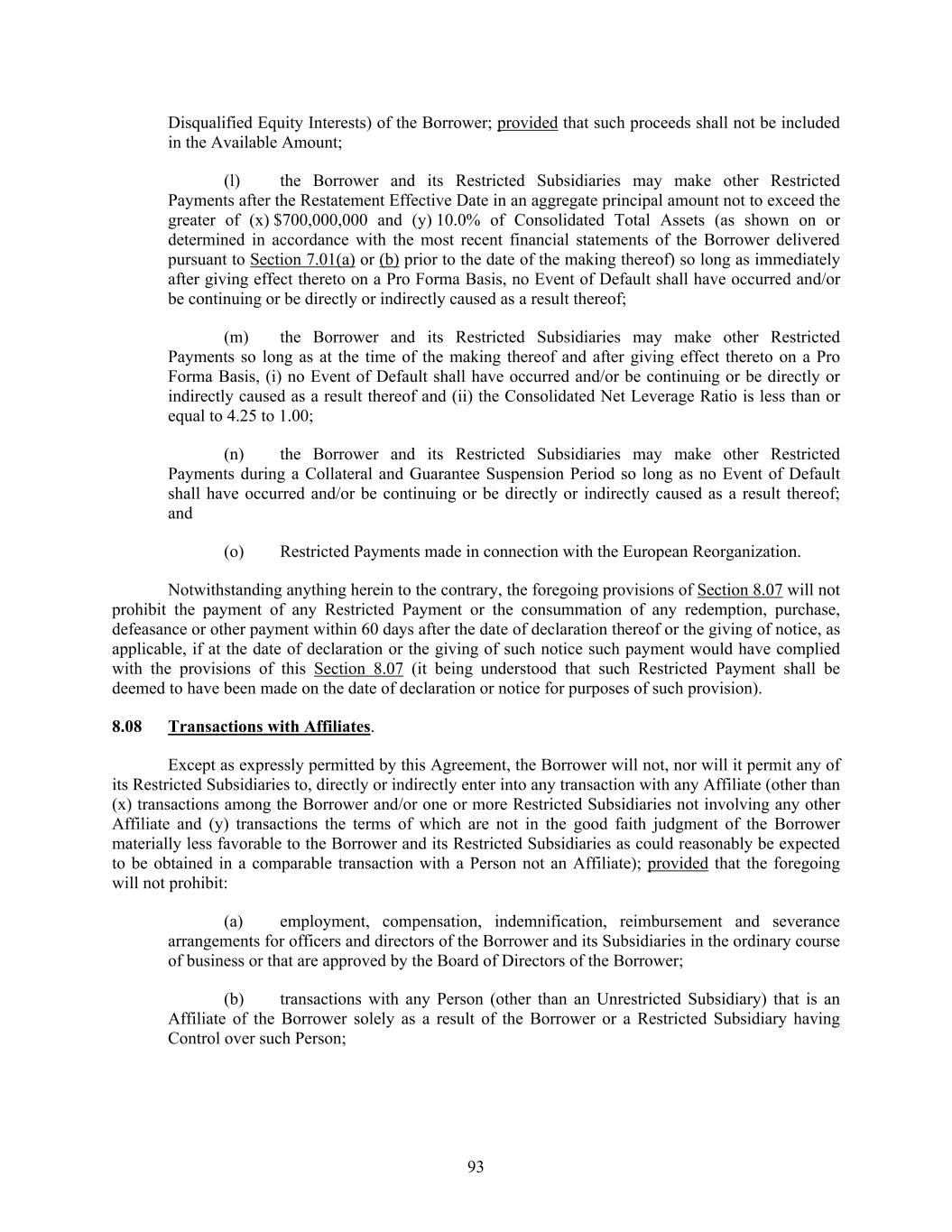 93 Disqualified Equity Interests) of the Borrower; provided that such proceeds shall not be included in the Available Amount; (l) the Borrower and its Restricted Subsidiaries may make other Restricted Payments after the Restatement Effective Date in an aggregate principal amount not to exceed the greater of (x) $700,000,000 and (y) 10.0% of Consolidated Total Assets (as shown on or determined in accordance with the most recent financial statements of the Borrower delivered pursuant to Section 7.01(a) or (b) prior to the date of the making thereof) so long as immediately after giving effect thereto on a Pro Forma Basis, no Event of Default shall have occurred and/or be continuing or be directly or indirectly caused as a result thereof; (m) the Borrower and its Restricted Subsidiaries may make other Restricted Payments so long as at the time of the making thereof and after giving effect thereto on a Pro Forma Basis, (i) no Event of Default shall have occurred and/or be continuing or be directly or indirectly caused as a result thereof and (ii) the Consolidated Net Leverage Ratio is less than or equal to 4.25 to 1.00; (n) the Borrower and its Restricted Subsidiaries may make other Restricted Payments during a Collateral and Guarantee Suspension Period so long as no Event of Default shall have occurred and/or be continuing or be directly or indirectly caused as a result thereof; and (o) Restricted Payments made in connection with the European Reorganization. Notwithstanding anything herein to the contrary, the foregoing provisions of Section 8.07 will not prohibit the payment of any Restricted Payment or the consummation of any redemption, purchase, defeasance or other payment within 60 days after the date of declaration thereof or the giving of notice, as applicable, if at the date of declaration or the giving of such notice such payment would have complied with the provisions of this Section 8.07 (it being understood that such Restricted Payment shall be deemed to have been made on the date of declaration or notice for purposes of such provision). 8.08 Transactions with Affiliates. Except as expressly permitted by this Agreement, the Borrower will not, nor will it permit any of its Restricted Subsidiaries to, directly or indirectly enter into any transaction with any Affiliate (other than (x) transactions among the Borrower and/or one or more Restricted Subsidiaries not involving any other Affiliate and (y) transactions the terms of which are not in the good faith judgment of the Borrower materially less favorable to the Borrower and its Restricted Subsidiaries as could reasonably be expected to be obtained in a comparable transaction with a Person not an Affiliate); provided that the foregoing will not prohibit: (a) employment, compensation, indemnification, reimbursement and severance arrangements for officers and directors of the Borrower and its Subsidiaries in the ordinary course of business or that are approved by the Board of Directors of the Borrower; (b) transactions with any Person (other than an Unrestricted Subsidiary) that is an Affiliate of the Borrower solely as a result of the Borrower or a Restricted Subsidiary having Control over such Person;