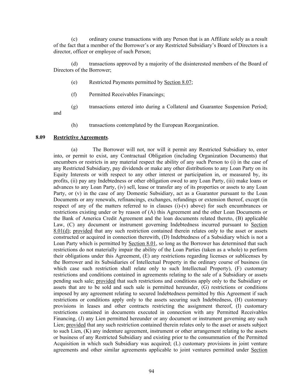 94 (c) ordinary course transactions with any Person that is an Affiliate solely as a result of the fact that a member of the Borrower’s or any Restricted Subsidiary’s Board of Directors is a director, officer or employee of such Person; (d) transactions approved by a majority of the disinterested members of the Board of Directors of the Borrower; (e) Restricted Payments permitted by Section 8.07; (f) Permitted Receivables Financings; (g) transactions entered into during a Collateral and Guarantee Suspension Period; and (h) transactions contemplated by the European Reorganization. 8.09 Restrictive Agreements. (a) The Borrower will not, nor will it permit any Restricted Subsidiary to, enter into, or permit to exist, any Contractual Obligation (including Organization Documents) that encumbers or restricts in any material respect the ability of any such Person to (i) in the case of any Restricted Subsidiary, pay dividends or make any other distributions to any Loan Party on its Equity Interests or with respect to any other interest or participation in, or measured by, its profits, (ii) pay any Indebtedness or other obligation owed to any Loan Party, (iii) make loans or advances to any Loan Party, (iv) sell, lease or transfer any of its properties or assets to any Loan Party, or (v) in the case of any Domestic Subsidiary, act as a Guarantor pursuant to the Loan Documents or any renewals, refinancings, exchanges, refundings or extension thereof, except (in respect of any of the matters referred to in clauses (i)-(v) above) for such encumbrances or restrictions existing under or by reason of (A) this Agreement and the other Loan Documents or the Bank of America Credit Agreement and the loan documents related thereto, (B) applicable Law, (C) any document or instrument governing Indebtedness incurred pursuant to Section 8.01(d); provided that any such restriction contained therein relates only to the asset or assets constructed or acquired in connection therewith, (D) Indebtedness of a Subsidiary which is not a Loan Party which is permitted by Section 8.01, so long as the Borrower has determined that such restrictions do not materially impair the ability of the Loan Parties (taken as a whole) to perform their obligations under this Agreement, (E) any restrictions regarding licenses or sublicenses by the Borrower and its Subsidiaries of Intellectual Property in the ordinary course of business (in which case such restriction shall relate only to such Intellectual Property), (F) customary restrictions and conditions contained in agreements relating to the sale of a Subsidiary or assets pending such sale; provided that such restrictions and conditions apply only to the Subsidiary or assets that are to be sold and such sale is permitted hereunder, (G) restrictions or conditions imposed by any agreement relating to secured Indebtedness permitted by this Agreement if such restrictions or conditions apply only to the assets securing such Indebtedness, (H) customary provisions in leases and other contracts restricting the assignment thereof, (I) customary restrictions contained in documents executed in connection with any Permitted Receivables Financing, (J) any Lien permitted hereunder or any document or instrument governing any such Lien; provided that any such restriction contained therein relates only to the asset or assets subject to such Lien, (K) any indenture agreement, instrument or other arrangement relating to the assets or business of any Restricted Subsidiary and existing prior to the consummation of the Permitted Acquisition in which such Subsidiary was acquired; (L) customary provisions in joint venture agreements and other similar agreements applicable to joint ventures permitted under Section