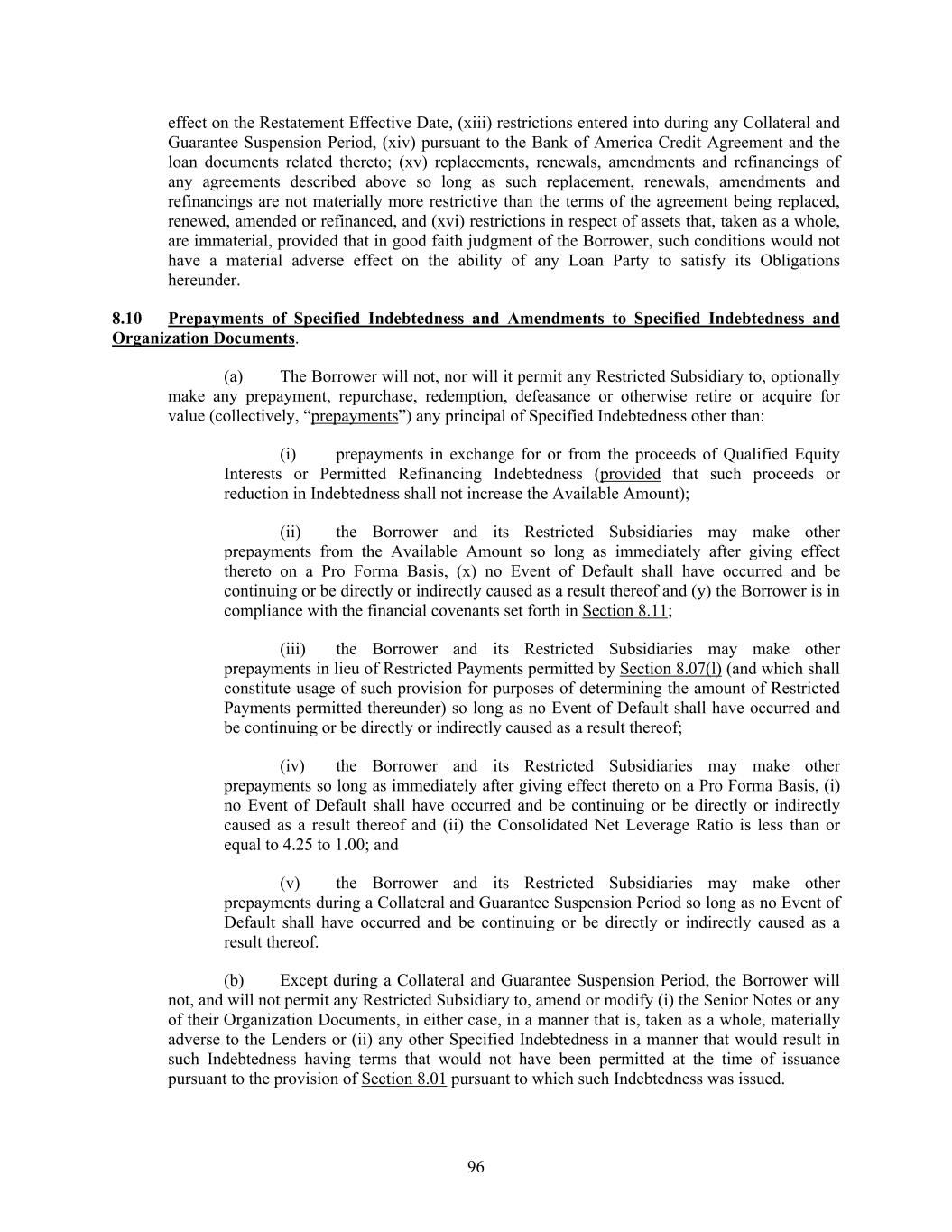 96 effect on the Restatement Effective Date, (xiii) restrictions entered into during any Collateral and Guarantee Suspension Period, (xiv) pursuant to the Bank of America Credit Agreement and the loan documents related thereto; (xv) replacements, renewals, amendments and refinancings of any agreements described above so long as such replacement, renewals, amendments and refinancings are not materially more restrictive than the terms of the agreement being replaced, renewed, amended or refinanced, and (xvi) restrictions in respect of assets that, taken as a whole, are immaterial, provided that in good faith judgment of the Borrower, such conditions would not have a material adverse effect on the ability of any Loan Party to satisfy its Obligations hereunder. 8.10 Prepayments of Specified Indebtedness and Amendments to Specified Indebtedness and Organization Documents. (a) The Borrower will not, nor will it permit any Restricted Subsidiary to, optionally make any prepayment, repurchase, redemption, defeasance or otherwise retire or acquire for value (collectively, “prepayments”) any principal of Specified Indebtedness other than: (i) prepayments in exchange for or from the proceeds of Qualified Equity Interests or Permitted Refinancing Indebtedness (provided that such proceeds or reduction in Indebtedness shall not increase the Available Amount); (ii) the Borrower and its Restricted Subsidiaries may make other prepayments from the Available Amount so long as immediately after giving effect thereto on a Pro Forma Basis, (x) no Event of Default shall have occurred and be continuing or be directly or indirectly caused as a result thereof and (y) the Borrower is in compliance with the financial covenants set forth in Section 8.11; (iii) the Borrower and its Restricted Subsidiaries may make other prepayments in lieu of Restricted Payments permitted by Section 8.07(l) (and which shall constitute usage of such provision for purposes of determining the amount of Restricted Payments permitted thereunder) so long as no Event of Default shall have occurred and be continuing or be directly or indirectly caused as a result thereof; (iv) the Borrower and its Restricted Subsidiaries may make other prepayments so long as immediately after giving effect thereto on a Pro Forma Basis, (i) no Event of Default shall have occurred and be continuing or be directly or indirectly caused as a result thereof and (ii) the Consolidated Net Leverage Ratio is less than or equal to 4.25 to 1.00; and (v) the Borrower and its Restricted Subsidiaries may make other prepayments during a Collateral and Guarantee Suspension Period so long as no Event of Default shall have occurred and be continuing or be directly or indirectly caused as a result thereof. (b) Except during a Collateral and Guarantee Suspension Period, the Borrower will not, and will not permit any Restricted Subsidiary to, amend or modify (i) the Senior Notes or any of their Organization Documents, in either case, in a manner that is, taken as a whole, materially adverse to the Lenders or (ii) any other Specified Indebtedness in a manner that would result in such Indebtedness having terms that would not have been permitted at the time of issuance pursuant to the provision of Section 8.01 pursuant to which such Indebtedness was issued.
