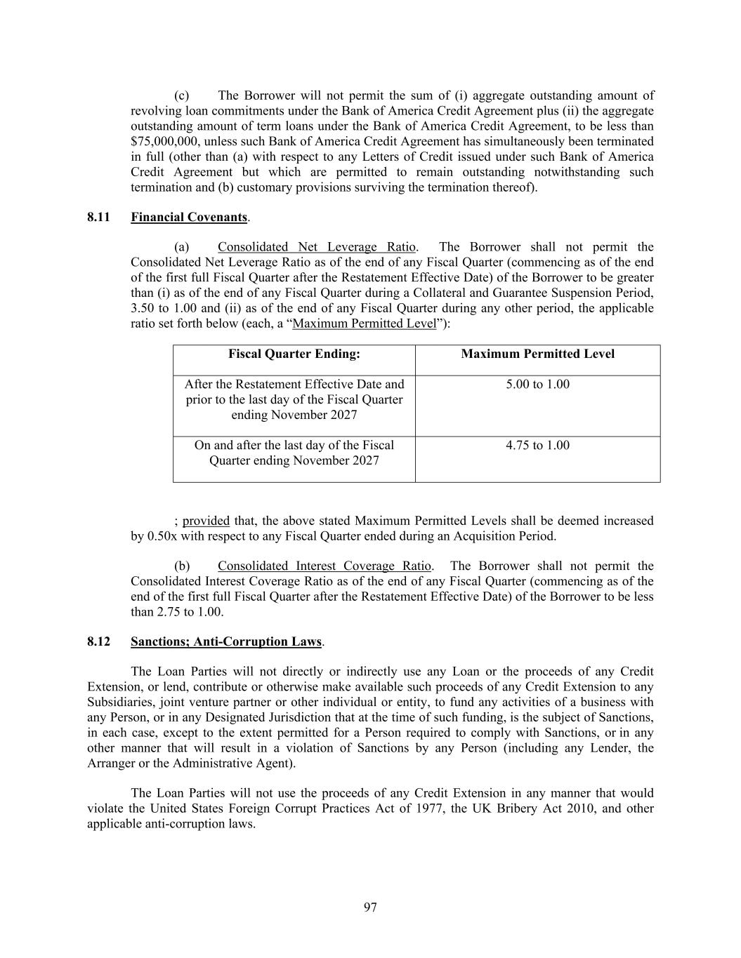 97 (c) The Borrower will not permit the sum of (i) aggregate outstanding amount of revolving loan commitments under the Bank of America Credit Agreement plus (ii) the aggregate outstanding amount of term loans under the Bank of America Credit Agreement, to be less than $75,000,000, unless such Bank of America Credit Agreement has simultaneously been terminated in full (other than (a) with respect to any Letters of Credit issued under such Bank of America Credit Agreement but which are permitted to remain outstanding notwithstanding such termination and (b) customary provisions surviving the termination thereof). 8.11 Financial Covenants. (a) Consolidated Net Leverage Ratio. The Borrower shall not permit the Consolidated Net Leverage Ratio as of the end of any Fiscal Quarter (commencing as of the end of the first full Fiscal Quarter after the Restatement Effective Date) of the Borrower to be greater than (i) as of the end of any Fiscal Quarter during a Collateral and Guarantee Suspension Period, 3.50 to 1.00 and (ii) as of the end of any Fiscal Quarter during any other period, the applicable ratio set forth below (each, a “Maximum Permitted Level”): Fiscal Quarter Ending: Maximum Permitted Level After the Restatement Effective Date and prior to the last day of the Fiscal Quarter ending November 2027 5.00 to 1.00 On and after the last day of the Fiscal Quarter ending November 2027 4.75 to 1.00 ; provided that, the above stated Maximum Permitted Levels shall be deemed increased by 0.50x with respect to any Fiscal Quarter ended during an Acquisition Period. (b) Consolidated Interest Coverage Ratio. The Borrower shall not permit the Consolidated Interest Coverage Ratio as of the end of any Fiscal Quarter (commencing as of the end of the first full Fiscal Quarter after the Restatement Effective Date) of the Borrower to be less than 2.75 to 1.00. 8.12 Sanctions; Anti-Corruption Laws. The Loan Parties will not directly or indirectly use any Loan or the proceeds of any Credit Extension, or lend, contribute or otherwise make available such proceeds of any Credit Extension to any Subsidiaries, joint venture partner or other individual or entity, to fund any activities of a business with any Person, or in any Designated Jurisdiction that at the time of such funding, is the subject of Sanctions, in each case, except to the extent permitted for a Person required to comply with Sanctions, or in any other manner that will result in a violation of Sanctions by any Person (including any Lender, the Arranger or the Administrative Agent). The Loan Parties will not use the proceeds of any Credit Extension in any manner that would violate the United States Foreign Corrupt Practices Act of 1977, the UK Bribery Act 2010, and other applicable anti-corruption laws.