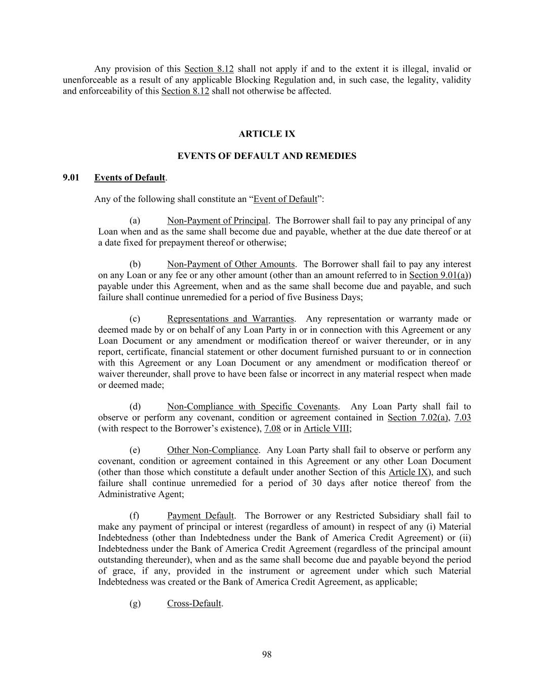 98 Any provision of this Section 8.12 shall not apply if and to the extent it is illegal, invalid or unenforceable as a result of any applicable Blocking Regulation and, in such case, the legality, validity and enforceability of this Section 8.12 shall not otherwise be affected. ARTICLE IX EVENTS OF DEFAULT AND REMEDIES 9.01 Events of Default. Any of the following shall constitute an “Event of Default”: (a) Non-Payment of Principal. The Borrower shall fail to pay any principal of any Loan when and as the same shall become due and payable, whether at the due date thereof or at a date fixed for prepayment thereof or otherwise; (b) Non-Payment of Other Amounts. The Borrower shall fail to pay any interest on any Loan or any fee or any other amount (other than an amount referred to in Section 9.01(a)) payable under this Agreement, when and as the same shall become due and payable, and such failure shall continue unremedied for a period of five Business Days; (c) Representations and Warranties. Any representation or warranty made or deemed made by or on behalf of any Loan Party in or in connection with this Agreement or any Loan Document or any amendment or modification thereof or waiver thereunder, or in any report, certificate, financial statement or other document furnished pursuant to or in connection with this Agreement or any Loan Document or any amendment or modification thereof or waiver thereunder, shall prove to have been false or incorrect in any material respect when made or deemed made; (d) Non-Compliance with Specific Covenants. Any Loan Party shall fail to observe or perform any covenant, condition or agreement contained in Section 7.02(a), 7.03 (with respect to the Borrower’s existence), 7.08 or in Article VIII; (e) Other Non-Compliance. Any Loan Party shall fail to observe or perform any covenant, condition or agreement contained in this Agreement or any other Loan Document (other than those which constitute a default under another Section of this Article IX), and such failure shall continue unremedied for a period of 30 days after notice thereof from the Administrative Agent; (f) Payment Default. The Borrower or any Restricted Subsidiary shall fail to make any payment of principal or interest (regardless of amount) in respect of any (i) Material Indebtedness (other than Indebtedness under the Bank of America Credit Agreement) or (ii) Indebtedness under the Bank of America Credit Agreement (regardless of the principal amount outstanding thereunder), when and as the same shall become due and payable beyond the period of grace, if any, provided in the instrument or agreement under which such Material Indebtedness was created or the Bank of America Credit Agreement, as applicable; (g) Cross-Default.