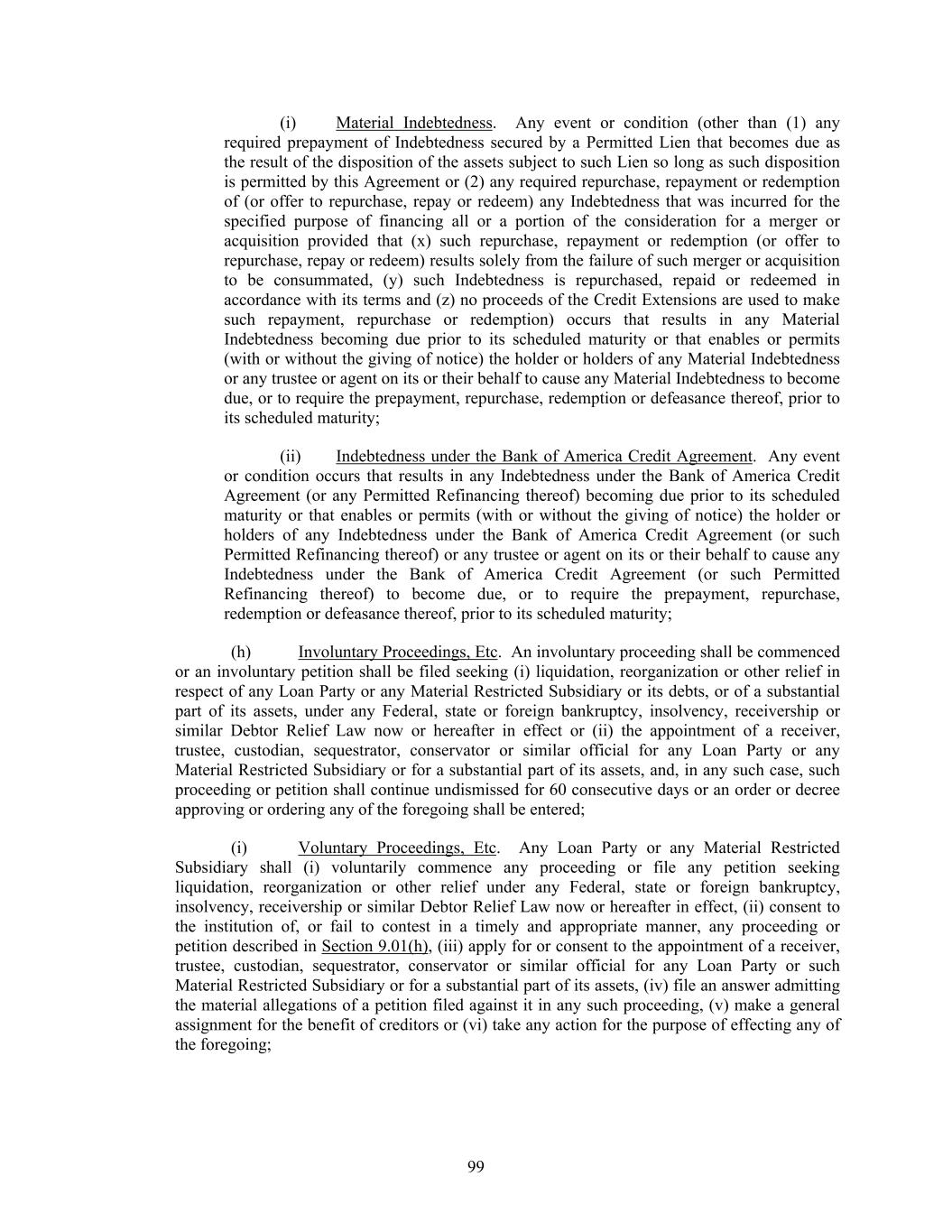 99 (i) Material Indebtedness. Any event or condition (other than (1) any required prepayment of Indebtedness secured by a Permitted Lien that becomes due as the result of the disposition of the assets subject to such Lien so long as such disposition is permitted by this Agreement or (2) any required repurchase, repayment or redemption of (or offer to repurchase, repay or redeem) any Indebtedness that was incurred for the specified purpose of financing all or a portion of the consideration for a merger or acquisition provided that (x) such repurchase, repayment or redemption (or offer to repurchase, repay or redeem) results solely from the failure of such merger or acquisition to be consummated, (y) such Indebtedness is repurchased, repaid or redeemed in accordance with its terms and (z) no proceeds of the Credit Extensions are used to make such repayment, repurchase or redemption) occurs that results in any Material Indebtedness becoming due prior to its scheduled maturity or that enables or permits (with or without the giving of notice) the holder or holders of any Material Indebtedness or any trustee or agent on its or their behalf to cause any Material Indebtedness to become due, or to require the prepayment, repurchase, redemption or defeasance thereof, prior to its scheduled maturity; (ii) Indebtedness under the Bank of America Credit Agreement. Any event or condition occurs that results in any Indebtedness under the Bank of America Credit Agreement (or any Permitted Refinancing thereof) becoming due prior to its scheduled maturity or that enables or permits (with or without the giving of notice) the holder or holders of any Indebtedness under the Bank of America Credit Agreement (or such Permitted Refinancing thereof) or any trustee or agent on its or their behalf to cause any Indebtedness under the Bank of America Credit Agreement (or such Permitted Refinancing thereof) to become due, or to require the prepayment, repurchase, redemption or defeasance thereof, prior to its scheduled maturity; (h) Involuntary Proceedings, Etc. An involuntary proceeding shall be commenced or an involuntary petition shall be filed seeking (i) liquidation, reorganization or other relief in respect of any Loan Party or any Material Restricted Subsidiary or its debts, or of a substantial part of its assets, under any Federal, state or foreign bankruptcy, insolvency, receivership or similar Debtor Relief Law now or hereafter in effect or (ii) the appointment of a receiver, trustee, custodian, sequestrator, conservator or similar official for any Loan Party or any Material Restricted Subsidiary or for a substantial part of its assets, and, in any such case, such proceeding or petition shall continue undismissed for 60 consecutive days or an order or decree approving or ordering any of the foregoing shall be entered; (i) Voluntary Proceedings, Etc. Any Loan Party or any Material Restricted Subsidiary shall (i) voluntarily commence any proceeding or file any petition seeking liquidation, reorganization or other relief under any Federal, state or foreign bankruptcy, insolvency, receivership or similar Debtor Relief Law now or hereafter in effect, (ii) consent to the institution of, or fail to contest in a timely and appropriate manner, any proceeding or petition described in Section 9.01(h), (iii) apply for or consent to the appointment of a receiver, trustee, custodian, sequestrator, conservator or similar official for any Loan Party or such Material Restricted Subsidiary or for a substantial part of its assets, (iv) file an answer admitting the material allegations of a petition filed against it in any such proceeding, (v) make a general assignment for the benefit of creditors or (vi) take any action for the purpose of effecting any of the foregoing;
