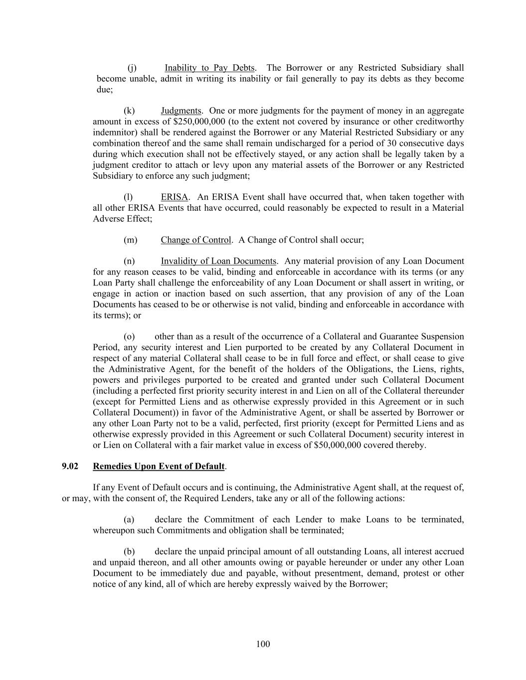 100 (j) Inability to Pay Debts. The Borrower or any Restricted Subsidiary shall become unable, admit in writing its inability or fail generally to pay its debts as they become due; (k) Judgments. One or more judgments for the payment of money in an aggregate amount in excess of $250,000,000 (to the extent not covered by insurance or other creditworthy indemnitor) shall be rendered against the Borrower or any Material Restricted Subsidiary or any combination thereof and the same shall remain undischarged for a period of 30 consecutive days during which execution shall not be effectively stayed, or any action shall be legally taken by a judgment creditor to attach or levy upon any material assets of the Borrower or any Restricted Subsidiary to enforce any such judgment; (l) ERISA. An ERISA Event shall have occurred that, when taken together with all other ERISA Events that have occurred, could reasonably be expected to result in a Material Adverse Effect; (m) Change of Control. A Change of Control shall occur; (n) Invalidity of Loan Documents. Any material provision of any Loan Document for any reason ceases to be valid, binding and enforceable in accordance with its terms (or any Loan Party shall challenge the enforceability of any Loan Document or shall assert in writing, or engage in action or inaction based on such assertion, that any provision of any of the Loan Documents has ceased to be or otherwise is not valid, binding and enforceable in accordance with its terms); or (o) other than as a result of the occurrence of a Collateral and Guarantee Suspension Period, any security interest and Lien purported to be created by any Collateral Document in respect of any material Collateral shall cease to be in full force and effect, or shall cease to give the Administrative Agent, for the benefit of the holders of the Obligations, the Liens, rights, powers and privileges purported to be created and granted under such Collateral Document (including a perfected first priority security interest in and Lien on all of the Collateral thereunder (except for Permitted Liens and as otherwise expressly provided in this Agreement or in such Collateral Document)) in favor of the Administrative Agent, or shall be asserted by Borrower or any other Loan Party not to be a valid, perfected, first priority (except for Permitted Liens and as otherwise expressly provided in this Agreement or such Collateral Document) security interest in or Lien on Collateral with a fair market value in excess of $50,000,000 covered thereby. 9.02 Remedies Upon Event of Default. If any Event of Default occurs and is continuing, the Administrative Agent shall, at the request of, or may, with the consent of, the Required Lenders, take any or all of the following actions: (a) declare the Commitment of each Lender to make Loans to be terminated, whereupon such Commitments and obligation shall be terminated; (b) declare the unpaid principal amount of all outstanding Loans, all interest accrued and unpaid thereon, and all other amounts owing or payable hereunder or under any other Loan Document to be immediately due and payable, without presentment, demand, protest or other notice of any kind, all of which are hereby expressly waived by the Borrower;