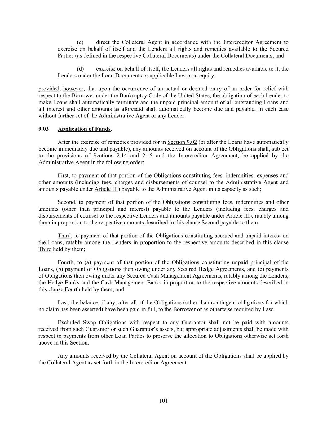 101 (c) direct the Collateral Agent in accordance with the Intercreditor Agreement to exercise on behalf of itself and the Lenders all rights and remedies available to the Secured Parties (as defined in the respective Collateral Documents) under the Collateral Documents; and (d) exercise on behalf of itself, the Lenders all rights and remedies available to it, the Lenders under the Loan Documents or applicable Law or at equity; provided, however, that upon the occurrence of an actual or deemed entry of an order for relief with respect to the Borrower under the Bankruptcy Code of the United States, the obligation of each Lender to make Loans shall automatically terminate and the unpaid principal amount of all outstanding Loans and all interest and other amounts as aforesaid shall automatically become due and payable, in each case without further act of the Administrative Agent or any Lender. 9.03 Application of Funds. After the exercise of remedies provided for in Section 9.02 (or after the Loans have automatically become immediately due and payable), any amounts received on account of the Obligations shall, subject to the provisions of Sections 2.14 and 2.15 and the Intercreditor Agreement, be applied by the Administrative Agent in the following order: First, to payment of that portion of the Obligations constituting fees, indemnities, expenses and other amounts (including fees, charges and disbursements of counsel to the Administrative Agent and amounts payable under Article III) payable to the Administrative Agent in its capacity as such; Second, to payment of that portion of the Obligations constituting fees, indemnities and other amounts (other than principal and interest) payable to the Lenders (including fees, charges and disbursements of counsel to the respective Lenders and amounts payable under Article III), ratably among them in proportion to the respective amounts described in this clause Second payable to them; Third, to payment of that portion of the Obligations constituting accrued and unpaid interest on the Loans, ratably among the Lenders in proportion to the respective amounts described in this clause Third held by them; Fourth, to (a) payment of that portion of the Obligations constituting unpaid principal of the Loans, (b) payment of Obligations then owing under any Secured Hedge Agreements, and (c) payments of Obligations then owing under any Secured Cash Management Agreements, ratably among the Lenders, the Hedge Banks and the Cash Management Banks in proportion to the respective amounts described in this clause Fourth held by them; and Last, the balance, if any, after all of the Obligations (other than contingent obligations for which no claim has been asserted) have been paid in full, to the Borrower or as otherwise required by Law. Excluded Swap Obligations with respect to any Guarantor shall not be paid with amounts received from such Guarantor or such Guarantor’s assets, but appropriate adjustments shall be made with respect to payments from other Loan Parties to preserve the allocation to Obligations otherwise set forth above in this Section. Any amounts received by the Collateral Agent on account of the Obligations shall be applied by the Collateral Agent as set forth in the Intercreditor Agreement.
