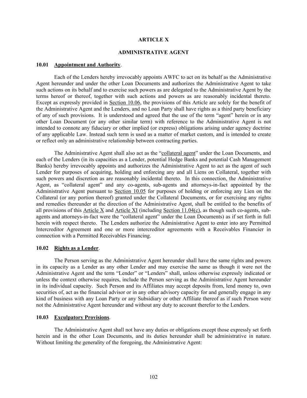 102 ARTICLE X ADMINISTRATIVE AGENT 10.01 Appointment and Authority. Each of the Lenders hereby irrevocably appoints AWFC to act on its behalf as the Administrative Agent hereunder and under the other Loan Documents and authorizes the Administrative Agent to take such actions on its behalf and to exercise such powers as are delegated to the Administrative Agent by the terms hereof or thereof, together with such actions and powers as are reasonably incidental thereto. Except as expressly provided in Section 10.06, the provisions of this Article are solely for the benefit of the Administrative Agent and the Lenders, and no Loan Party shall have rights as a third party beneficiary of any of such provisions. It is understood and agreed that the use of the term “agent” herein or in any other Loan Document (or any other similar term) with reference to the Administrative Agent is not intended to connote any fiduciary or other implied (or express) obligations arising under agency doctrine of any applicable Law. Instead such term is used as a matter of market custom, and is intended to create or reflect only an administrative relationship between contracting parties. The Administrative Agent shall also act as the “collateral agent” under the Loan Documents, and each of the Lenders (in its capacities as a Lender, potential Hedge Banks and potential Cash Management Banks) hereby irrevocably appoints and authorizes the Administrative Agent to act as the agent of such Lender for purposes of acquiring, holding and enforcing any and all Liens on Collateral, together with such powers and discretion as are reasonably incidental thereto. In this connection, the Administrative Agent, as “collateral agent” and any co-agents, sub-agents and attorneys-in-fact appointed by the Administrative Agent pursuant to Section 10.05 for purposes of holding or enforcing any Lien on the Collateral (or any portion thereof) granted under the Collateral Documents, or for exercising any rights and remedies thereunder at the direction of the Administrative Agent, shall be entitled to the benefits of all provisions of this Article X and Article XI (including Section 11.04(c), as though such co-agents, sub- agents and attorneys-in-fact were the “collateral agent” under the Loan Documents) as if set forth in full herein with respect thereto. The Lenders authorize the Administrative Agent to enter into any Permitted Intercreditor Agreement and one or more intercreditor agreements with a Receivables Financier in connection with a Permitted Receivables Financing. 10.02 Rights as a Lender. The Person serving as the Administrative Agent hereunder shall have the same rights and powers in its capacity as a Lender as any other Lender and may exercise the same as though it were not the Administrative Agent and the term “Lender” or “Lenders” shall, unless otherwise expressly indicated or unless the context otherwise requires, include the Person serving as the Administrative Agent hereunder in its individual capacity. Such Person and its Affiliates may accept deposits from, lend money to, own securities of, act as the financial advisor or in any other advisory capacity for and generally engage in any kind of business with any Loan Party or any Subsidiary or other Affiliate thereof as if such Person were not the Administrative Agent hereunder and without any duty to account therefor to the Lenders. 10.03 Exculpatory Provisions. The Administrative Agent shall not have any duties or obligations except those expressly set forth herein and in the other Loan Documents, and its duties hereunder shall be administrative in nature. Without limiting the generality of the foregoing, the Administrative Agent: