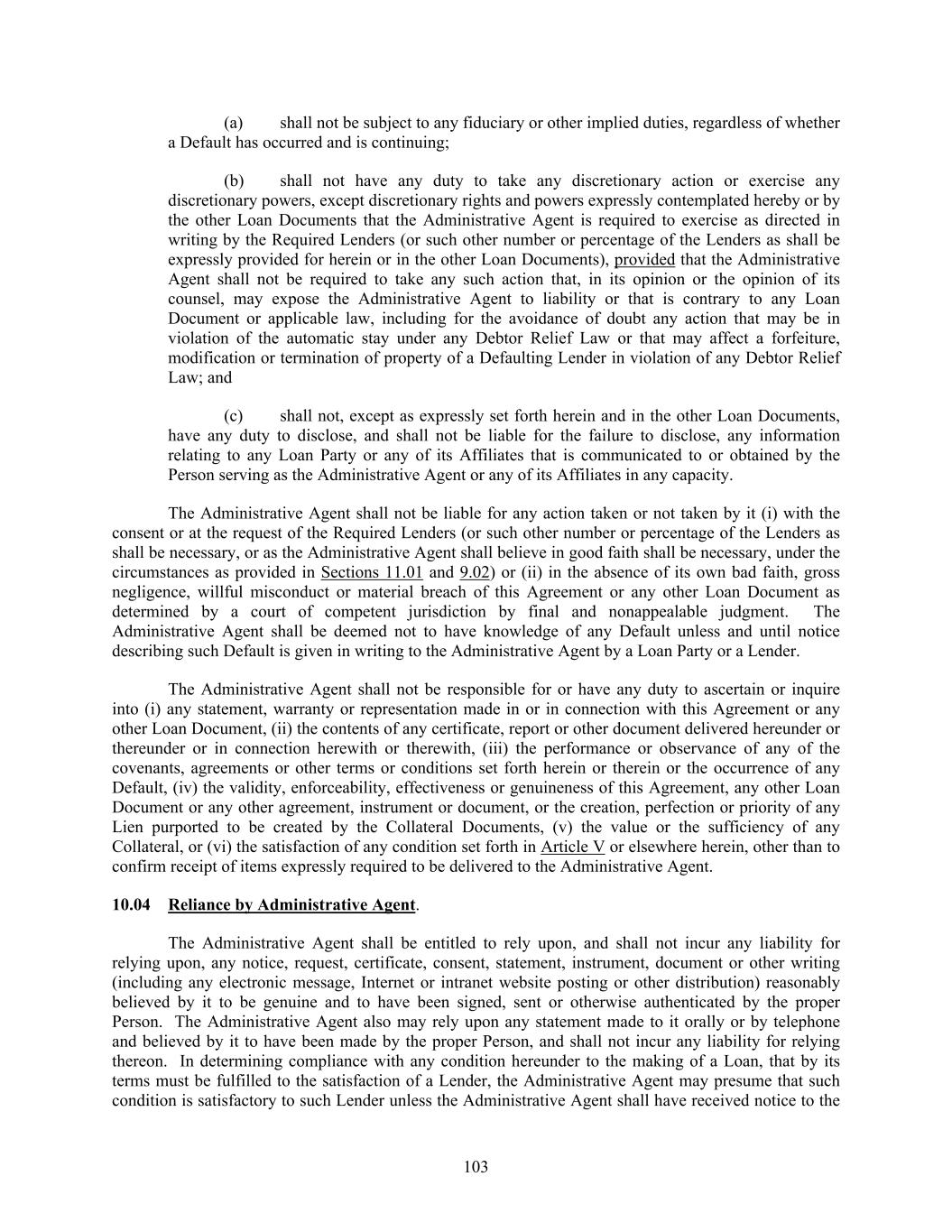 103 (a) shall not be subject to any fiduciary or other implied duties, regardless of whether a Default has occurred and is continuing; (b) shall not have any duty to take any discretionary action or exercise any discretionary powers, except discretionary rights and powers expressly contemplated hereby or by the other Loan Documents that the Administrative Agent is required to exercise as directed in writing by the Required Lenders (or such other number or percentage of the Lenders as shall be expressly provided for herein or in the other Loan Documents), provided that the Administrative Agent shall not be required to take any such action that, in its opinion or the opinion of its counsel, may expose the Administrative Agent to liability or that is contrary to any Loan Document or applicable law, including for the avoidance of doubt any action that may be in violation of the automatic stay under any Debtor Relief Law or that may affect a forfeiture, modification or termination of property of a Defaulting Lender in violation of any Debtor Relief Law; and (c) shall not, except as expressly set forth herein and in the other Loan Documents, have any duty to disclose, and shall not be liable for the failure to disclose, any information relating to any Loan Party or any of its Affiliates that is communicated to or obtained by the Person serving as the Administrative Agent or any of its Affiliates in any capacity. The Administrative Agent shall not be liable for any action taken or not taken by it (i) with the consent or at the request of the Required Lenders (or such other number or percentage of the Lenders as shall be necessary, or as the Administrative Agent shall believe in good faith shall be necessary, under the circumstances as provided in Sections 11.01 and 9.02) or (ii) in the absence of its own bad faith, gross negligence, willful misconduct or material breach of this Agreement or any other Loan Document as determined by a court of competent jurisdiction by final and nonappealable judgment. The Administrative Agent shall be deemed not to have knowledge of any Default unless and until notice describing such Default is given in writing to the Administrative Agent by a Loan Party or a Lender. The Administrative Agent shall not be responsible for or have any duty to ascertain or inquire into (i) any statement, warranty or representation made in or in connection with this Agreement or any other Loan Document, (ii) the contents of any certificate, report or other document delivered hereunder or thereunder or in connection herewith or therewith, (iii) the performance or observance of any of the covenants, agreements or other terms or conditions set forth herein or therein or the occurrence of any Default, (iv) the validity, enforceability, effectiveness or genuineness of this Agreement, any other Loan Document or any other agreement, instrument or document, or the creation, perfection or priority of any Lien purported to be created by the Collateral Documents, (v) the value or the sufficiency of any Collateral, or (vi) the satisfaction of any condition set forth in Article V or elsewhere herein, other than to confirm receipt of items expressly required to be delivered to the Administrative Agent. 10.04 Reliance by Administrative Agent. The Administrative Agent shall be entitled to rely upon, and shall not incur any liability for relying upon, any notice, request, certificate, consent, statement, instrument, document or other writing (including any electronic message, Internet or intranet website posting or other distribution) reasonably believed by it to be genuine and to have been signed, sent or otherwise authenticated by the proper Person. The Administrative Agent also may rely upon any statement made to it orally or by telephone and believed by it to have been made by the proper Person, and shall not incur any liability for relying thereon. In determining compliance with any condition hereunder to the making of a Loan, that by its terms must be fulfilled to the satisfaction of a Lender, the Administrative Agent may presume that such condition is satisfactory to such Lender unless the Administrative Agent shall have received notice to the
