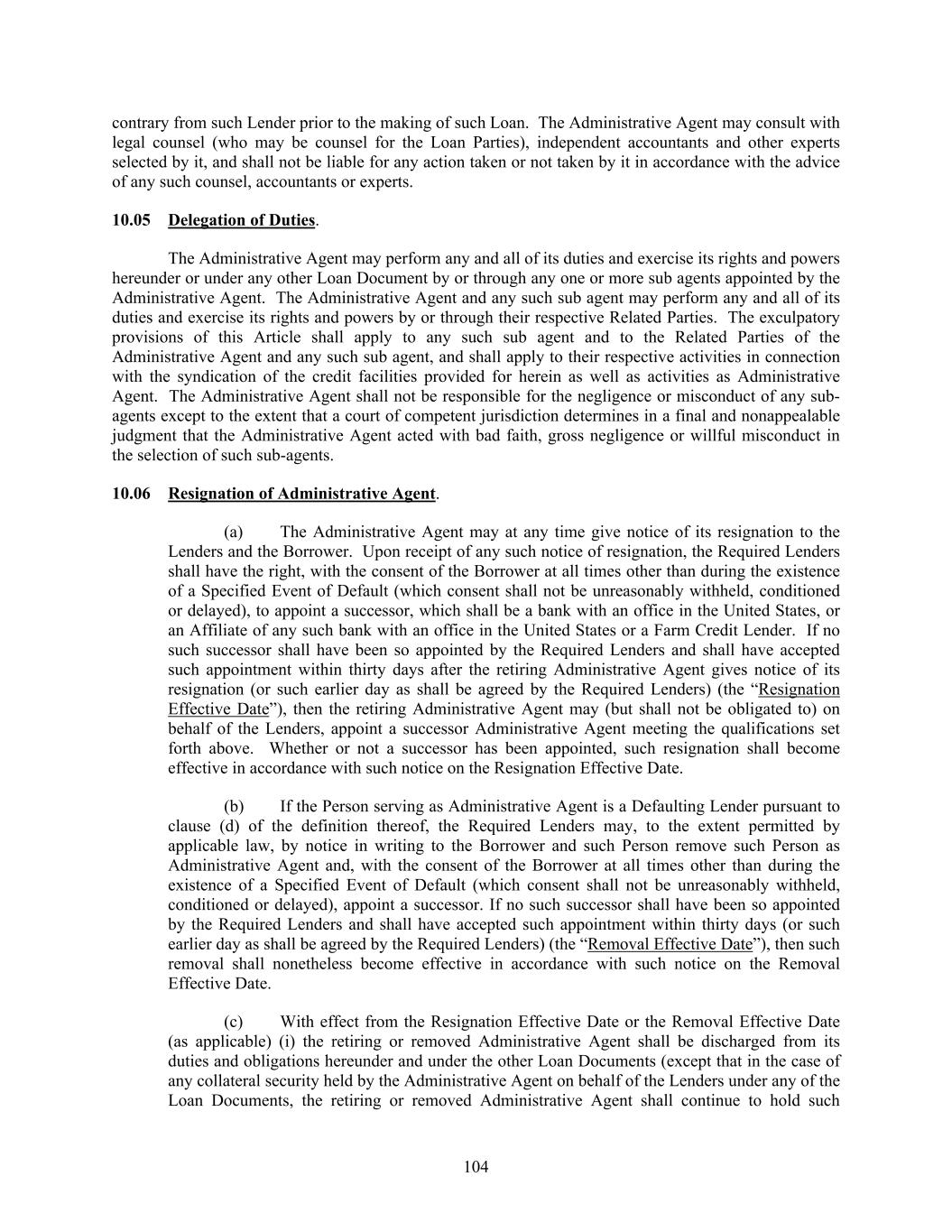 104 contrary from such Lender prior to the making of such Loan. The Administrative Agent may consult with legal counsel (who may be counsel for the Loan Parties), independent accountants and other experts selected by it, and shall not be liable for any action taken or not taken by it in accordance with the advice of any such counsel, accountants or experts. 10.05 Delegation of Duties. The Administrative Agent may perform any and all of its duties and exercise its rights and powers hereunder or under any other Loan Document by or through any one or more sub agents appointed by the Administrative Agent. The Administrative Agent and any such sub agent may perform any and all of its duties and exercise its rights and powers by or through their respective Related Parties. The exculpatory provisions of this Article shall apply to any such sub agent and to the Related Parties of the Administrative Agent and any such sub agent, and shall apply to their respective activities in connection with the syndication of the credit facilities provided for herein as well as activities as Administrative Agent. The Administrative Agent shall not be responsible for the negligence or misconduct of any sub- agents except to the extent that a court of competent jurisdiction determines in a final and nonappealable judgment that the Administrative Agent acted with bad faith, gross negligence or willful misconduct in the selection of such sub-agents. 10.06 Resignation of Administrative Agent. (a) The Administrative Agent may at any time give notice of its resignation to the Lenders and the Borrower. Upon receipt of any such notice of resignation, the Required Lenders shall have the right, with the consent of the Borrower at all times other than during the existence of a Specified Event of Default (which consent shall not be unreasonably withheld, conditioned or delayed), to appoint a successor, which shall be a bank with an office in the United States, or an Affiliate of any such bank with an office in the United States or a Farm Credit Lender. If no such successor shall have been so appointed by the Required Lenders and shall have accepted such appointment within thirty days after the retiring Administrative Agent gives notice of its resignation (or such earlier day as shall be agreed by the Required Lenders) (the “Resignation Effective Date”), then the retiring Administrative Agent may (but shall not be obligated to) on behalf of the Lenders, appoint a successor Administrative Agent meeting the qualifications set forth above. Whether or not a successor has been appointed, such resignation shall become effective in accordance with such notice on the Resignation Effective Date. (b) If the Person serving as Administrative Agent is a Defaulting Lender pursuant to clause (d) of the definition thereof, the Required Lenders may, to the extent permitted by applicable law, by notice in writing to the Borrower and such Person remove such Person as Administrative Agent and, with the consent of the Borrower at all times other than during the existence of a Specified Event of Default (which consent shall not be unreasonably withheld, conditioned or delayed), appoint a successor. If no such successor shall have been so appointed by the Required Lenders and shall have accepted such appointment within thirty days (or such earlier day as shall be agreed by the Required Lenders) (the “Removal Effective Date”), then such removal shall nonetheless become effective in accordance with such notice on the Removal Effective Date. (c) With effect from the Resignation Effective Date or the Removal Effective Date (as applicable) (i) the retiring or removed Administrative Agent shall be discharged from its duties and obligations hereunder and under the other Loan Documents (except that in the case of any collateral security held by the Administrative Agent on behalf of the Lenders under any of the Loan Documents, the retiring or removed Administrative Agent shall continue to hold such