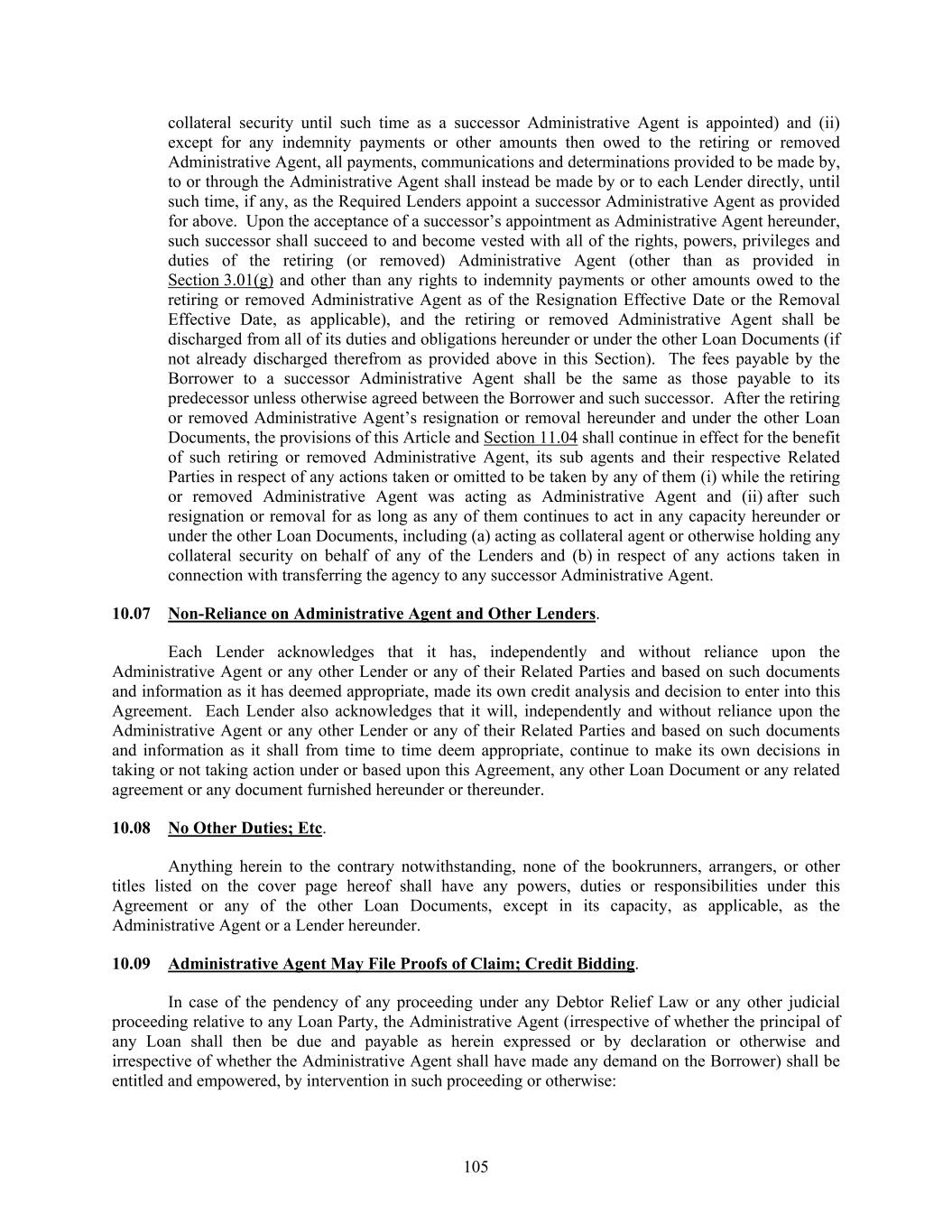 105 collateral security until such time as a successor Administrative Agent is appointed) and (ii) except for any indemnity payments or other amounts then owed to the retiring or removed Administrative Agent, all payments, communications and determinations provided to be made by, to or through the Administrative Agent shall instead be made by or to each Lender directly, until such time, if any, as the Required Lenders appoint a successor Administrative Agent as provided for above. Upon the acceptance of a successor’s appointment as Administrative Agent hereunder, such successor shall succeed to and become vested with all of the rights, powers, privileges and duties of the retiring (or removed) Administrative Agent (other than as provided in Section 3.01(g) and other than any rights to indemnity payments or other amounts owed to the retiring or removed Administrative Agent as of the Resignation Effective Date or the Removal Effective Date, as applicable), and the retiring or removed Administrative Agent shall be discharged from all of its duties and obligations hereunder or under the other Loan Documents (if not already discharged therefrom as provided above in this Section). The fees payable by the Borrower to a successor Administrative Agent shall be the same as those payable to its predecessor unless otherwise agreed between the Borrower and such successor. After the retiring or removed Administrative Agent’s resignation or removal hereunder and under the other Loan Documents, the provisions of this Article and Section 11.04 shall continue in effect for the benefit of such retiring or removed Administrative Agent, its sub agents and their respective Related Parties in respect of any actions taken or omitted to be taken by any of them (i) while the retiring or removed Administrative Agent was acting as Administrative Agent and (ii) after such resignation or removal for as long as any of them continues to act in any capacity hereunder or under the other Loan Documents, including (a) acting as collateral agent or otherwise holding any collateral security on behalf of any of the Lenders and (b) in respect of any actions taken in connection with transferring the agency to any successor Administrative Agent. 10.07 Non-Reliance on Administrative Agent and Other Lenders. Each Lender acknowledges that it has, independently and without reliance upon the Administrative Agent or any other Lender or any of their Related Parties and based on such documents and information as it has deemed appropriate, made its own credit analysis and decision to enter into this Agreement. Each Lender also acknowledges that it will, independently and without reliance upon the Administrative Agent or any other Lender or any of their Related Parties and based on such documents and information as it shall from time to time deem appropriate, continue to make its own decisions in taking or not taking action under or based upon this Agreement, any other Loan Document or any related agreement or any document furnished hereunder or thereunder. 10.08 No Other Duties; Etc. Anything herein to the contrary notwithstanding, none of the bookrunners, arrangers, or other titles listed on the cover page hereof shall have any powers, duties or responsibilities under this Agreement or any of the other Loan Documents, except in its capacity, as applicable, as the Administrative Agent or a Lender hereunder. 10.09 Administrative Agent May File Proofs of Claim; Credit Bidding. In case of the pendency of any proceeding under any Debtor Relief Law or any other judicial proceeding relative to any Loan Party, the Administrative Agent (irrespective of whether the principal of any Loan shall then be due and payable as herein expressed or by declaration or otherwise and irrespective of whether the Administrative Agent shall have made any demand on the Borrower) shall be entitled and empowered, by intervention in such proceeding or otherwise: