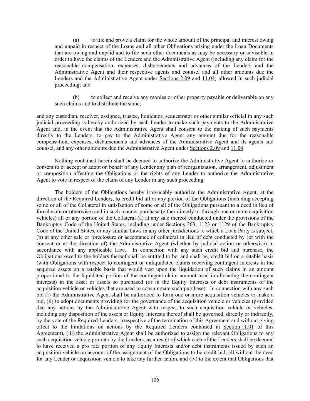 106 (a) to file and prove a claim for the whole amount of the principal and interest owing and unpaid in respect of the Loans and all other Obligations arising under the Loan Documents that are owing and unpaid and to file such other documents as may be necessary or advisable in order to have the claims of the Lenders and the Administrative Agent (including any claim for the reasonable compensation, expenses, disbursements and advances of the Lenders and the Administrative Agent and their respective agents and counsel and all other amounts due the Lenders and the Administrative Agent under Sections 2.09 and 11.04) allowed in such judicial proceeding; and (b) to collect and receive any monies or other property payable or deliverable on any such claims and to distribute the same; and any custodian, receiver, assignee, trustee, liquidator, sequestrator or other similar official in any such judicial proceeding is hereby authorized by each Lender to make such payments to the Administrative Agent and, in the event that the Administrative Agent shall consent to the making of such payments directly to the Lenders, to pay to the Administrative Agent any amount due for the reasonable compensation, expenses, disbursements and advances of the Administrative Agent and its agents and counsel, and any other amounts due the Administrative Agent under Sections 2.09 and 11.04. Nothing contained herein shall be deemed to authorize the Administrative Agent to authorize or consent to or accept or adopt on behalf of any Lender any plan of reorganization, arrangement, adjustment or composition affecting the Obligations or the rights of any Lender to authorize the Administrative Agent to vote in respect of the claim of any Lender in any such proceeding. The holders of the Obligations hereby irrevocably authorize the Administrative Agent, at the direction of the Required Lenders, to credit bid all or any portion of the Obligations (including accepting some or all of the Collateral in satisfaction of some or all of the Obligations pursuant to a deed in lieu of foreclosure or otherwise) and in such manner purchase (either directly or through one or more acquisition vehicles) all or any portion of the Collateral (a) at any sale thereof conducted under the provisions of the Bankruptcy Code of the United States, including under Sections 363, 1123 or 1129 of the Bankruptcy Code of the United States, or any similar Laws in any other jurisdictions to which a Loan Party is subject, (b) at any other sale or foreclosure or acceptance of collateral in lieu of debt conducted by (or with the consent or at the direction of) the Administrative Agent (whether by judicial action or otherwise) in accordance with any applicable Law. In connection with any such credit bid and purchase, the Obligations owed to the holders thereof shall be entitled to be, and shall be, credit bid on a ratable basis (with Obligations with respect to contingent or unliquidated claims receiving contingent interests in the acquired assets on a ratable basis that would vest upon the liquidation of such claims in an amount proportional to the liquidated portion of the contingent claim amount used in allocating the contingent interests) in the asset or assets so purchased (or in the Equity Interests or debt instruments of the acquisition vehicle or vehicles that are used to consummate such purchase). In connection with any such bid (i) the Administrative Agent shall be authorized to form one or more acquisition vehicles to make a bid, (ii) to adopt documents providing for the governance of the acquisition vehicle or vehicles (provided that any actions by the Administrative Agent with respect to such acquisition vehicle or vehicles, including any disposition of the assets or Equity Interests thereof shall be governed, directly or indirectly, by the vote of the Required Lenders, irrespective of the termination of this Agreement and without giving effect to the limitations on actions by the Required Lenders contained in Section 11.01 of this Agreement), (iii) the Administrative Agent shall be authorized to assign the relevant Obligations to any such acquisition vehicle pro rata by the Lenders, as a result of which each of the Lenders shall be deemed to have received a pro rata portion of any Equity Interests and/or debt instruments issued by such an acquisition vehicle on account of the assignment of the Obligations to be credit bid, all without the need for any Lender or acquisition vehicle to take any further action, and (iv) to the extent that Obligations that
