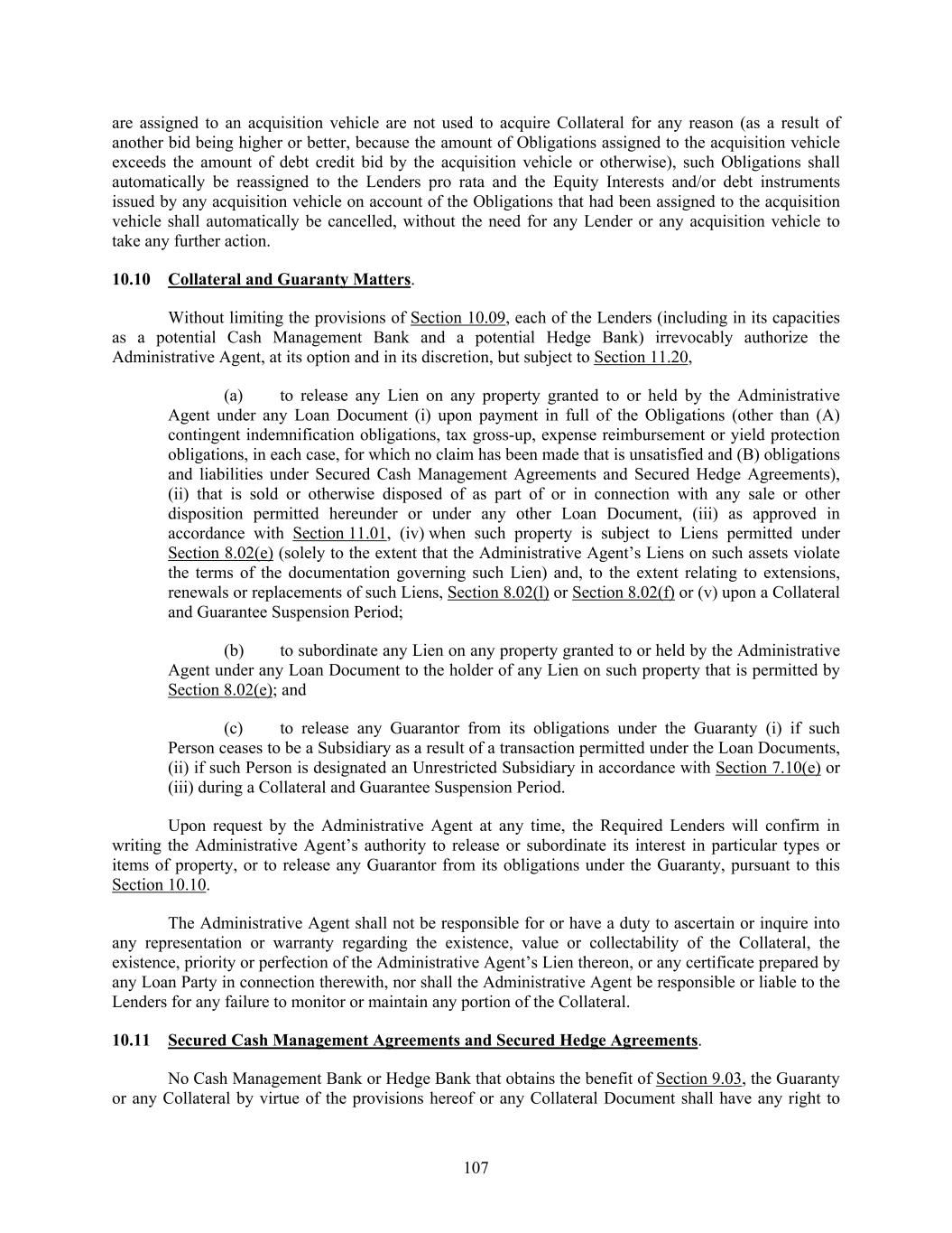 107 are assigned to an acquisition vehicle are not used to acquire Collateral for any reason (as a result of another bid being higher or better, because the amount of Obligations assigned to the acquisition vehicle exceeds the amount of debt credit bid by the acquisition vehicle or otherwise), such Obligations shall automatically be reassigned to the Lenders pro rata and the Equity Interests and/or debt instruments issued by any acquisition vehicle on account of the Obligations that had been assigned to the acquisition vehicle shall automatically be cancelled, without the need for any Lender or any acquisition vehicle to take any further action. 10.10 Collateral and Guaranty Matters. Without limiting the provisions of Section 10.09, each of the Lenders (including in its capacities as a potential Cash Management Bank and a potential Hedge Bank) irrevocably authorize the Administrative Agent, at its option and in its discretion, but subject to Section 11.20, (a) to release any Lien on any property granted to or held by the Administrative Agent under any Loan Document (i) upon payment in full of the Obligations (other than (A) contingent indemnification obligations, tax gross-up, expense reimbursement or yield protection obligations, in each case, for which no claim has been made that is unsatisfied and (B) obligations and liabilities under Secured Cash Management Agreements and Secured Hedge Agreements), (ii) that is sold or otherwise disposed of as part of or in connection with any sale or other disposition permitted hereunder or under any other Loan Document, (iii) as approved in accordance with Section 11.01, (iv) when such property is subject to Liens permitted under Section 8.02(e) (solely to the extent that the Administrative Agent’s Liens on such assets violate the terms of the documentation governing such Lien) and, to the extent relating to extensions, renewals or replacements of such Liens, Section 8.02(l) or Section 8.02(f) or (v) upon a Collateral and Guarantee Suspension Period; (b) to subordinate any Lien on any property granted to or held by the Administrative Agent under any Loan Document to the holder of any Lien on such property that is permitted by Section 8.02(e); and (c) to release any Guarantor from its obligations under the Guaranty (i) if such Person ceases to be a Subsidiary as a result of a transaction permitted under the Loan Documents, (ii) if such Person is designated an Unrestricted Subsidiary in accordance with Section 7.10(e) or (iii) during a Collateral and Guarantee Suspension Period. Upon request by the Administrative Agent at any time, the Required Lenders will confirm in writing the Administrative Agent’s authority to release or subordinate its interest in particular types or items of property, or to release any Guarantor from its obligations under the Guaranty, pursuant to this Section 10.10. The Administrative Agent shall not be responsible for or have a duty to ascertain or inquire into any representation or warranty regarding the existence, value or collectability of the Collateral, the existence, priority or perfection of the Administrative Agent’s Lien thereon, or any certificate prepared by any Loan Party in connection therewith, nor shall the Administrative Agent be responsible or liable to the Lenders for any failure to monitor or maintain any portion of the Collateral. 10.11 Secured Cash Management Agreements and Secured Hedge Agreements. No Cash Management Bank or Hedge Bank that obtains the benefit of Section 9.03, the Guaranty or any Collateral by virtue of the provisions hereof or any Collateral Document shall have any right to