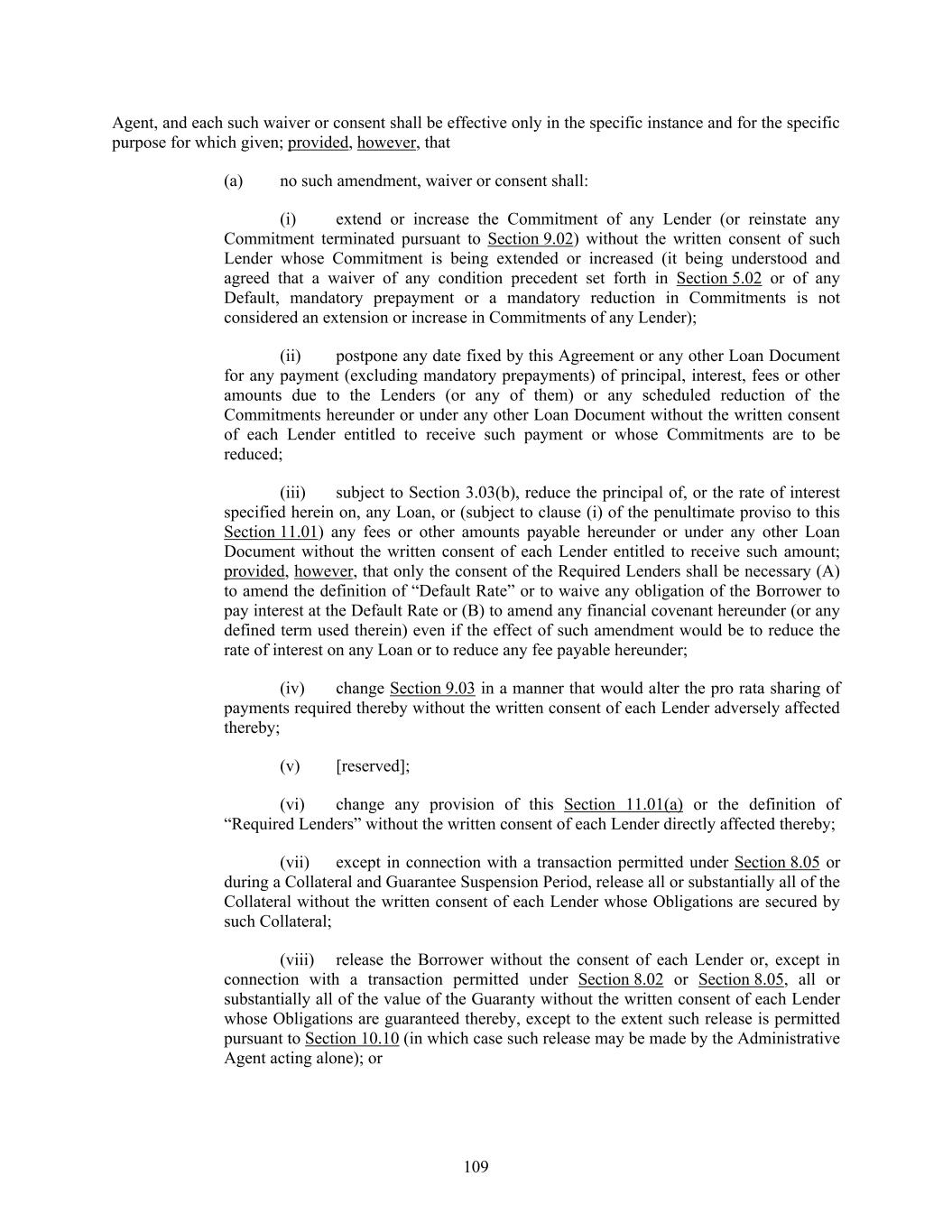 109 Agent, and each such waiver or consent shall be effective only in the specific instance and for the specific purpose for which given; provided, however, that (a) no such amendment, waiver or consent shall: (i) extend or increase the Commitment of any Lender (or reinstate any Commitment terminated pursuant to Section 9.02) without the written consent of such Lender whose Commitment is being extended or increased (it being understood and agreed that a waiver of any condition precedent set forth in Section 5.02 or of any Default, mandatory prepayment or a mandatory reduction in Commitments is not considered an extension or increase in Commitments of any Lender); (ii) postpone any date fixed by this Agreement or any other Loan Document for any payment (excluding mandatory prepayments) of principal, interest, fees or other amounts due to the Lenders (or any of them) or any scheduled reduction of the Commitments hereunder or under any other Loan Document without the written consent of each Lender entitled to receive such payment or whose Commitments are to be reduced; (iii) subject to Section 3.03(b), reduce the principal of, or the rate of interest specified herein on, any Loan, or (subject to clause (i) of the penultimate proviso to this Section 11.01) any fees or other amounts payable hereunder or under any other Loan Document without the written consent of each Lender entitled to receive such amount; provided, however, that only the consent of the Required Lenders shall be necessary (A) to amend the definition of “Default Rate” or to waive any obligation of the Borrower to pay interest at the Default Rate or (B) to amend any financial covenant hereunder (or any defined term used therein) even if the effect of such amendment would be to reduce the rate of interest on any Loan or to reduce any fee payable hereunder; (iv) change Section 9.03 in a manner that would alter the pro rata sharing of payments required thereby without the written consent of each Lender adversely affected thereby; (v) [reserved]; (vi) change any provision of this Section 11.01(a) or the definition of “Required Lenders” without the written consent of each Lender directly affected thereby; (vii) except in connection with a transaction permitted under Section 8.05 or during a Collateral and Guarantee Suspension Period, release all or substantially all of the Collateral without the written consent of each Lender whose Obligations are secured by such Collateral; (viii) release the Borrower without the consent of each Lender or, except in connection with a transaction permitted under Section 8.02 or Section 8.05, all or substantially all of the value of the Guaranty without the written consent of each Lender whose Obligations are guaranteed thereby, except to the extent such release is permitted pursuant to Section 10.10 (in which case such release may be made by the Administrative Agent acting alone); or