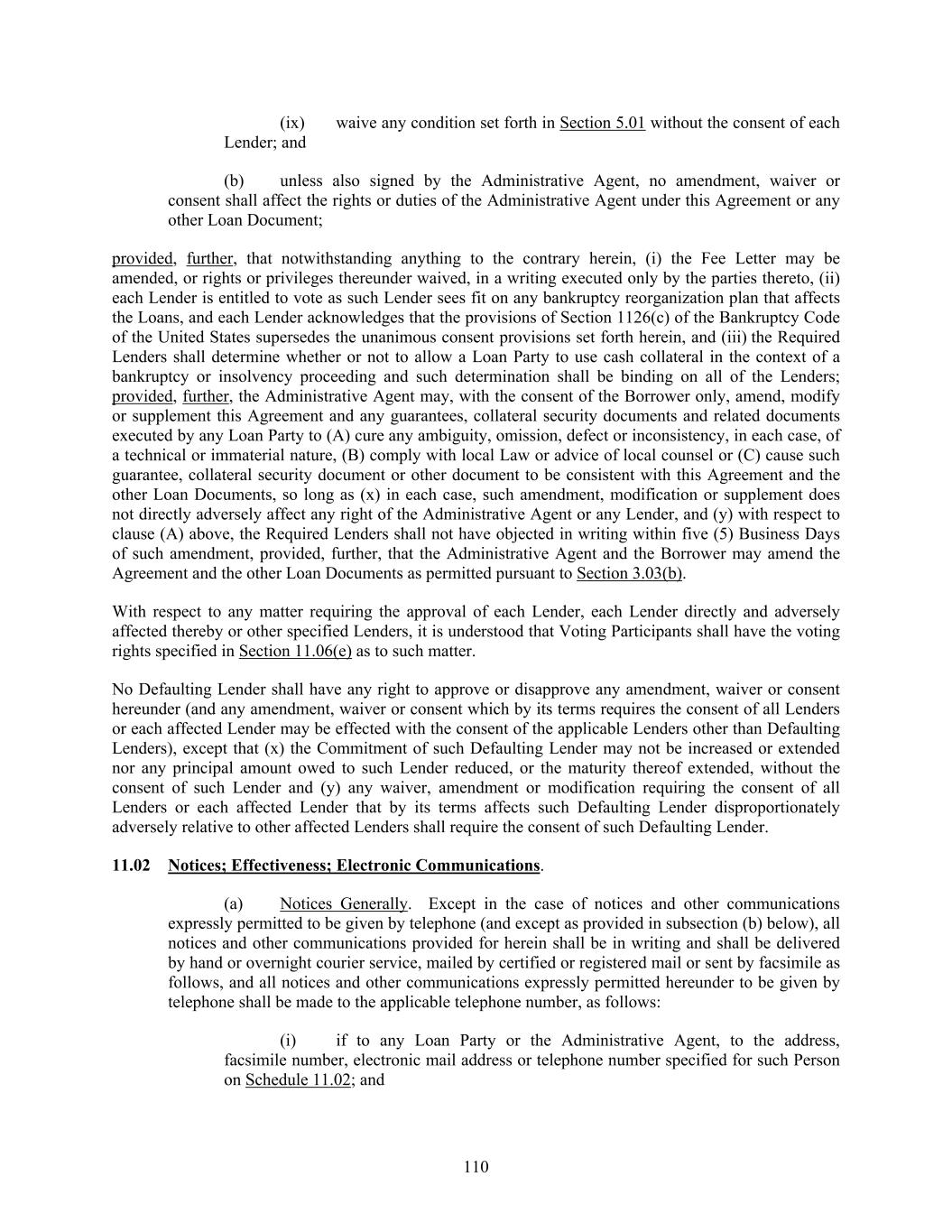 110 (ix) waive any condition set forth in Section 5.01 without the consent of each Lender; and (b) unless also signed by the Administrative Agent, no amendment, waiver or consent shall affect the rights or duties of the Administrative Agent under this Agreement or any other Loan Document; provided, further, that notwithstanding anything to the contrary herein, (i) the Fee Letter may be amended, or rights or privileges thereunder waived, in a writing executed only by the parties thereto, (ii) each Lender is entitled to vote as such Lender sees fit on any bankruptcy reorganization plan that affects the Loans, and each Lender acknowledges that the provisions of Section 1126(c) of the Bankruptcy Code of the United States supersedes the unanimous consent provisions set forth herein, and (iii) the Required Lenders shall determine whether or not to allow a Loan Party to use cash collateral in the context of a bankruptcy or insolvency proceeding and such determination shall be binding on all of the Lenders; provided, further, the Administrative Agent may, with the consent of the Borrower only, amend, modify or supplement this Agreement and any guarantees, collateral security documents and related documents executed by any Loan Party to (A) cure any ambiguity, omission, defect or inconsistency, in each case, of a technical or immaterial nature, (B) comply with local Law or advice of local counsel or (C) cause such guarantee, collateral security document or other document to be consistent with this Agreement and the other Loan Documents, so long as (x) in each case, such amendment, modification or supplement does not directly adversely affect any right of the Administrative Agent or any Lender, and (y) with respect to clause (A) above, the Required Lenders shall not have objected in writing within five (5) Business Days of such amendment, provided, further, that the Administrative Agent and the Borrower may amend the Agreement and the other Loan Documents as permitted pursuant to Section 3.03(b). With respect to any matter requiring the approval of each Lender, each Lender directly and adversely affected thereby or other specified Lenders, it is understood that Voting Participants shall have the voting rights specified in Section 11.06(e) as to such matter. No Defaulting Lender shall have any right to approve or disapprove any amendment, waiver or consent hereunder (and any amendment, waiver or consent which by its terms requires the consent of all Lenders or each affected Lender may be effected with the consent of the applicable Lenders other than Defaulting Lenders), except that (x) the Commitment of such Defaulting Lender may not be increased or extended nor any principal amount owed to such Lender reduced, or the maturity thereof extended, without the consent of such Lender and (y) any waiver, amendment or modification requiring the consent of all Lenders or each affected Lender that by its terms affects such Defaulting Lender disproportionately adversely relative to other affected Lenders shall require the consent of such Defaulting Lender. 11.02 Notices; Effectiveness; Electronic Communications. (a) Notices Generally. Except in the case of notices and other communications expressly permitted to be given by telephone (and except as provided in subsection (b) below), all notices and other communications provided for herein shall be in writing and shall be delivered by hand or overnight courier service, mailed by certified or registered mail or sent by facsimile as follows, and all notices and other communications expressly permitted hereunder to be given by telephone shall be made to the applicable telephone number, as follows: (i) if to any Loan Party or the Administrative Agent, to the address, facsimile number, electronic mail address or telephone number specified for such Person on Schedule 11.02; and