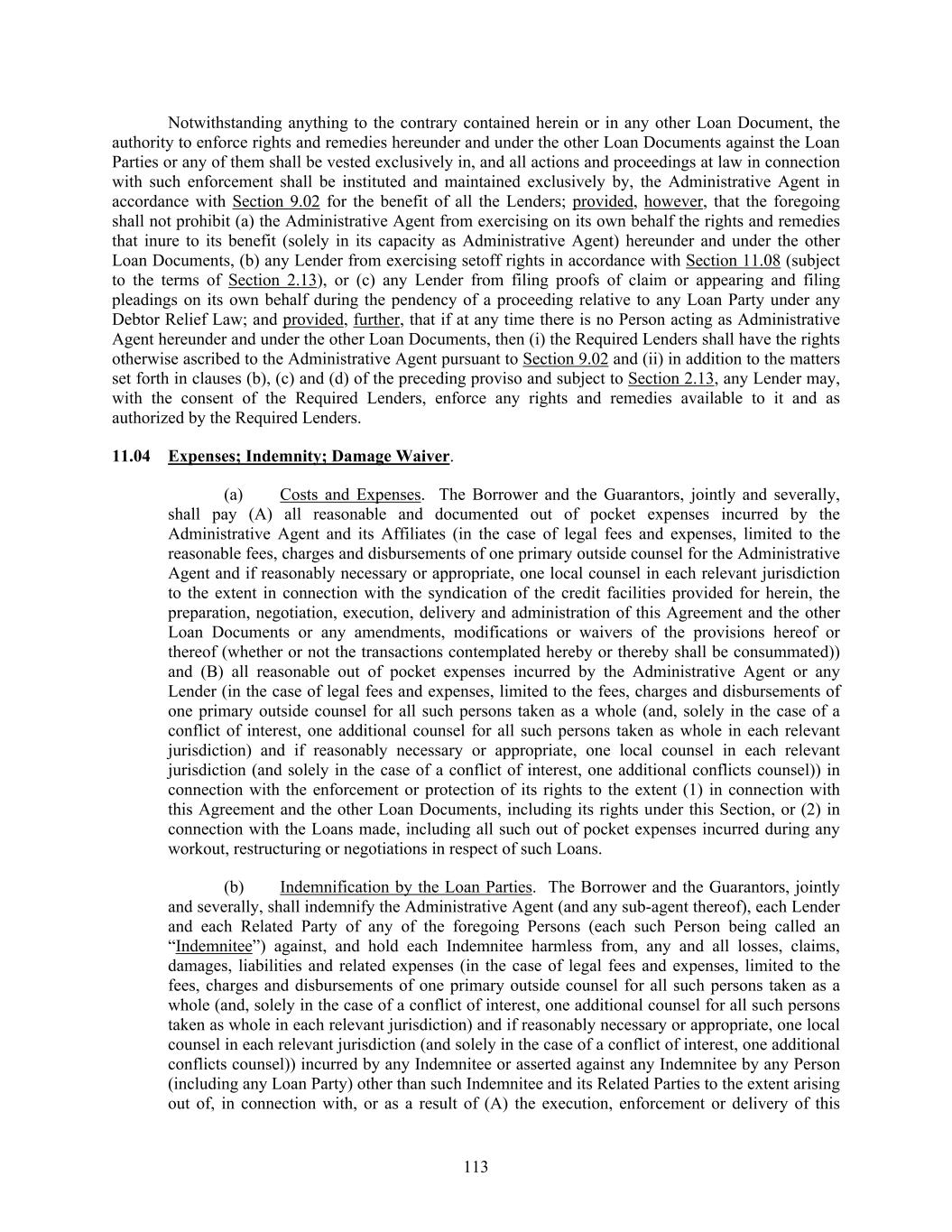 113 Notwithstanding anything to the contrary contained herein or in any other Loan Document, the authority to enforce rights and remedies hereunder and under the other Loan Documents against the Loan Parties or any of them shall be vested exclusively in, and all actions and proceedings at law in connection with such enforcement shall be instituted and maintained exclusively by, the Administrative Agent in accordance with Section 9.02 for the benefit of all the Lenders; provided, however, that the foregoing shall not prohibit (a) the Administrative Agent from exercising on its own behalf the rights and remedies that inure to its benefit (solely in its capacity as Administrative Agent) hereunder and under the other Loan Documents, (b) any Lender from exercising setoff rights in accordance with Section 11.08 (subject to the terms of Section 2.13), or (c) any Lender from filing proofs of claim or appearing and filing pleadings on its own behalf during the pendency of a proceeding relative to any Loan Party under any Debtor Relief Law; and provided, further, that if at any time there is no Person acting as Administrative Agent hereunder and under the other Loan Documents, then (i) the Required Lenders shall have the rights otherwise ascribed to the Administrative Agent pursuant to Section 9.02 and (ii) in addition to the matters set forth in clauses (b), (c) and (d) of the preceding proviso and subject to Section 2.13, any Lender may, with the consent of the Required Lenders, enforce any rights and remedies available to it and as authorized by the Required Lenders. 11.04 Expenses; Indemnity; Damage Waiver. (a) Costs and Expenses. The Borrower and the Guarantors, jointly and severally, shall pay (A) all reasonable and documented out of pocket expenses incurred by the Administrative Agent and its Affiliates (in the case of legal fees and expenses, limited to the reasonable fees, charges and disbursements of one primary outside counsel for the Administrative Agent and if reasonably necessary or appropriate, one local counsel in each relevant jurisdiction to the extent in connection with the syndication of the credit facilities provided for herein, the preparation, negotiation, execution, delivery and administration of this Agreement and the other Loan Documents or any amendments, modifications or waivers of the provisions hereof or thereof (whether or not the transactions contemplated hereby or thereby shall be consummated)) and (B) all reasonable out of pocket expenses incurred by the Administrative Agent or any Lender (in the case of legal fees and expenses, limited to the fees, charges and disbursements of one primary outside counsel for all such persons taken as a whole (and, solely in the case of a conflict of interest, one additional counsel for all such persons taken as whole in each relevant jurisdiction) and if reasonably necessary or appropriate, one local counsel in each relevant jurisdiction (and solely in the case of a conflict of interest, one additional conflicts counsel)) in connection with the enforcement or protection of its rights to the extent (1) in connection with this Agreement and the other Loan Documents, including its rights under this Section, or (2) in connection with the Loans made, including all such out of pocket expenses incurred during any workout, restructuring or negotiations in respect of such Loans. (b) Indemnification by the Loan Parties. The Borrower and the Guarantors, jointly and severally, shall indemnify the Administrative Agent (and any sub-agent thereof), each Lender and each Related Party of any of the foregoing Persons (each such Person being called an “Indemnitee”) against, and hold each Indemnitee harmless from, any and all losses, claims, damages, liabilities and related expenses (in the case of legal fees and expenses, limited to the fees, charges and disbursements of one primary outside counsel for all such persons taken as a whole (and, solely in the case of a conflict of interest, one additional counsel for all such persons taken as whole in each relevant jurisdiction) and if reasonably necessary or appropriate, one local counsel in each relevant jurisdiction (and solely in the case of a conflict of interest, one additional conflicts counsel)) incurred by any Indemnitee or asserted against any Indemnitee by any Person (including any Loan Party) other than such Indemnitee and its Related Parties to the extent arising out of, in connection with, or as a result of (A) the execution, enforcement or delivery of this