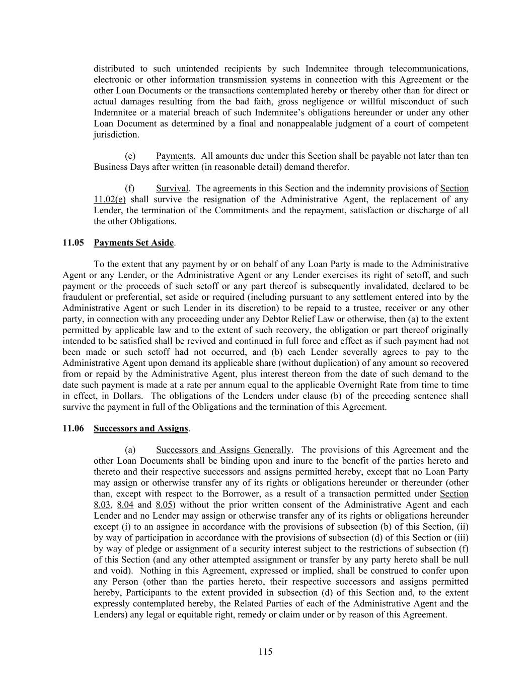 115 distributed to such unintended recipients by such Indemnitee through telecommunications, electronic or other information transmission systems in connection with this Agreement or the other Loan Documents or the transactions contemplated hereby or thereby other than for direct or actual damages resulting from the bad faith, gross negligence or willful misconduct of such Indemnitee or a material breach of such Indemnitee’s obligations hereunder or under any other Loan Document as determined by a final and nonappealable judgment of a court of competent jurisdiction. (e) Payments. All amounts due under this Section shall be payable not later than ten Business Days after written (in reasonable detail) demand therefor. (f) Survival. The agreements in this Section and the indemnity provisions of Section 11.02(e) shall survive the resignation of the Administrative Agent, the replacement of any Lender, the termination of the Commitments and the repayment, satisfaction or discharge of all the other Obligations. 11.05 Payments Set Aside. To the extent that any payment by or on behalf of any Loan Party is made to the Administrative Agent or any Lender, or the Administrative Agent or any Lender exercises its right of setoff, and such payment or the proceeds of such setoff or any part thereof is subsequently invalidated, declared to be fraudulent or preferential, set aside or required (including pursuant to any settlement entered into by the Administrative Agent or such Lender in its discretion) to be repaid to a trustee, receiver or any other party, in connection with any proceeding under any Debtor Relief Law or otherwise, then (a) to the extent permitted by applicable law and to the extent of such recovery, the obligation or part thereof originally intended to be satisfied shall be revived and continued in full force and effect as if such payment had not been made or such setoff had not occurred, and (b) each Lender severally agrees to pay to the Administrative Agent upon demand its applicable share (without duplication) of any amount so recovered from or repaid by the Administrative Agent, plus interest thereon from the date of such demand to the date such payment is made at a rate per annum equal to the applicable Overnight Rate from time to time in effect, in Dollars. The obligations of the Lenders under clause (b) of the preceding sentence shall survive the payment in full of the Obligations and the termination of this Agreement. 11.06 Successors and Assigns. (a) Successors and Assigns Generally. The provisions of this Agreement and the other Loan Documents shall be binding upon and inure to the benefit of the parties hereto and thereto and their respective successors and assigns permitted hereby, except that no Loan Party may assign or otherwise transfer any of its rights or obligations hereunder or thereunder (other than, except with respect to the Borrower, as a result of a transaction permitted under Section 8.03, 8.04 and 8.05) without the prior written consent of the Administrative Agent and each Lender and no Lender may assign or otherwise transfer any of its rights or obligations hereunder except (i) to an assignee in accordance with the provisions of subsection (b) of this Section, (ii) by way of participation in accordance with the provisions of subsection (d) of this Section or (iii) by way of pledge or assignment of a security interest subject to the restrictions of subsection (f) of this Section (and any other attempted assignment or transfer by any party hereto shall be null and void). Nothing in this Agreement, expressed or implied, shall be construed to confer upon any Person (other than the parties hereto, their respective successors and assigns permitted hereby, Participants to the extent provided in subsection (d) of this Section and, to the extent expressly contemplated hereby, the Related Parties of each of the Administrative Agent and the Lenders) any legal or equitable right, remedy or claim under or by reason of this Agreement.