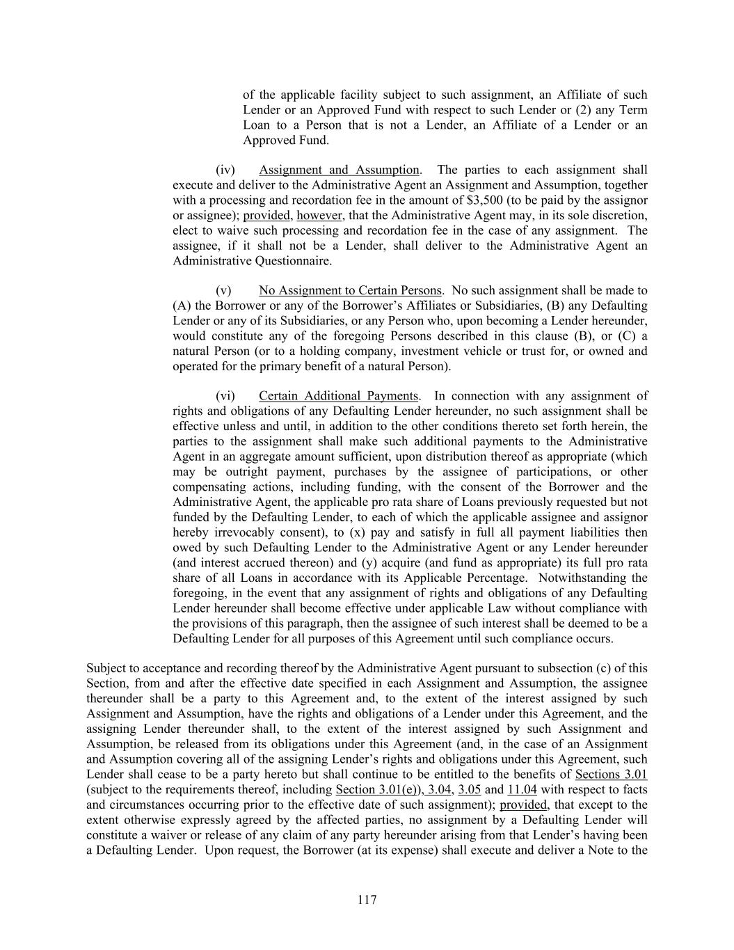 117 of the applicable facility subject to such assignment, an Affiliate of such Lender or an Approved Fund with respect to such Lender or (2) any Term Loan to a Person that is not a Lender, an Affiliate of a Lender or an Approved Fund. (iv) Assignment and Assumption. The parties to each assignment shall execute and deliver to the Administrative Agent an Assignment and Assumption, together with a processing and recordation fee in the amount of $3,500 (to be paid by the assignor or assignee); provided, however, that the Administrative Agent may, in its sole discretion, elect to waive such processing and recordation fee in the case of any assignment. The assignee, if it shall not be a Lender, shall deliver to the Administrative Agent an Administrative Questionnaire. (v) No Assignment to Certain Persons. No such assignment shall be made to (A) the Borrower or any of the Borrower’s Affiliates or Subsidiaries, (B) any Defaulting Lender or any of its Subsidiaries, or any Person who, upon becoming a Lender hereunder, would constitute any of the foregoing Persons described in this clause (B), or (C) a natural Person (or to a holding company, investment vehicle or trust for, or owned and operated for the primary benefit of a natural Person). (vi) Certain Additional Payments. In connection with any assignment of rights and obligations of any Defaulting Lender hereunder, no such assignment shall be effective unless and until, in addition to the other conditions thereto set forth herein, the parties to the assignment shall make such additional payments to the Administrative Agent in an aggregate amount sufficient, upon distribution thereof as appropriate (which may be outright payment, purchases by the assignee of participations, or other compensating actions, including funding, with the consent of the Borrower and the Administrative Agent, the applicable pro rata share of Loans previously requested but not funded by the Defaulting Lender, to each of which the applicable assignee and assignor hereby irrevocably consent), to (x) pay and satisfy in full all payment liabilities then owed by such Defaulting Lender to the Administrative Agent or any Lender hereunder (and interest accrued thereon) and (y) acquire (and fund as appropriate) its full pro rata share of all Loans in accordance with its Applicable Percentage. Notwithstanding the foregoing, in the event that any assignment of rights and obligations of any Defaulting Lender hereunder shall become effective under applicable Law without compliance with the provisions of this paragraph, then the assignee of such interest shall be deemed to be a Defaulting Lender for all purposes of this Agreement until such compliance occurs. Subject to acceptance and recording thereof by the Administrative Agent pursuant to subsection (c) of this Section, from and after the effective date specified in each Assignment and Assumption, the assignee thereunder shall be a party to this Agreement and, to the extent of the interest assigned by such Assignment and Assumption, have the rights and obligations of a Lender under this Agreement, and the assigning Lender thereunder shall, to the extent of the interest assigned by such Assignment and Assumption, be released from its obligations under this Agreement (and, in the case of an Assignment and Assumption covering all of the assigning Lender’s rights and obligations under this Agreement, such Lender shall cease to be a party hereto but shall continue to be entitled to the benefits of Sections 3.01 (subject to the requirements thereof, including Section 3.01(e)), 3.04, 3.05 and 11.04 with respect to facts and circumstances occurring prior to the effective date of such assignment); provided, that except to the extent otherwise expressly agreed by the affected parties, no assignment by a Defaulting Lender will constitute a waiver or release of any claim of any party hereunder arising from that Lender’s having been a Defaulting Lender. Upon request, the Borrower (at its expense) shall execute and deliver a Note to the