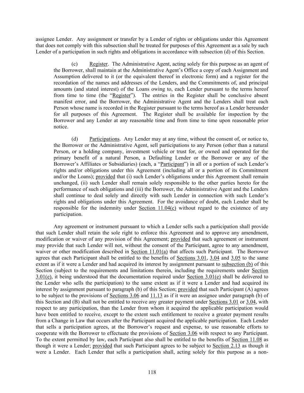 118 assignee Lender. Any assignment or transfer by a Lender of rights or obligations under this Agreement that does not comply with this subsection shall be treated for purposes of this Agreement as a sale by such Lender of a participation in such rights and obligations in accordance with subsection (d) of this Section. (c) Register. The Administrative Agent, acting solely for this purpose as an agent of the Borrower, shall maintain at the Administrative Agent’s Office a copy of each Assignment and Assumption delivered to it (or the equivalent thereof in electronic form) and a register for the recordation of the names and addresses of the Lenders, and the Commitments of, and principal amounts (and stated interest) of the Loans owing to, each Lender pursuant to the terms hereof from time to time (the “Register”). The entries in the Register shall be conclusive absent manifest error, and the Borrower, the Administrative Agent and the Lenders shall treat each Person whose name is recorded in the Register pursuant to the terms hereof as a Lender hereunder for all purposes of this Agreement. The Register shall be available for inspection by the Borrower and any Lender at any reasonable time and from time to time upon reasonable prior notice. (d) Participations. Any Lender may at any time, without the consent of, or notice to, the Borrower or the Administrative Agent, sell participations to any Person (other than a natural Person, or a holding company, investment vehicle or trust for, or owned and operated for the primary benefit of a natural Person, a Defaulting Lender or the Borrower or any of the Borrower’s Affiliates or Subsidiaries) (each, a “Participant”) in all or a portion of such Lender’s rights and/or obligations under this Agreement (including all or a portion of its Commitment and/or the Loans); provided that (i) such Lender’s obligations under this Agreement shall remain unchanged, (ii) such Lender shall remain solely responsible to the other parties hereto for the performance of such obligations and (iii) the Borrower, the Administrative Agent and the Lenders shall continue to deal solely and directly with such Lender in connection with such Lender’s rights and obligations under this Agreement. For the avoidance of doubt, each Lender shall be responsible for the indemnity under Section 11.04(c) without regard to the existence of any participation. Any agreement or instrument pursuant to which a Lender sells such a participation shall provide that such Lender shall retain the sole right to enforce this Agreement and to approve any amendment, modification or waiver of any provision of this Agreement; provided that such agreement or instrument may provide that such Lender will not, without the consent of the Participant, agree to any amendment, waiver or other modification described in Section 11.01(a) that affects such Participant. The Borrower agrees that each Participant shall be entitled to the benefits of Sections 3.01, 3.04 and 3.05 to the same extent as if it were a Lender and had acquired its interest by assignment pursuant to subsection (b) of this Section (subject to the requirements and limitations therein, including the requirements under Section 3.01(e), it being understood that the documentation required under Section 3.01(e) shall be delivered to the Lender who sells the participation) to the same extent as if it were a Lender and had acquired its interest by assignment pursuant to paragraph (b) of this Section; provided that such Participant (A) agrees to be subject to the provisions of Sections 3.06 and 11.13 as if it were an assignee under paragraph (b) of this Section and (B) shall not be entitled to receive any greater payment under Sections 3.01 or 3.04, with respect to any participation, than the Lender from whom it acquired the applicable participation would have been entitled to receive, except to the extent such entitlement to receive a greater payment results from a Change in Law that occurs after the Participant acquired the applicable participation. Each Lender that sells a participation agrees, at the Borrower’s request and expense, to use reasonable efforts to cooperate with the Borrower to effectuate the provisions of Section 3.06 with respect to any Participant. To the extent permitted by law, each Participant also shall be entitled to the benefits of Section 11.08 as though it were a Lender; provided that such Participant agrees to be subject to Section 2.13 as though it were a Lender. Each Lender that sells a participation shall, acting solely for this purpose as a non-