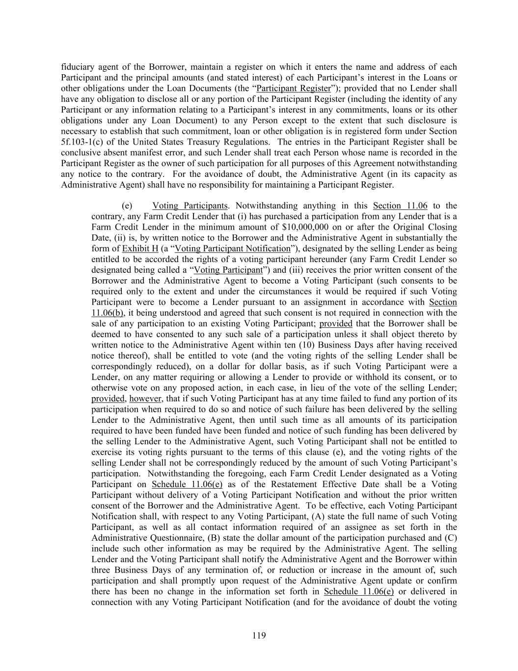119 fiduciary agent of the Borrower, maintain a register on which it enters the name and address of each Participant and the principal amounts (and stated interest) of each Participant’s interest in the Loans or other obligations under the Loan Documents (the “Participant Register”); provided that no Lender shall have any obligation to disclose all or any portion of the Participant Register (including the identity of any Participant or any information relating to a Participant’s interest in any commitments, loans or its other obligations under any Loan Document) to any Person except to the extent that such disclosure is necessary to establish that such commitment, loan or other obligation is in registered form under Section 5f.103-1(c) of the United States Treasury Regulations. The entries in the Participant Register shall be conclusive absent manifest error, and such Lender shall treat each Person whose name is recorded in the Participant Register as the owner of such participation for all purposes of this Agreement notwithstanding any notice to the contrary. For the avoidance of doubt, the Administrative Agent (in its capacity as Administrative Agent) shall have no responsibility for maintaining a Participant Register. (e) Voting Participants. Notwithstanding anything in this Section 11.06 to the contrary, any Farm Credit Lender that (i) has purchased a participation from any Lender that is a Farm Credit Lender in the minimum amount of $10,000,000 on or after the Original Closing Date, (ii) is, by written notice to the Borrower and the Administrative Agent in substantially the form of Exhibit H (a “Voting Participant Notification”), designated by the selling Lender as being entitled to be accorded the rights of a voting participant hereunder (any Farm Credit Lender so designated being called a “Voting Participant”) and (iii) receives the prior written consent of the Borrower and the Administrative Agent to become a Voting Participant (such consents to be required only to the extent and under the circumstances it would be required if such Voting Participant were to become a Lender pursuant to an assignment in accordance with Section 11.06(b), it being understood and agreed that such consent is not required in connection with the sale of any participation to an existing Voting Participant; provided that the Borrower shall be deemed to have consented to any such sale of a participation unless it shall object thereto by written notice to the Administrative Agent within ten (10) Business Days after having received notice thereof), shall be entitled to vote (and the voting rights of the selling Lender shall be correspondingly reduced), on a dollar for dollar basis, as if such Voting Participant were a Lender, on any matter requiring or allowing a Lender to provide or withhold its consent, or to otherwise vote on any proposed action, in each case, in lieu of the vote of the selling Lender; provided, however, that if such Voting Participant has at any time failed to fund any portion of its participation when required to do so and notice of such failure has been delivered by the selling Lender to the Administrative Agent, then until such time as all amounts of its participation required to have been funded have been funded and notice of such funding has been delivered by the selling Lender to the Administrative Agent, such Voting Participant shall not be entitled to exercise its voting rights pursuant to the terms of this clause (e), and the voting rights of the selling Lender shall not be correspondingly reduced by the amount of such Voting Participant’s participation. Notwithstanding the foregoing, each Farm Credit Lender designated as a Voting Participant on Schedule 11.06(e) as of the Restatement Effective Date shall be a Voting Participant without delivery of a Voting Participant Notification and without the prior written consent of the Borrower and the Administrative Agent. To be effective, each Voting Participant Notification shall, with respect to any Voting Participant, (A) state the full name of such Voting Participant, as well as all contact information required of an assignee as set forth in the Administrative Questionnaire, (B) state the dollar amount of the participation purchased and (C) include such other information as may be required by the Administrative Agent. The selling Lender and the Voting Participant shall notify the Administrative Agent and the Borrower within three Business Days of any termination of, or reduction or increase in the amount of, such participation and shall promptly upon request of the Administrative Agent update or confirm there has been no change in the information set forth in Schedule 11.06(e) or delivered in connection with any Voting Participant Notification (and for the avoidance of doubt the voting