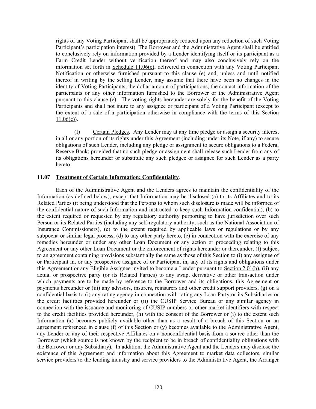 120 rights of any Voting Participant shall be appropriately reduced upon any reduction of such Voting Participant’s participation interest). The Borrower and the Administrative Agent shall be entitled to conclusively rely on information provided by a Lender identifying itself or its participant as a Farm Credit Lender without verification thereof and may also conclusively rely on the information set forth in Schedule 11.06(e), delivered in connection with any Voting Participant Notification or otherwise furnished pursuant to this clause (e) and, unless and until notified thereof in writing by the selling Lender, may assume that there have been no changes in the identity of Voting Participants, the dollar amount of participations, the contact information of the participants or any other information furnished to the Borrower or the Administrative Agent pursuant to this clause (e). The voting rights hereunder are solely for the benefit of the Voting Participants and shall not inure to any assignee or participant of a Voting Participant (except to the extent of a sale of a participation otherwise in compliance with the terms of this Section 11.06(e)). (f) Certain Pledges. Any Lender may at any time pledge or assign a security interest in all or any portion of its rights under this Agreement (including under its Note, if any) to secure obligations of such Lender, including any pledge or assignment to secure obligations to a Federal Reserve Bank; provided that no such pledge or assignment shall release such Lender from any of its obligations hereunder or substitute any such pledgee or assignee for such Lender as a party hereto. 11.07 Treatment of Certain Information; Confidentiality. Each of the Administrative Agent and the Lenders agrees to maintain the confidentiality of the Information (as defined below), except that Information may be disclosed (a) to its Affiliates and to its Related Parties (it being understood that the Persons to whom such disclosure is made will be informed of the confidential nature of such Information and instructed to keep such Information confidential), (b) to the extent required or requested by any regulatory authority purporting to have jurisdiction over such Person or its Related Parties (including any self-regulatory authority, such as the National Association of Insurance Commissioners), (c) to the extent required by applicable laws or regulations or by any subpoena or similar legal process, (d) to any other party hereto, (e) in connection with the exercise of any remedies hereunder or under any other Loan Document or any action or proceeding relating to this Agreement or any other Loan Document or the enforcement of rights hereunder or thereunder, (f) subject to an agreement containing provisions substantially the same as those of this Section to (i) any assignee of or Participant in, or any prospective assignee of or Participant in, any of its rights and obligations under this Agreement or any Eligible Assignee invited to become a Lender pursuant to Section 2.01(b), (ii) any actual or prospective party (or its Related Parties) to any swap, derivative or other transaction under which payments are to be made by reference to the Borrower and its obligations, this Agreement or payments hereunder or (iii) any advisors, insurers, reinsurers and other credit support providers, (g) on a confidential basis to (i) any rating agency in connection with rating any Loan Party or its Subsidiaries or the credit facilities provided hereunder or (ii) the CUSIP Service Bureau or any similar agency in connection with the issuance and monitoring of CUSIP numbers or other market identifiers with respect to the credit facilities provided hereunder, (h) with the consent of the Borrower or (i) to the extent such Information (x) becomes publicly available other than as a result of a breach of this Section or an agreement referenced in clause (f) of this Section or (y) becomes available to the Administrative Agent, any Lender or any of their respective Affiliates on a nonconfidential basis from a source other than the Borrower (which source is not known by the recipient to be in breach of confidentiality obligations with the Borrower or any Subsidiary). In addition, the Administrative Agent and the Lenders may disclose the existence of this Agreement and information about this Agreement to market data collectors, similar service providers to the lending industry and service providers to the Administrative Agent, the Arranger